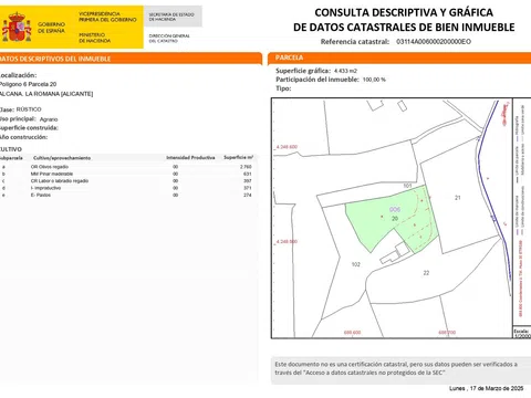 Wij presenteren u dit prachtige stuk grond, gelegen op slechts 6 kilometer van La Romana, ideaal voor het gebruik dat u wenst. Met een oppervlakte van 4.433 m² beschikt deze kavel over irrigatiewater, wat het perfect maakt voor agrarisch gebruik. De mogelijkheden eindigen echter niet daar. Met gemakkelijke toegang en gelegen in een gebied van constante groei, bevindt dit terrein zich op een strategische locatie die het mogelijk maakt een breed scala aan projecten te ontwikkelen. Mis deze uitstekende investeringsmogelijkheid niet. Maak uw project werkelijkheid op een terrein met groot potentieel!