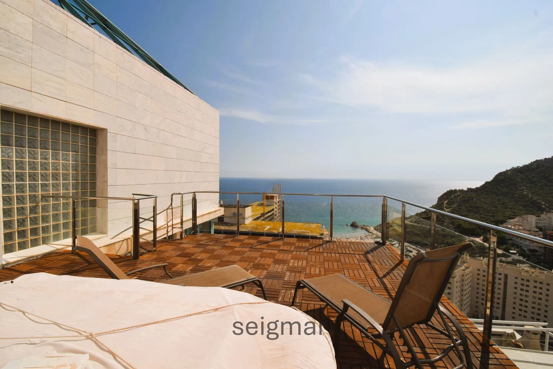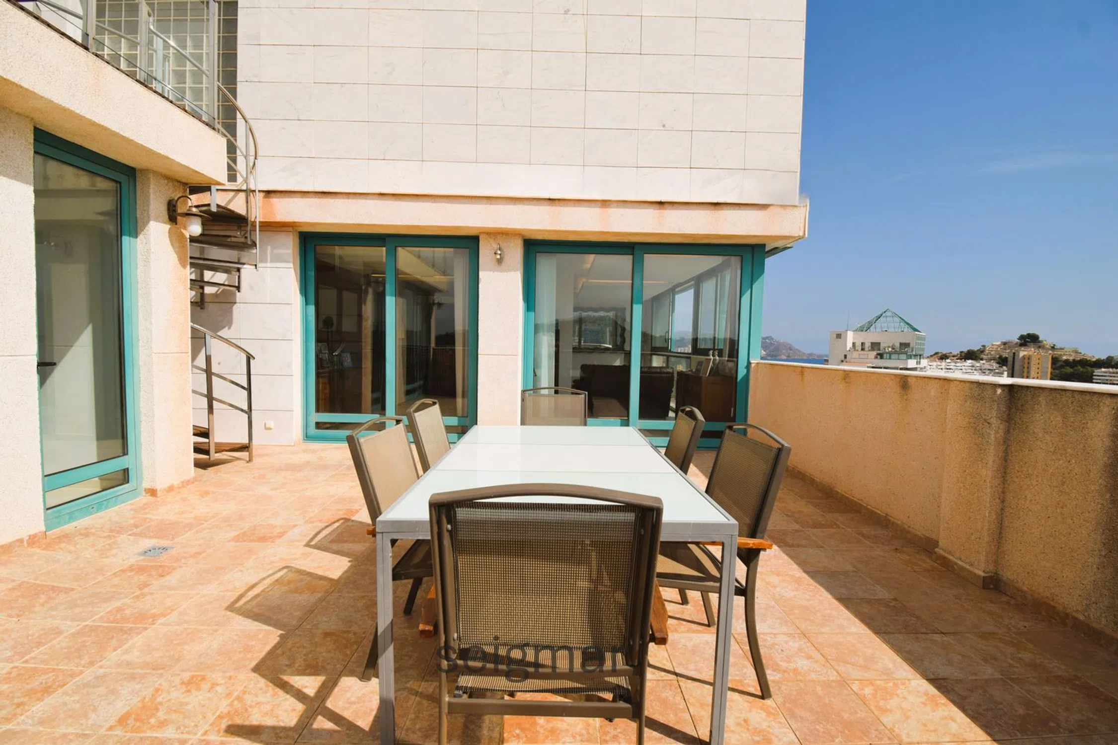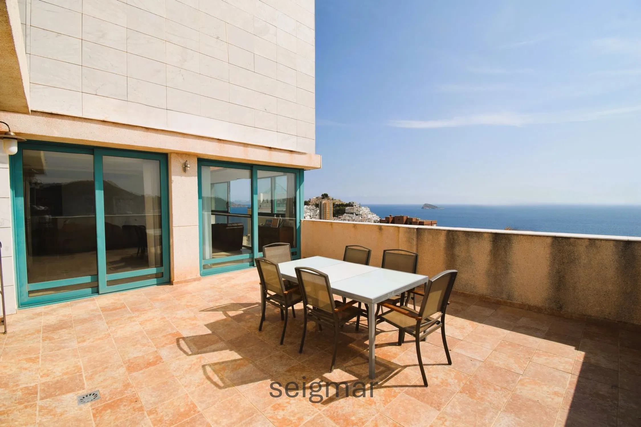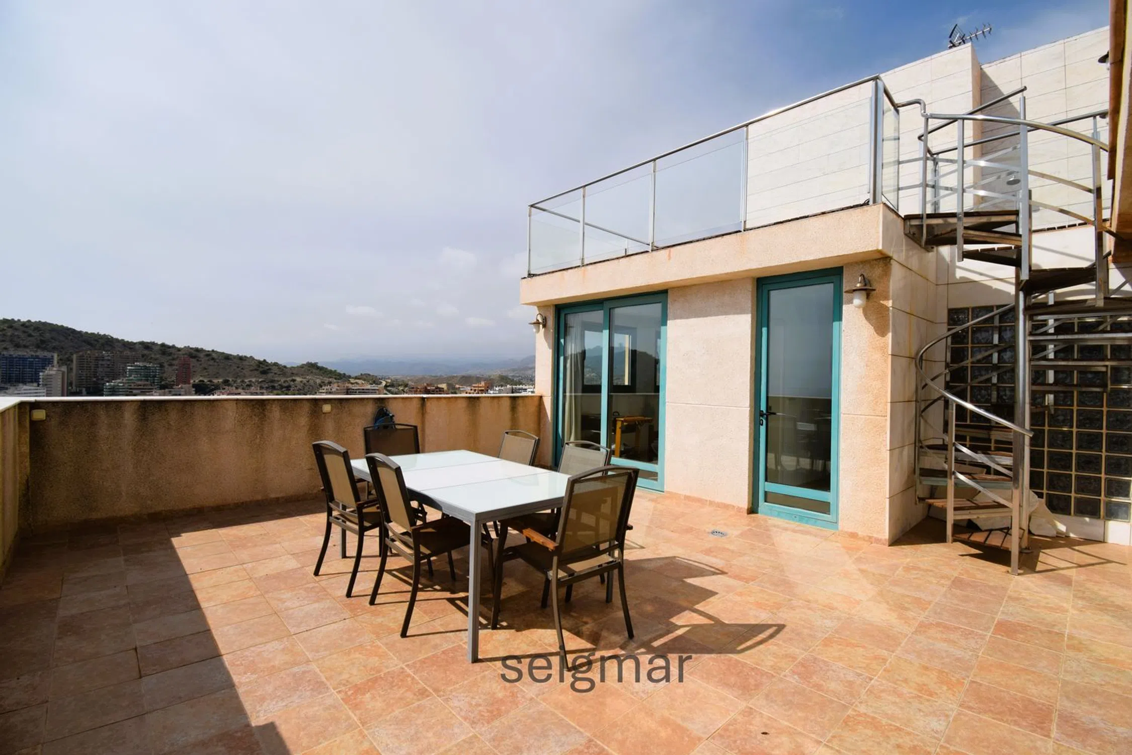 GRAN ÁTICO DUPLEX CON VISTAS A ESCASOS METROS DE LA PLAYA La gran altura en la que se encuentra esta imponente vivienda le permite tener unas vistas privilegiadas al Mediterráneo, a la bahía de Benidorm y a la impresionante montaña que rodea toda la comarca incluyendo la verde colina donde se sitúa la histórica Torre del Aguiló junto a la Cala de Finestrat. Un lugar tranquilo y privilegiado por su cercanía a Benidorm con todos los servicios cercanos con la bonita playa de Finestrat a 2 minutos andando. La urbanización tiene jardines, zona infantil y una gran piscina, además, el edificio tiene impactante ascensor panorámico. El duplex cuenta con dos plantas donde en la principal nos recibe un cómodo vestíbulo donde se puede acceder a la cocina semindependiente con galería, luminoso salón con una terraza abierta inmensa, un dormitorio con una estancia que podría usarse como quinto dormitorio, vestidor o despacho y, un aseo de cortesía con ducha aparte. En la segunda planta, frontales al mar hay dos dormitorios dobles con ventanales excepcionales por su gran altura que también disfruta estas estancias. También hay un baño completo y, por último, la habitación principal con vestidor, espacioso baño y otra extensa terraza con jacuzzi comunicada por una bonita escalera de caracol con que se encuentra en la planta inferior. Tiene comodidades como persianas motorizadas, aire acondicionado en todas la estancias, parking subterráneo y trastero. Si su prioridad son las vistas, cercanía a la playa y buena comunicación... está es su vivienda.