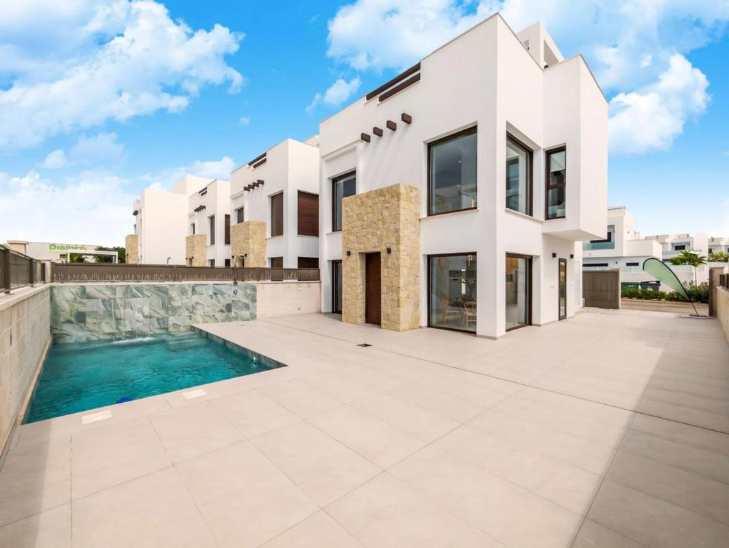 Os presento una Villa Moderna Nueva, ubicada en la Herrada, Costa Blanca. Es una ciudad costera situada en la Costa Blanca. Es una zona turística, destaca por su multitud de playas, su clima soleado. La villa ofrece 116m2 de superficie construida. Tiene un un amplio salón comedor moderno junto con la cocina de tipo americana equipada con nuevos muebles y electrodomésticos. Toda la villa tiene ventanales grandes, que permite entrar mucha luz natural e iluminar todo la vivienda. Tiene una enorme terraza luminosa de 52m2 y solárium, para disfrutar del sol y de las preciosas vistas. Tiene un precioso jardín privado junto con la piscina, perfecto para disfrutar de los calurosos veranos en la Costa Blanca. Además dispone de plaza de parking. También hay sótanos disponibles con un coste adicional. La Villa se encuentra en un complejo cerrado, ofreciendo un entorno seguro y privado. La zona ofrece un entorno natural de playas y campos de golf. Cerca de la laguna y los ocios de Torrevieja y con fácil acceso a la autopista A7 para llegar al aeropuerto de Alicante en 20 min. Permite fácil acceso a todo tipo de servicios y puntos de interés: Supermercados, tiendas, bares y restaurantes, centro comercial. La Herrada destaca por destino tranquilo, con buenas playas, buen clima y una vida relajada. Ideal para quien busca tranquilidad sin estar alejado de los servicios. Es un lugar tranquilo tanto para residencia permanente como para inversión.