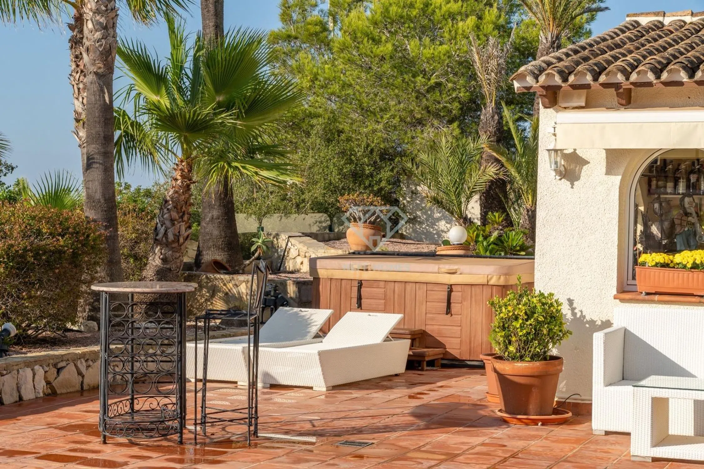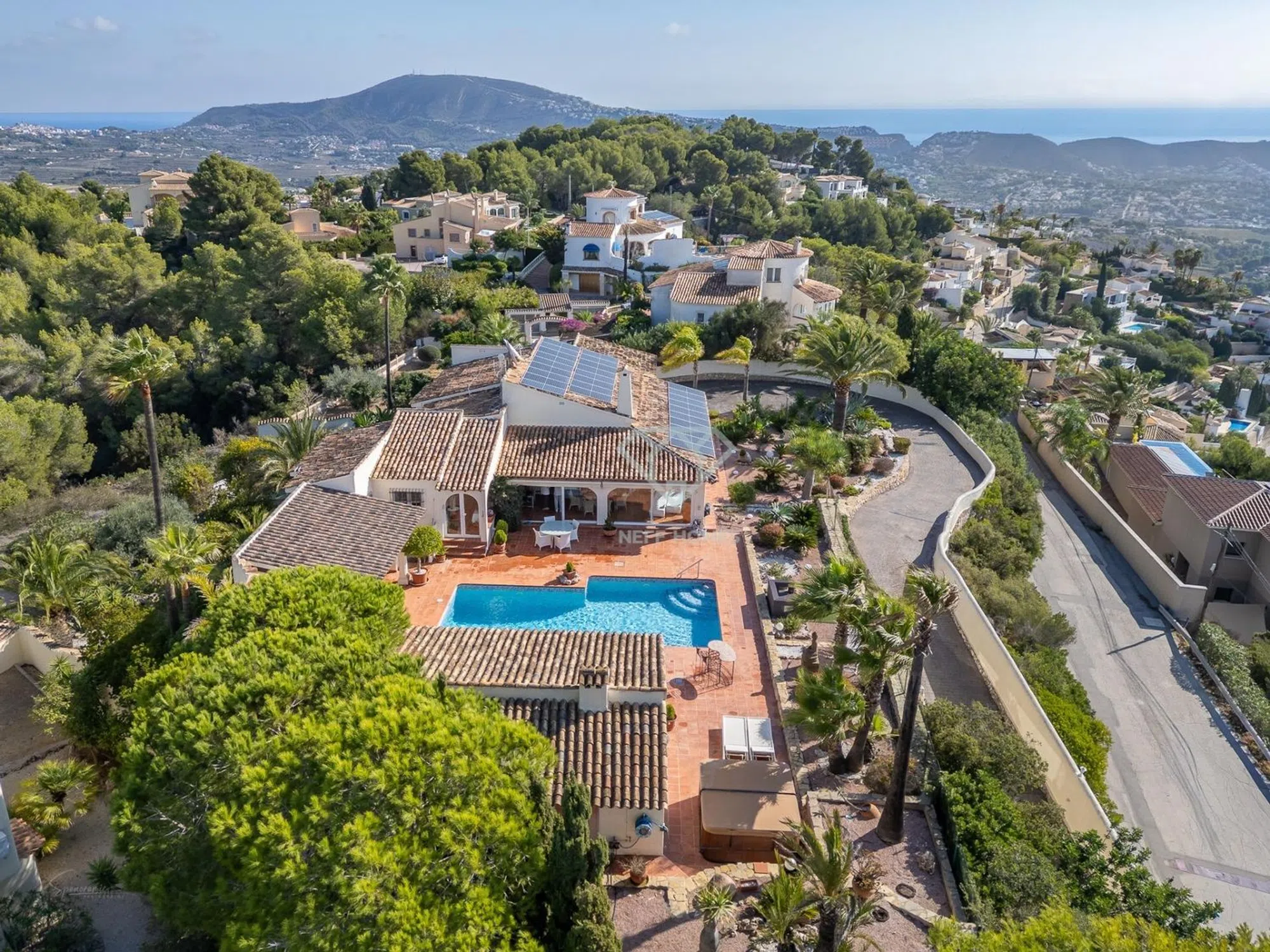 Disfruta del auténtico estilo de vida mediterráneo en esta impresionante villa de lujo situada en la codiciada zona de Benimeit, Moraira. Una propiedad única que combina elegancia, confort y privacidad, con vistas abiertas de 360º al mar, la montaña y el valle, a tan solo 10 minutos en coche de Moraira, Calpe y Benissa. Características principales: - Parcela de 2.000m2 ajardinada con árboles frutales y entorno perfectamente cuidado. - Superficie construida: 225 m² en planta principal + 73 m² de porche acristalado + 56 m² de apartamento independiente + 74 m² de garaje. - Estilo mediterráneo con materiales de alta calidad y todas las comodidades modernas. Distribución principal: La planta principal se distribuye en un amplio hall de entrada, salón-comedor con chimenea y acceso directo a una cocina totalmente equipada, que incluye lavandería y despensa. Cuenta con tres dormitorios, dos de ellos comparten un baño completo y el principal dispone de baño en suite con bañera de hidromasaje, ducha y vestidor, además de un aseo de cortesía. El porche acristalado de 73 m², accesible desde el salón y la cocina, ofrece un espacio luminoso y confortable durante todo el año. Zona exterior: El exterior invita al relax con una piscina climatizada de 10 x 5 metros, una terraza cubierta de 20 m², jacuzzi y una espectacular zona de barbacoa acristalada de 48 m² que incluye comedor, cocina, sauna y ducha. También dispone de aseo de cortesía exterior, ideal para disfrutar de los días al aire libre sin renunciar a la comodidad. Apartamento independiente: En la planta baja se encuentra un apartamento independiente de 56 m², con amplio dormitorio/estudio, cocina-comedor y baño completo. Perfecto para invitados o como alojamiento adicional. Garaje y comodidades adicionales: La vivienda cuenta con un garaje cerrado de 74 m² y está equipada con: -Aire acondicionado por splits -Calefacción central -27 placas solares. Sistema fotovoltaico de 10 kW con 15 kW de almacenamiento -Riego automático Una joya mediterránea con vistas infinitas: Esta propiedad es perfecta para quienes buscan privacidad, lujo y naturaleza, sin renunciar a la cercanía de las playas, restaurantes y servicios de la Costa Blanca. Una vivienda que ofrece luz, espacio y bienestar en cada rincón.