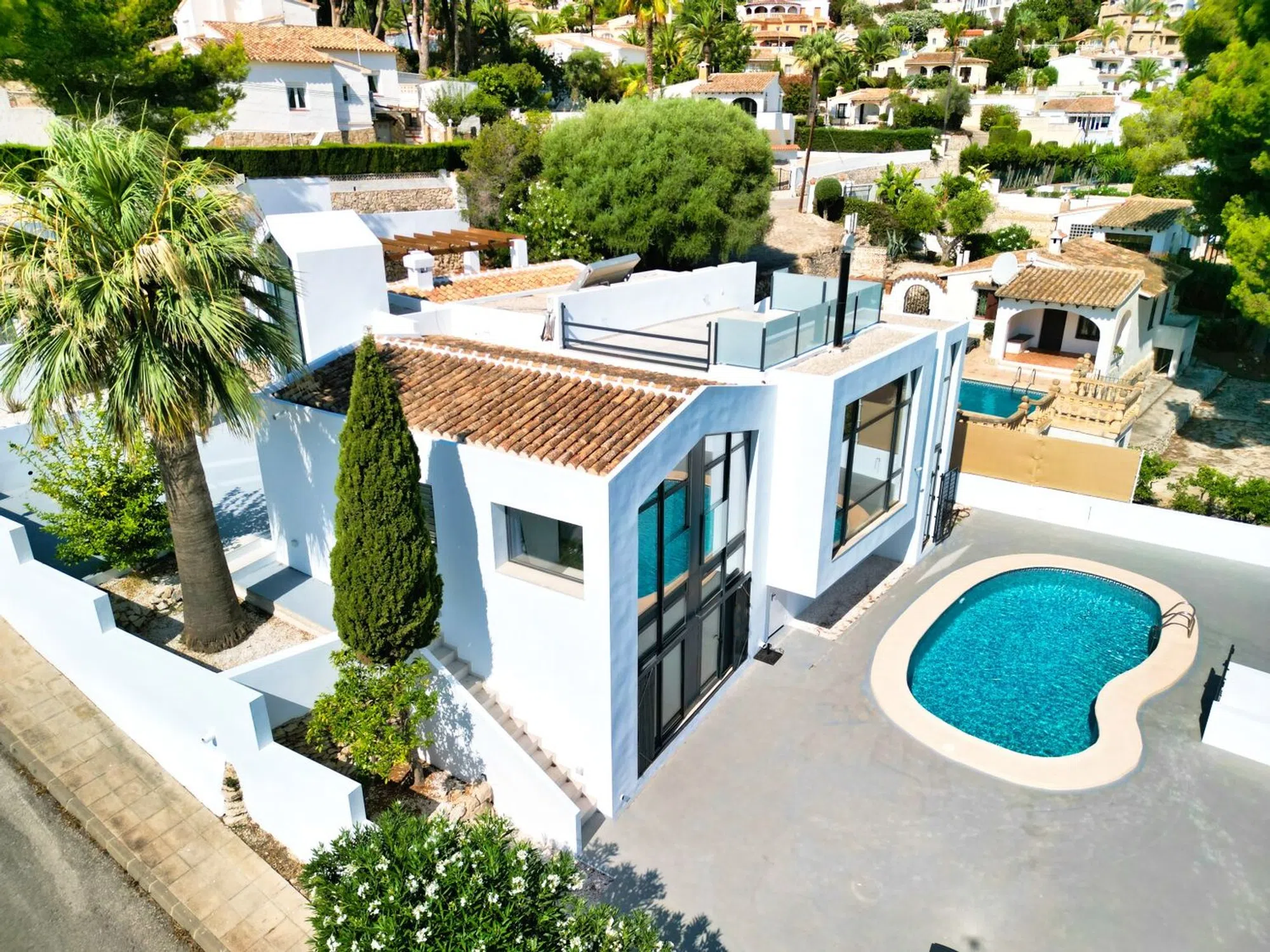 Esta impresionante villa en la prestigiosa zona de Moraira ofrece una mezcla única de lujo, confort y potencial de inversión. Con su impresionante arquitectura y diseño bien pensado, esta propiedad es ideal para aquellos que buscan una residencia permanente, una casa de vacaciones, o una propiedad de alquiler rentable. La casa principal, con una superficie construida de 175,89 m², cuenta con tres amplios dormitorios y tres modernos cuartos de baño. Cuenta con un generoso salón perfecto para relajarse y entretenerse, una cocina-comedor contemporánea equipada con electrodomésticos de alta calidad, y un estudio dedicado que es ideal para el trabajo a distancia o una oficina en casa. El apartamento de invitados de abajo, con una superficie construida de 45,20 m², proporciona un espacio de vida acogedor y privado. Incluye un dormitorio, un cuarto de baño, una cómoda sala de estar y un práctico pasillo que facilita el acceso a todas las zonas. En la azotea de la villa hay un solárium perfecto para tomar el sol y disfrutar de las vistas panorámicas. La propiedad también incluye aparcamiento en la calle y una cochera para dos coches con una puerta eléctrica para mayor seguridad. Una piscina privada sirve como un oasis personal para la relajación y el ocio. La villa está equipada con aire acondicionado para el confort durante todo el año y un sistema de agua caliente solar que mejora la eficiencia energética. Además, cuenta con una licencia de alquiler turístico, lo que la convierte en una excelente oportunidad de inversión para generar ingresos por alquiler. La combinación de lujo y practicidad de esta villa, junto con su licencia oficial de alquiler turístico, asegura un alto retorno de la inversión. Tanto si desea vivir en el corazón de Moraira como aprovechar el floreciente mercado de alquiler, esta propiedad ofrece un potencial inigualable. No pierda la oportunidad de poseer esta exquisita villa en Moraira, un paraíso de elegancia y confort con importantes perspectivas de inversión. Póngase en contacto con nosotros hoy para programar una visita y experimentar el encanto y la sofisticación de esta notable propiedad. La planta semisótano, de 25,91 m², consta de un dormitorio y un baño, y ofrece un espacio adicional que aumenta la versatilidad de la propiedad.