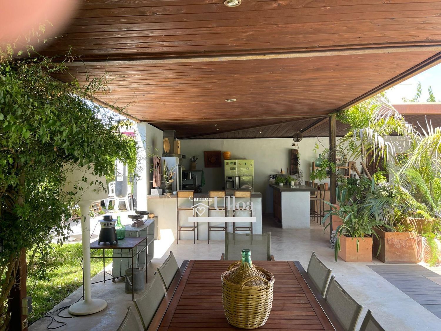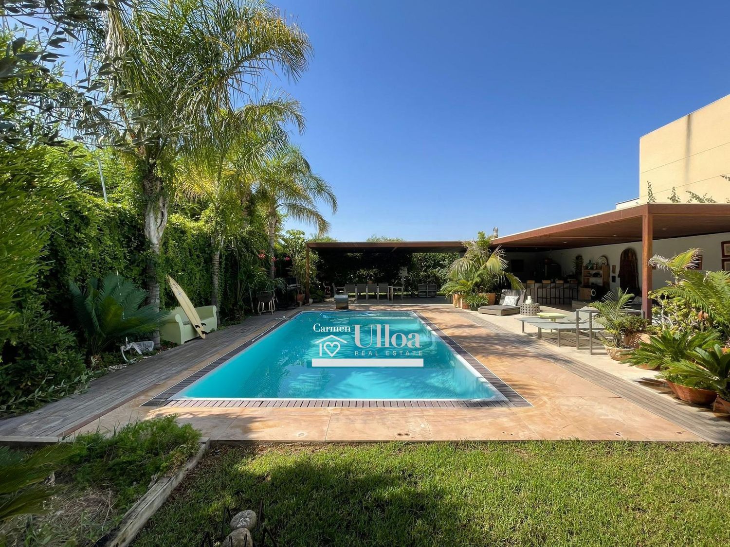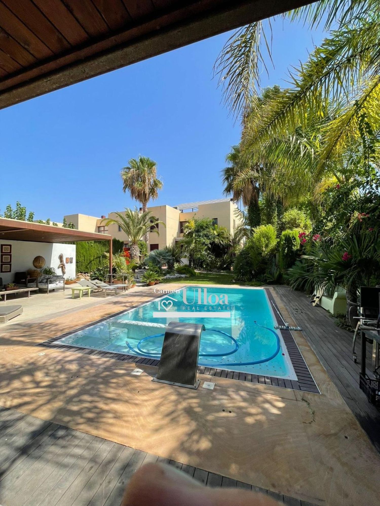 Al cruzar la entrada, se quedará cautivado por la belleza del jardín privado que rodea la propiedad, que culmina en una espléndida piscina con chorros. El diseño meticuloso del jardín tropical agrega un toque exótico a este refugio, invitando a disfrutar de momentos al aire libre.