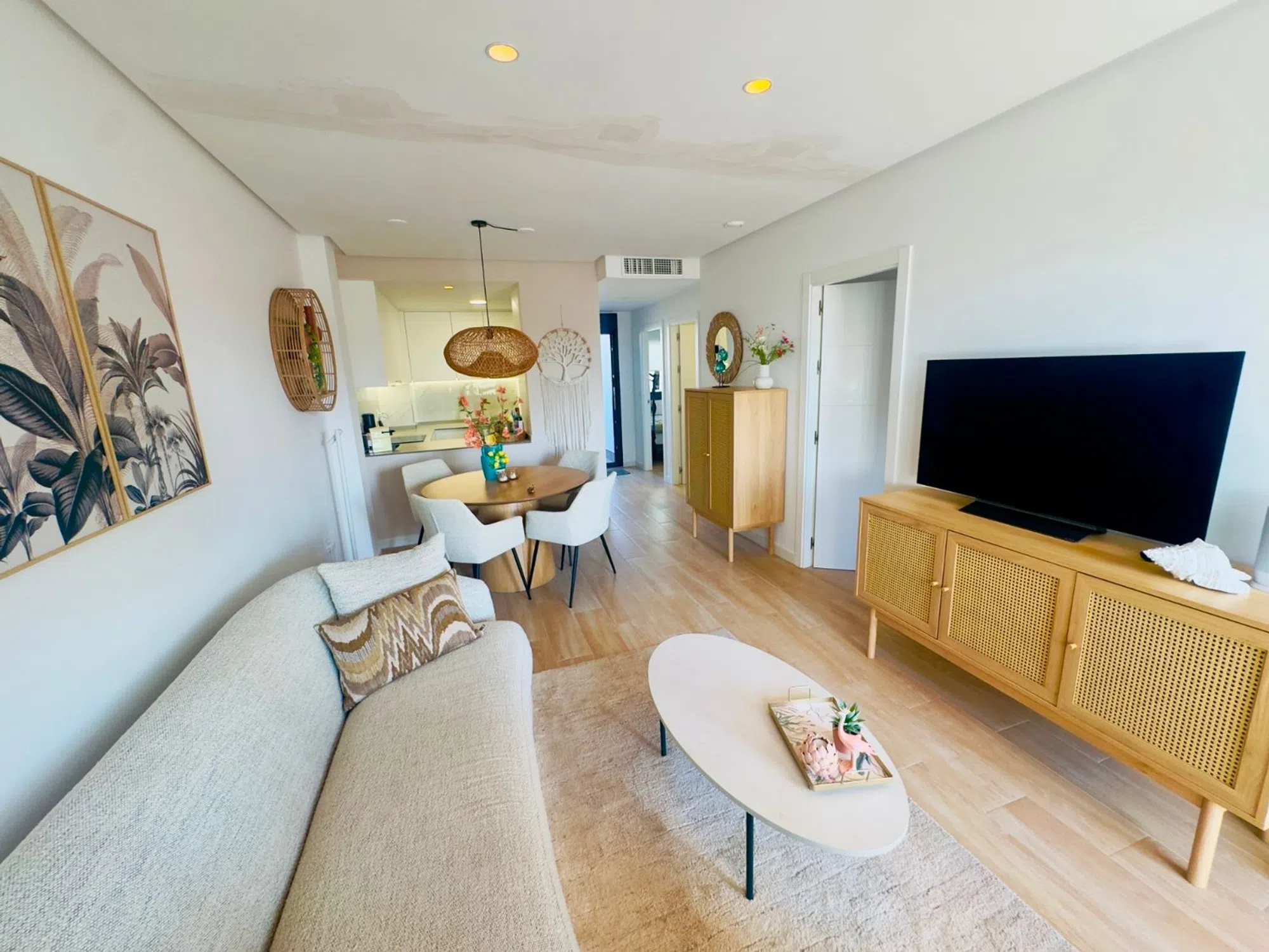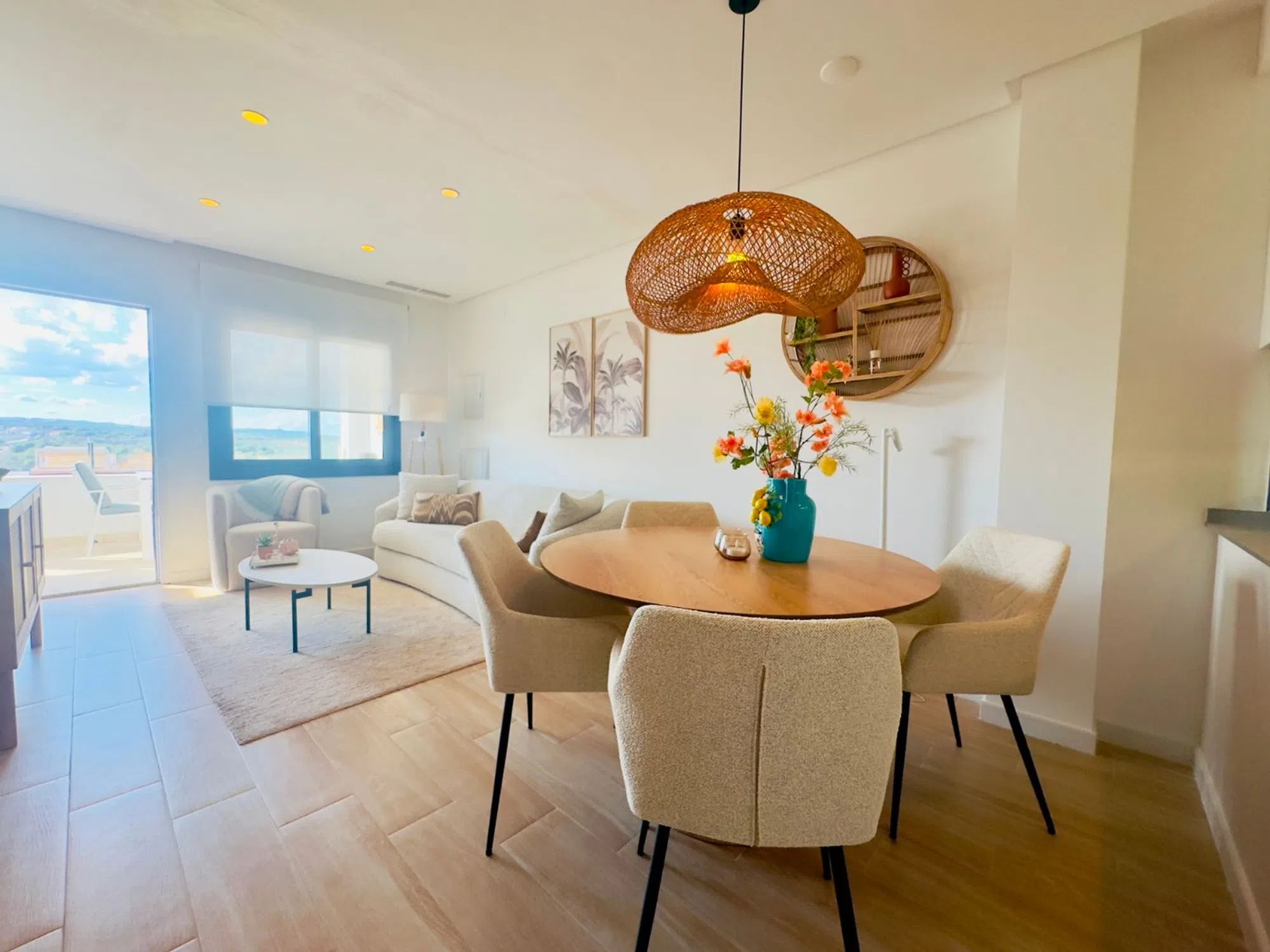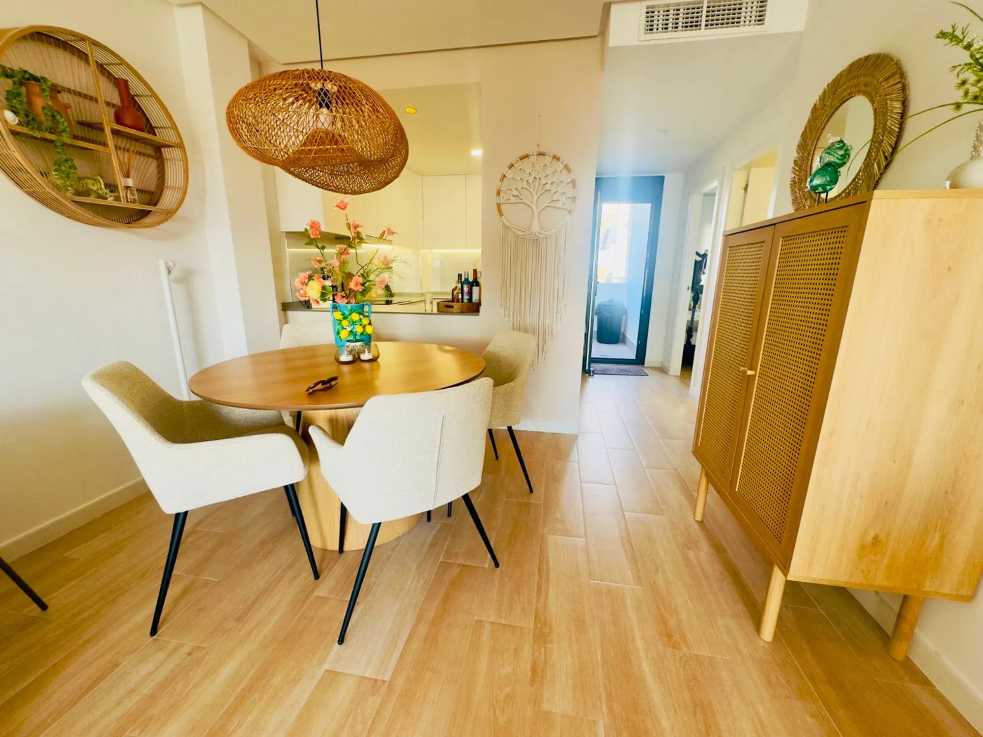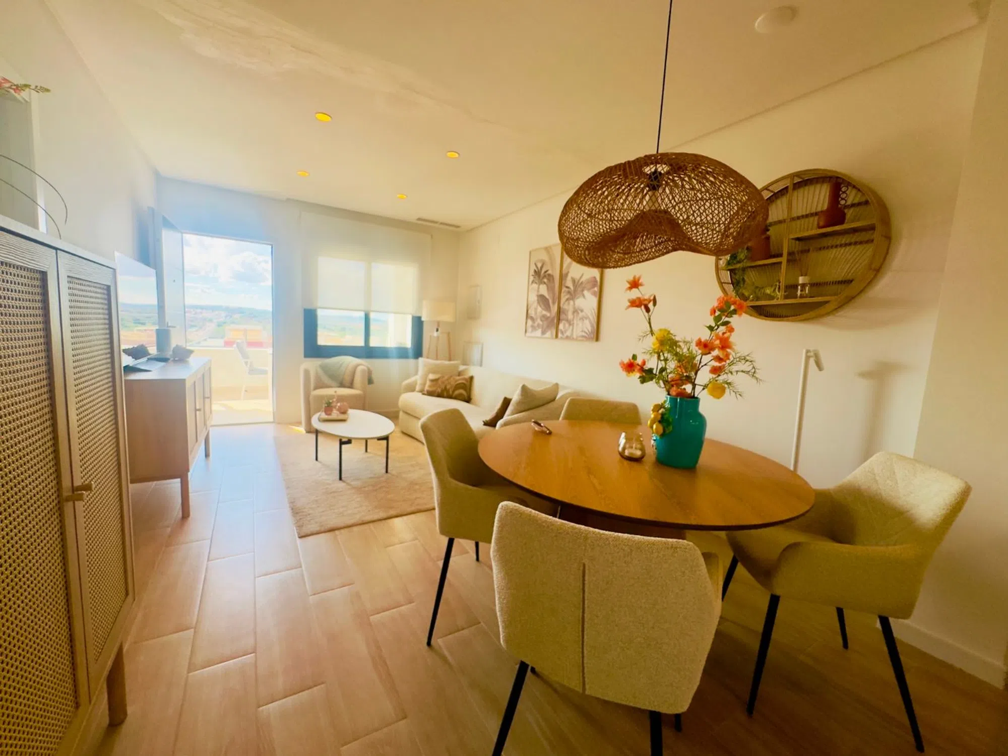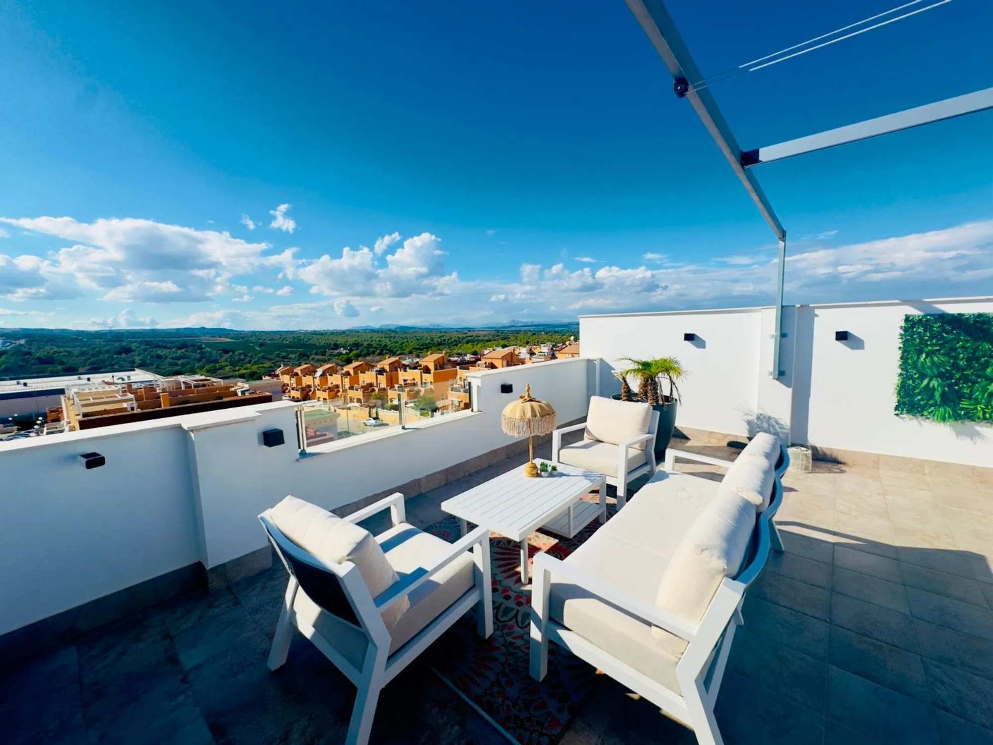 Elegante Ático de 2 Dormitorios con Gran Solárium Privado y Vistas Abiertas al Oeste Este atractivo ático ofrece una combinación perfecta de diseño moderno, comodidad y ubicación privilegiada en la deseada zona de Orihuela Costa. Ubicado dentro de una comunidad bien cuidada y segura, esta propiedad se presenta como una excelente opción tanto como residencia habitual, casa de vacaciones o inversión para alquiler vacacional. Con una superficie construida de 78 m², el apartamento cuenta con dos amplios dormitorios y dos baños completos, uno de ellos en suite dentro del dormitorio principal. Todos los espacios están cuidadosamente amueblados y decorados con un estilo contemporáneo y acogedor, listo para entrar a vivir desde el primer día. La distribución abierta del salón, comedor y cocina crea un ambiente amplio y luminoso, ideal para relajarse o disfrutar de momentos en familia. La cocina está totalmente equipada y se integra perfectamente con la zona social del hogar. El confort está garantizado durante todo el año gracias al sistema de aire acondicionado instalado en todas las estancias. Además, la orientación oeste del inmueble permite disfrutar de espectaculares puestas de sol desde las terrazas privadas. Uno de los grandes atractivos de esta vivienda es su impresionante solárium privado de 78 m², un espacio ideal para disfrutar del clima mediterráneo. Este espacio al aire libre cuenta con ducha exterior, zona de almacenamiento y mucho espacio para crear un área de descanso, comedor al aire libre o incluso un rincón chill-out. La propiedad incluye también una plaza de aparcamiento privada dentro del recinto de la comunidad. Entre las zonas comunes se puede disfrutar de una gran piscina comunitaria rodeada de áreas verdes, un gimnasio bien equipado, zona de trabajo compartida y hasta una mesa de ping-pong para los momentos de ocio. La ubicación es inmejorable: a solo unos minutos a pie de bares, cafeterías y restaurantes; a tan solo 5 minutos andando del supermercado Aldi, y a 3 minutos en coche de las playas de Punta Prima. Todo lo que necesitas está al alcance de la mano, sin renunciar a la tranquilidad y privacidad que ofrece la vivienda. Una propiedad única que combina estilo, funcionalidad y ubicación. Perfecta para quienes buscan calidad de vida en la Costa Blanca.