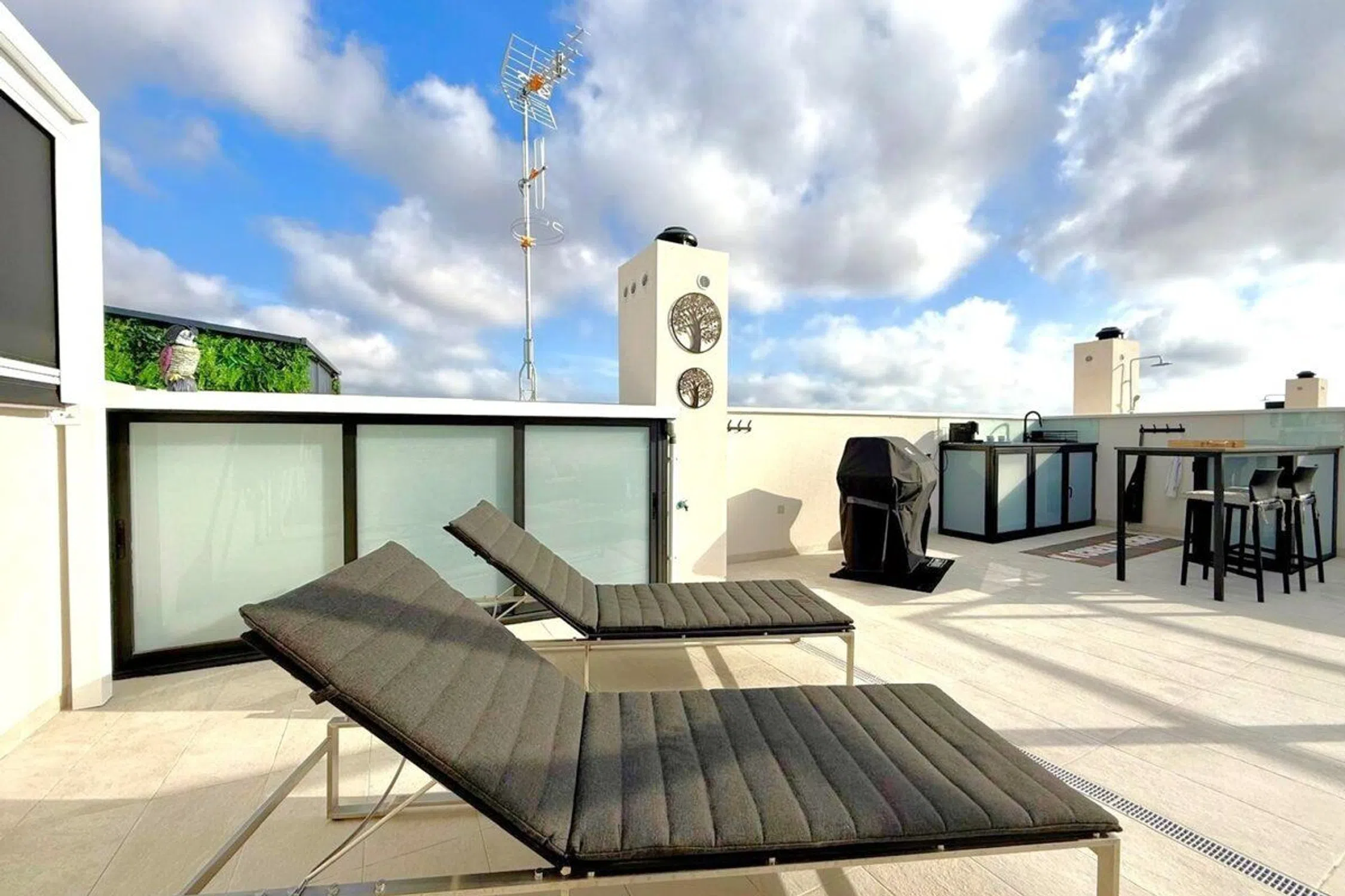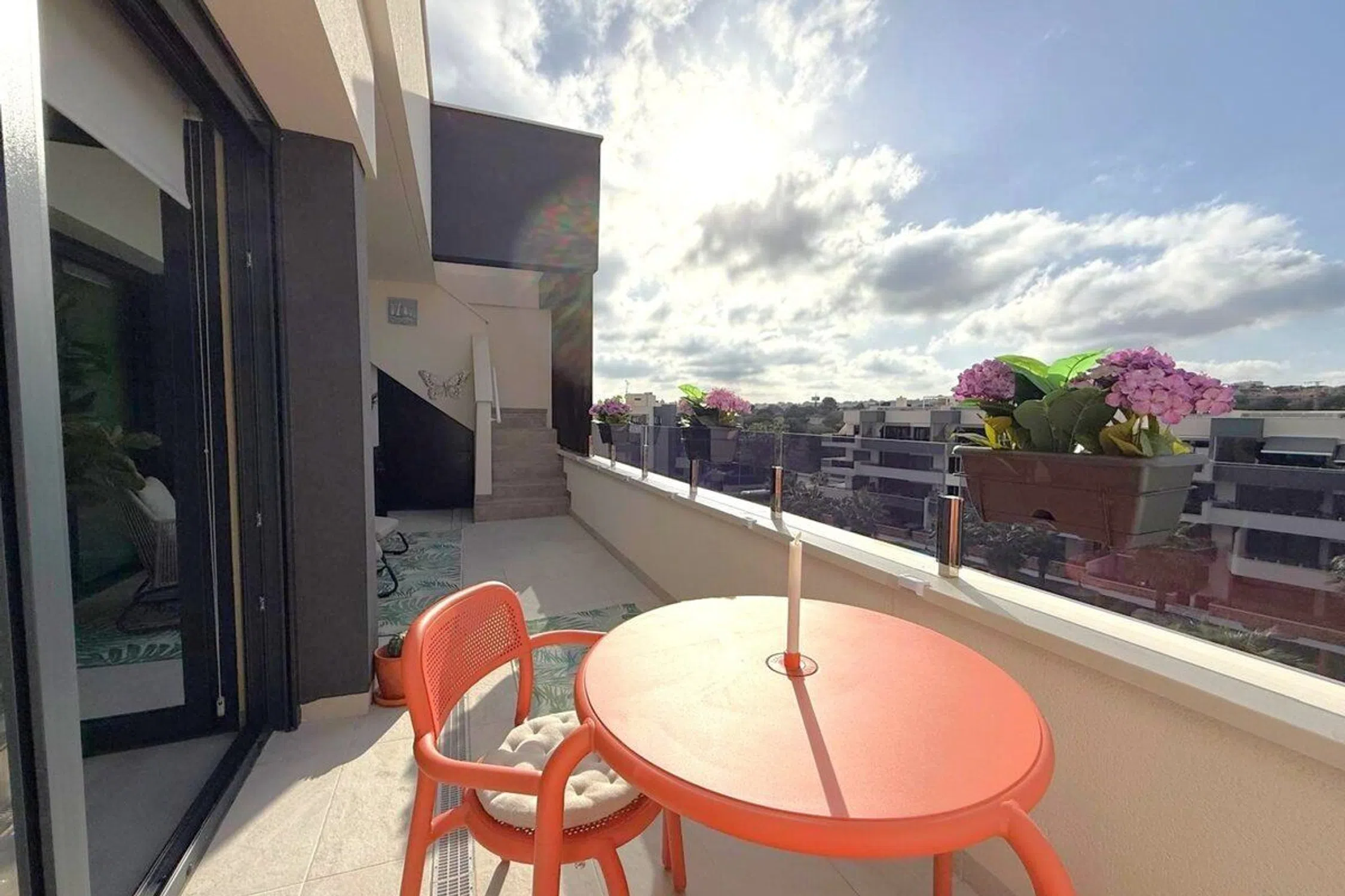 Ático de reciente construcción en venta con una enorme terraza en la azotea en Los Altos – Orihuela Costa. Este ático se encuentra en el tercer y último piso de un edificio con ascensor. Cuenta con un hall de entrada, dos dormitorios (uno en suite) y dos baños con calefacción por suelo radiante. Un luminoso salón con zona de comedor y una cocina integrada con barra americana. La cocina está equipada con horno, microondas, frigorífico-congelador, lavavajillas, lavadora y vitrocerámica y placa Teka. También se incluyen ventanas de PVC con persianas eléctricas y mando a distancia. Junto al salón se encuentra una terraza de 21m² orientada al oeste con un trastero, zonas de estar y solárium, y vistas a la piscina y al jardín comunitarios. Las escaleras desde esta terraza conducen a la enorme terraza de la azotea de 79m² con trastero, una cocina exterior, zonas de estar y solárium, y una pérgola con zona de comedor. Aire acondicionado central. El ático se vende completamente amueblado. Se incluye una plaza de aparcamiento subterráneo y un trastero. Un complejo seguro con una piscina comunitaria y una piscina para niños ubicada en un jardín bordeado de palmeras, áreas de descanso y una cancha de petanca. También hay disponible un gimnasio con sauna y jacuzzi. Todos los servicios están cerca, y varios centros comerciales, como el popular La Zenia Boulevard, también están cerca. Las playas de Orihuela Costa están a 5 km.