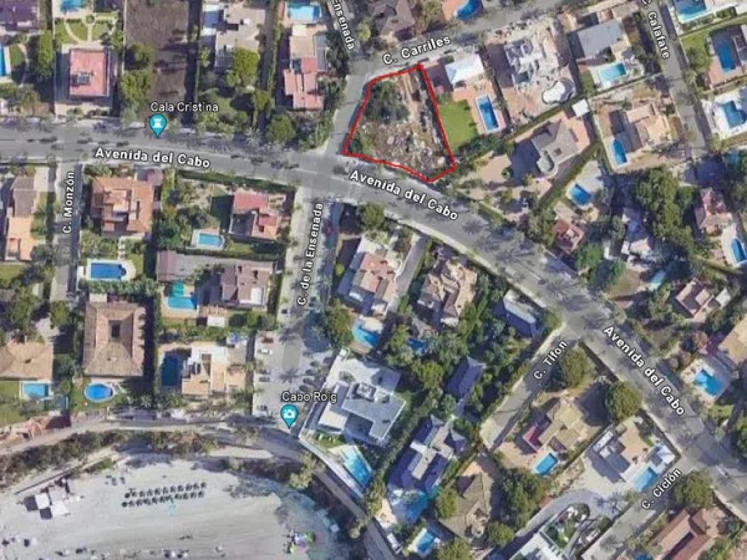 Te koop: bouwkavel in Cabo Roig, gelegen op de hoek van Calle del Cablo, Calle de la Ensenada en Calle Carriles. Gelegen in een woonwijk en op 100 m van het strand.