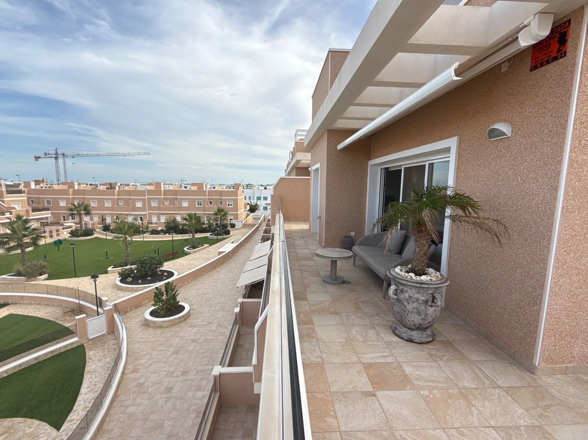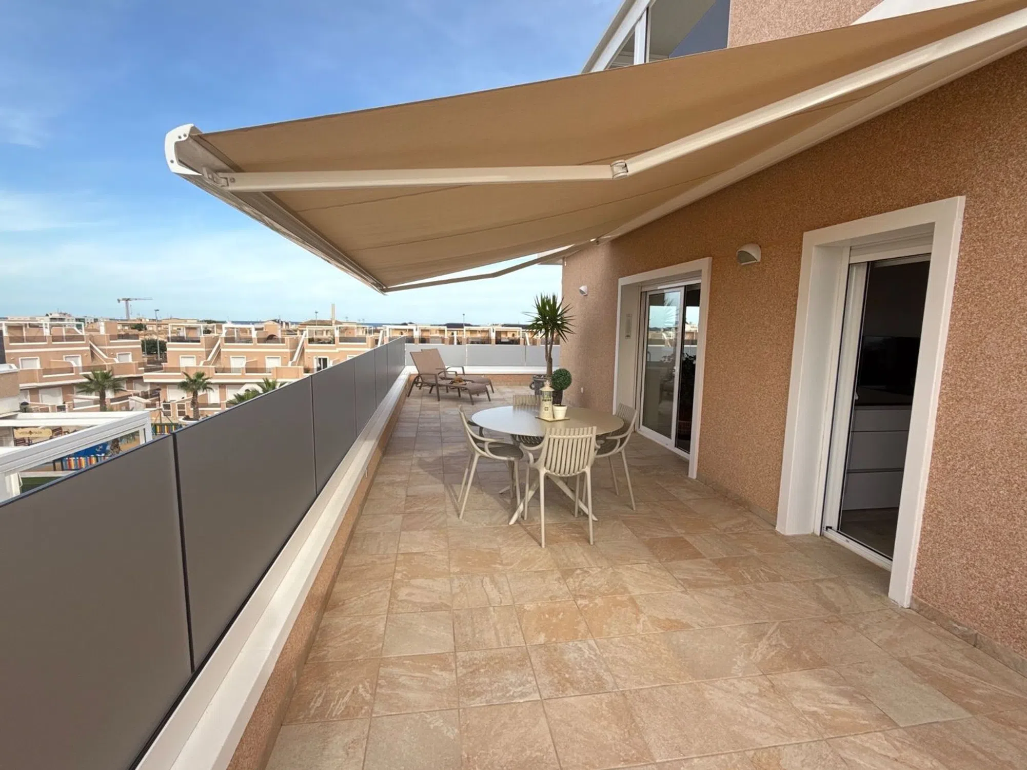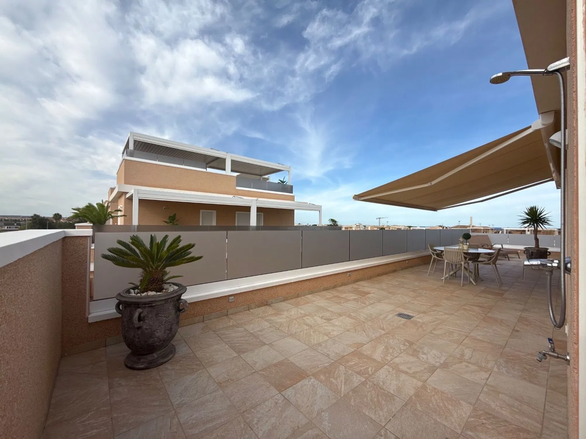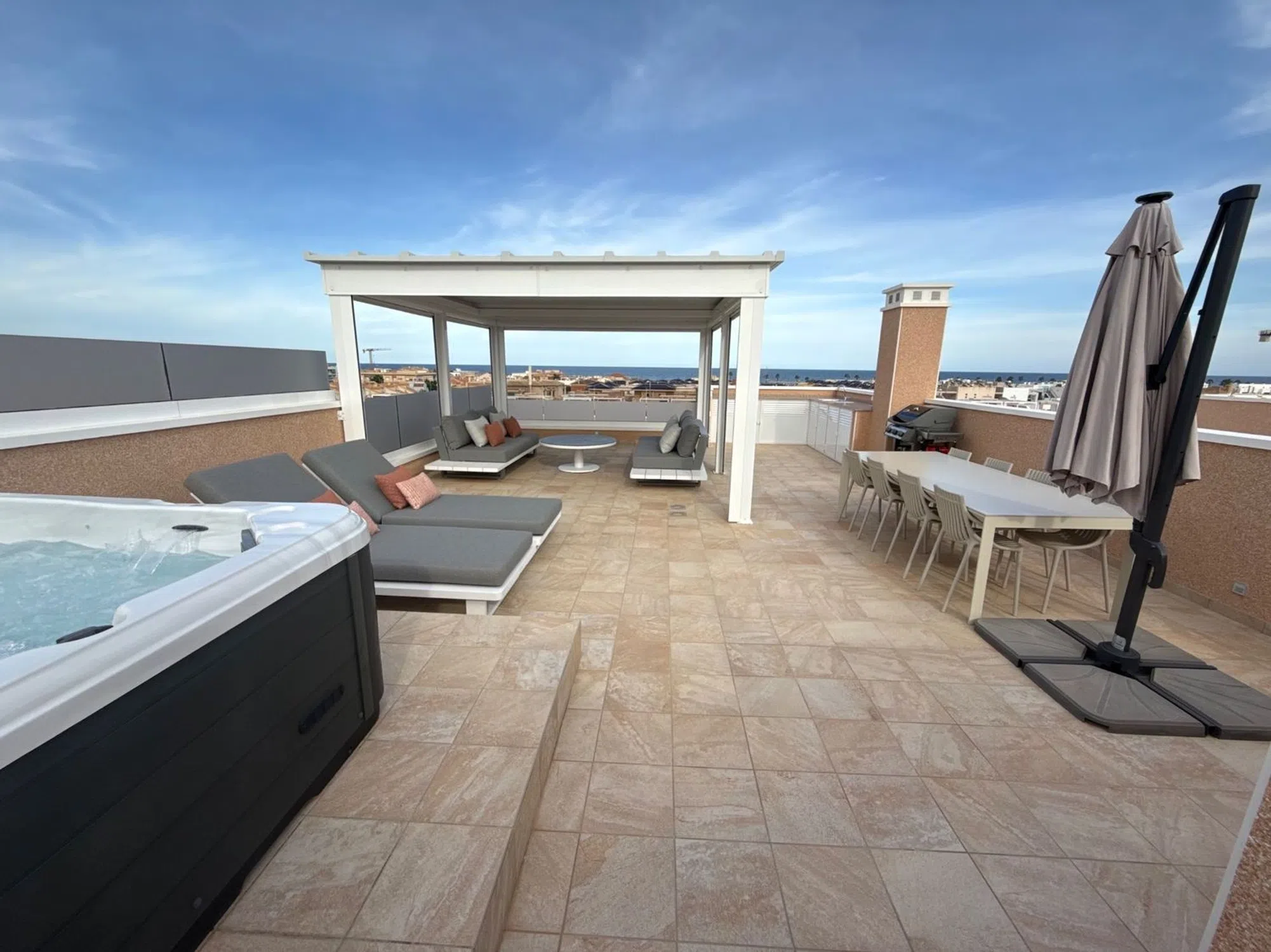 Situado en la posición más privilegiada en el corazón de la urbanización, este excepcional ático independiente ofrece impresionantes vistas que van desde el brillante mar Mediterráneo hasta los exuberantes jardines comunitarios, piscina, jacuzzi climatizado y parque infantil. Sin propiedades vecinas a ambos lados, esta casa es un hallazgo raro que ofrece verdadera privacidad, espacio y serenidad. Salga a la amplia terraza envolvente o suba a su solárium privado de 81 m² en la azotea, donde su estilo de vida realmente se despliega. Ya sea tomando su café matutino mientras el sol se levanta sobre el mar, o relajándose en su jacuzzi privado al atardecer con una copa de burbujas en la mano, este espacio le invita a vivir al aire libre con total comodidad. Con vistas abiertas en todas direcciones, el solárium se convierte en su salón personal, perfecto para recibir invitados, tomar el sol o simplemente disfrutar de la brisa costera. En el interior, el apartamento ha sido amueblado con buen gusto y acabados de primera calidad. La atención al detalle está presente en todas partes: desde la calefacción por suelo radiante en el salón, la cocina y los baños, hasta la iluminación ambiental regulable, las persianas eléctricas y el elegante diseño de ambientación. La cocina abierta es a la vez elegante y práctica, con encimeras de granito, electrodomésticos integrados de alta calidad y un sistema de filtrado de agua a presión de cal que proporciona agua potable limpia directamente del grifo. Un lavadero independiente añade comodidad, mientras que la iluminación exterior con sensores, los toldos eléctricos con sensores de viento y una pérgola con iluminación y laterales ajustables garantizan el confort en todas las estaciones. En el solárium encontrará una cocina exterior totalmente equipada, con fregadero, agua caliente, nevera y amplio espacio de almacenamiento, que le permitirá comer al aire libre sin esfuerzo. Las duchas exteriores de agua caliente, tanto en el piso de arriba como en el de abajo, contribuyen a la sensación de estar en un complejo turístico. La propiedad cuenta con aparcamiento subterráneo asignado, ascensor, y se encuentra en una comunidad cerrada segura con socorrista y seguridad en el lugar durante los meses de verano, que le da la paz de la mente cuando más importa. Si está buscando un refugio de vacaciones de lujo, un estilo de vida lock-up-and-leave, o una inversión de primera, este ático único ofrece la combinación perfecta de privacidad, calidad y belleza panorámica, donde cada día se siente como una escapada. [IW].