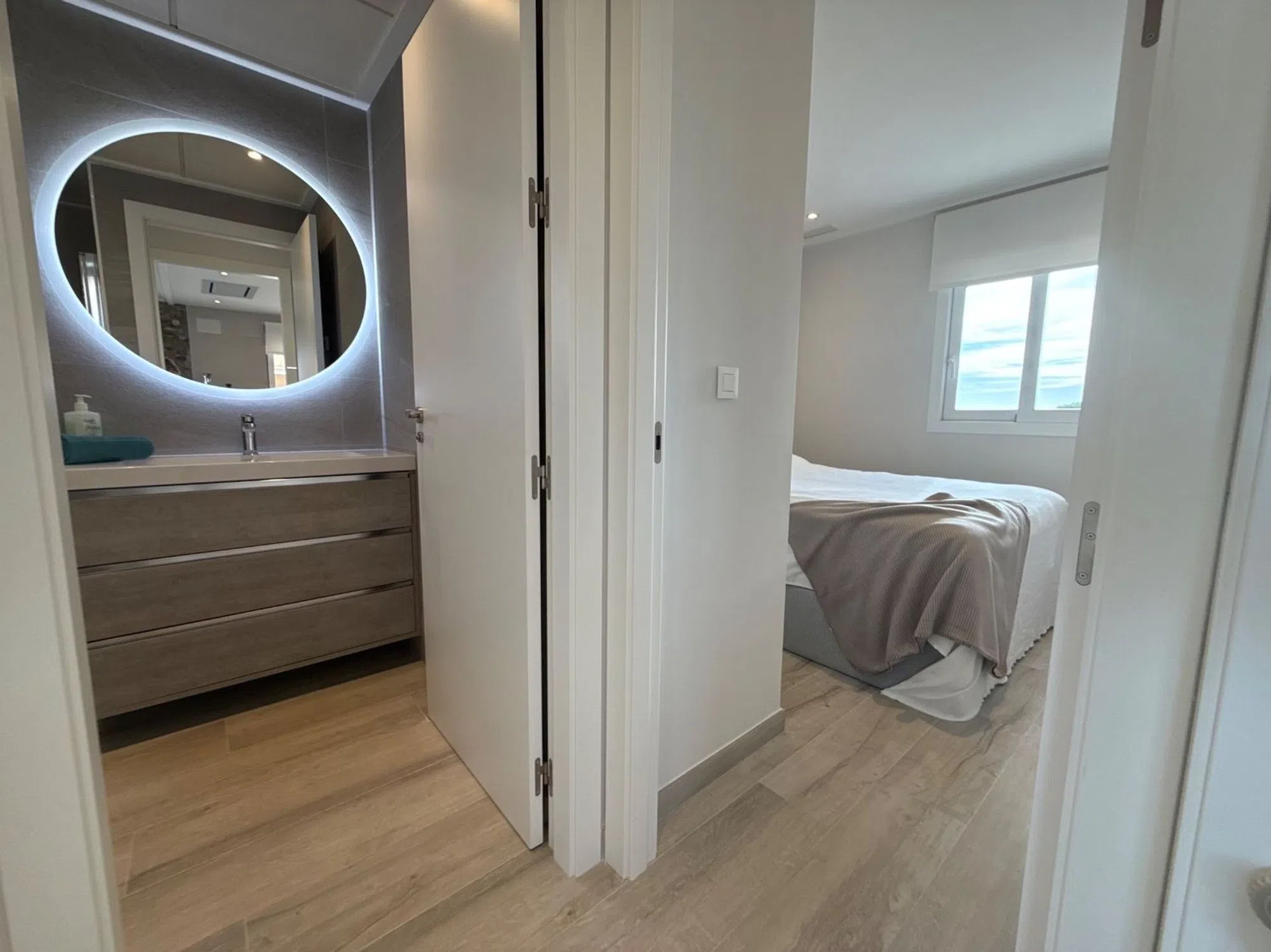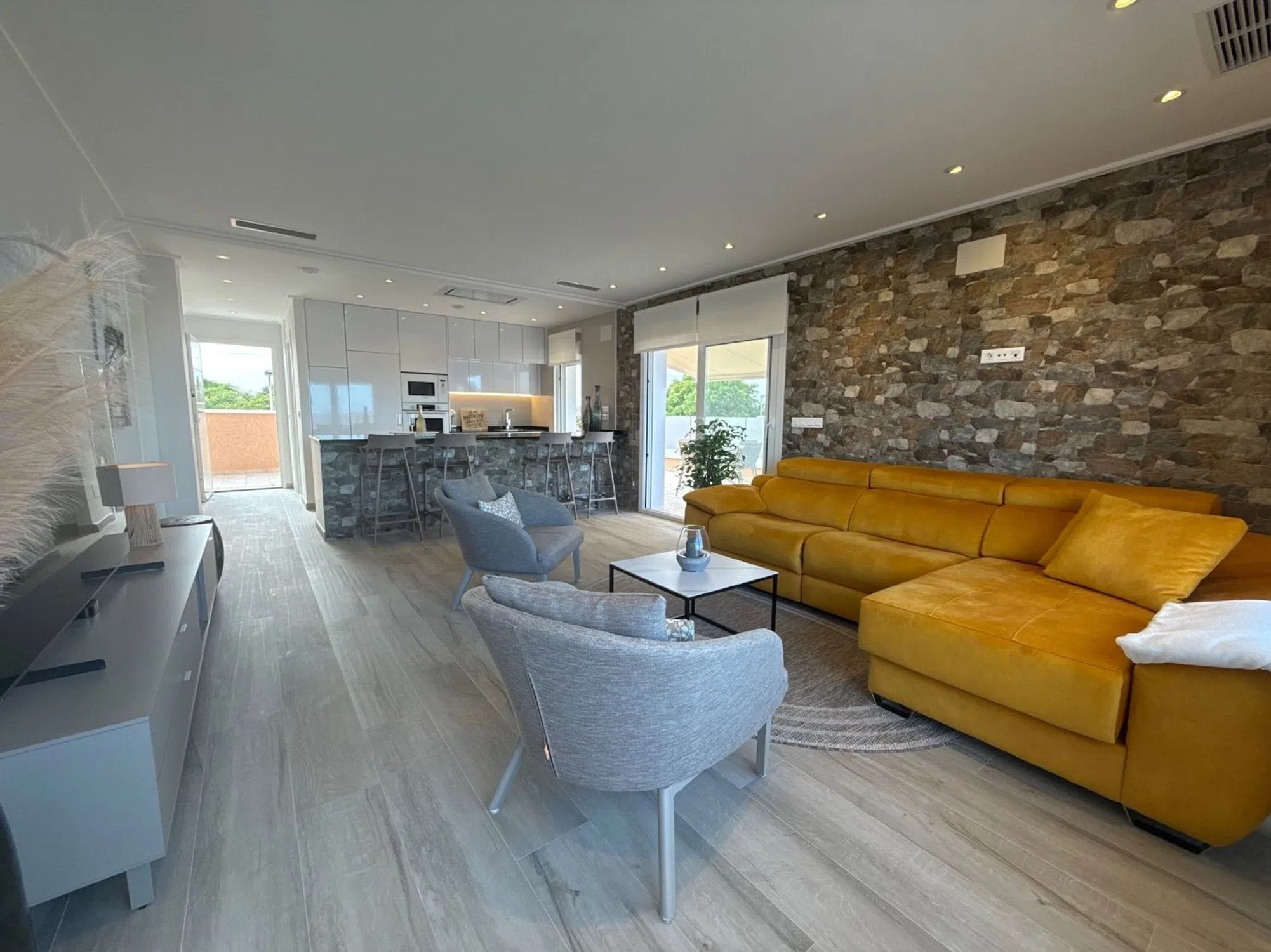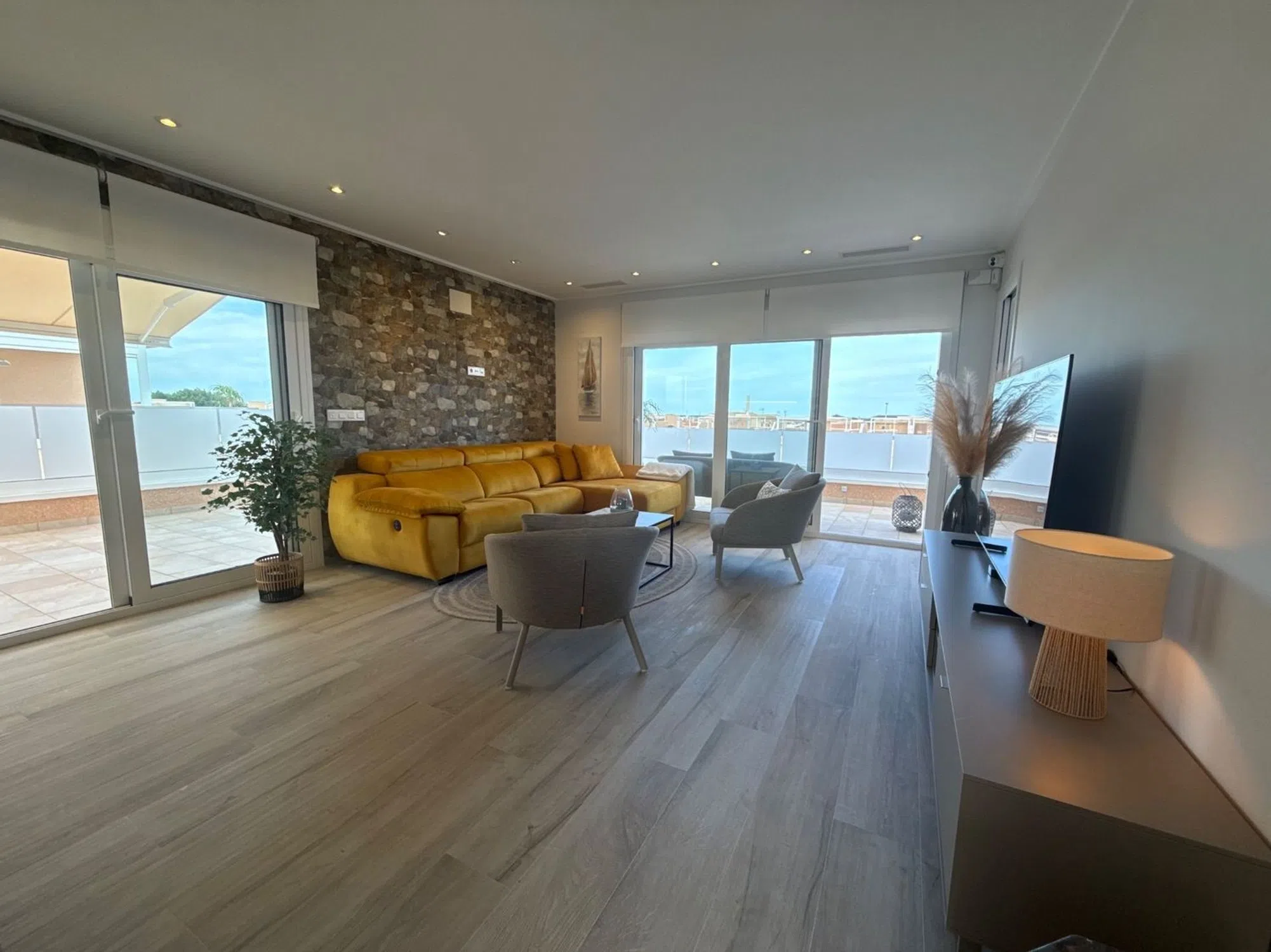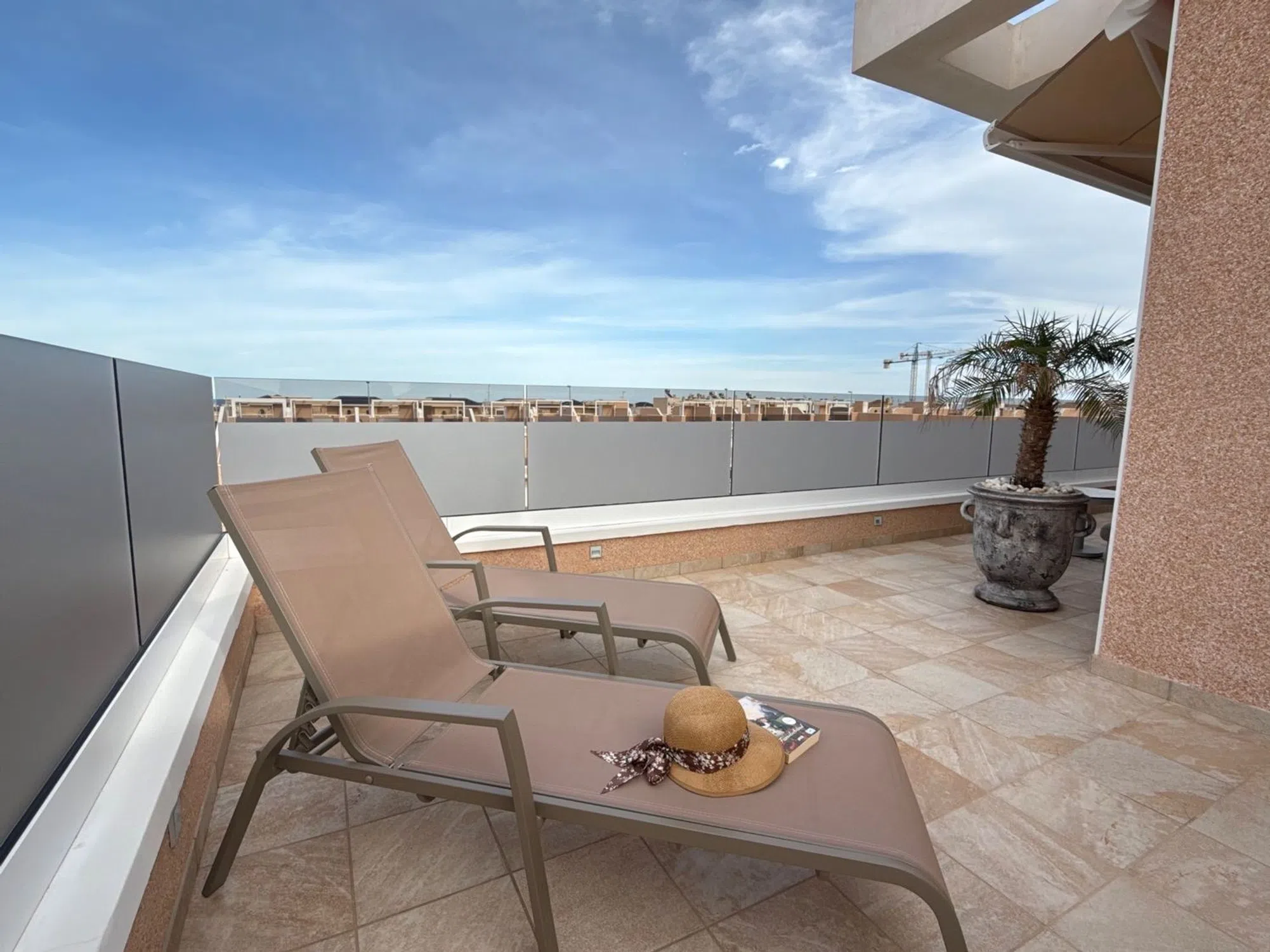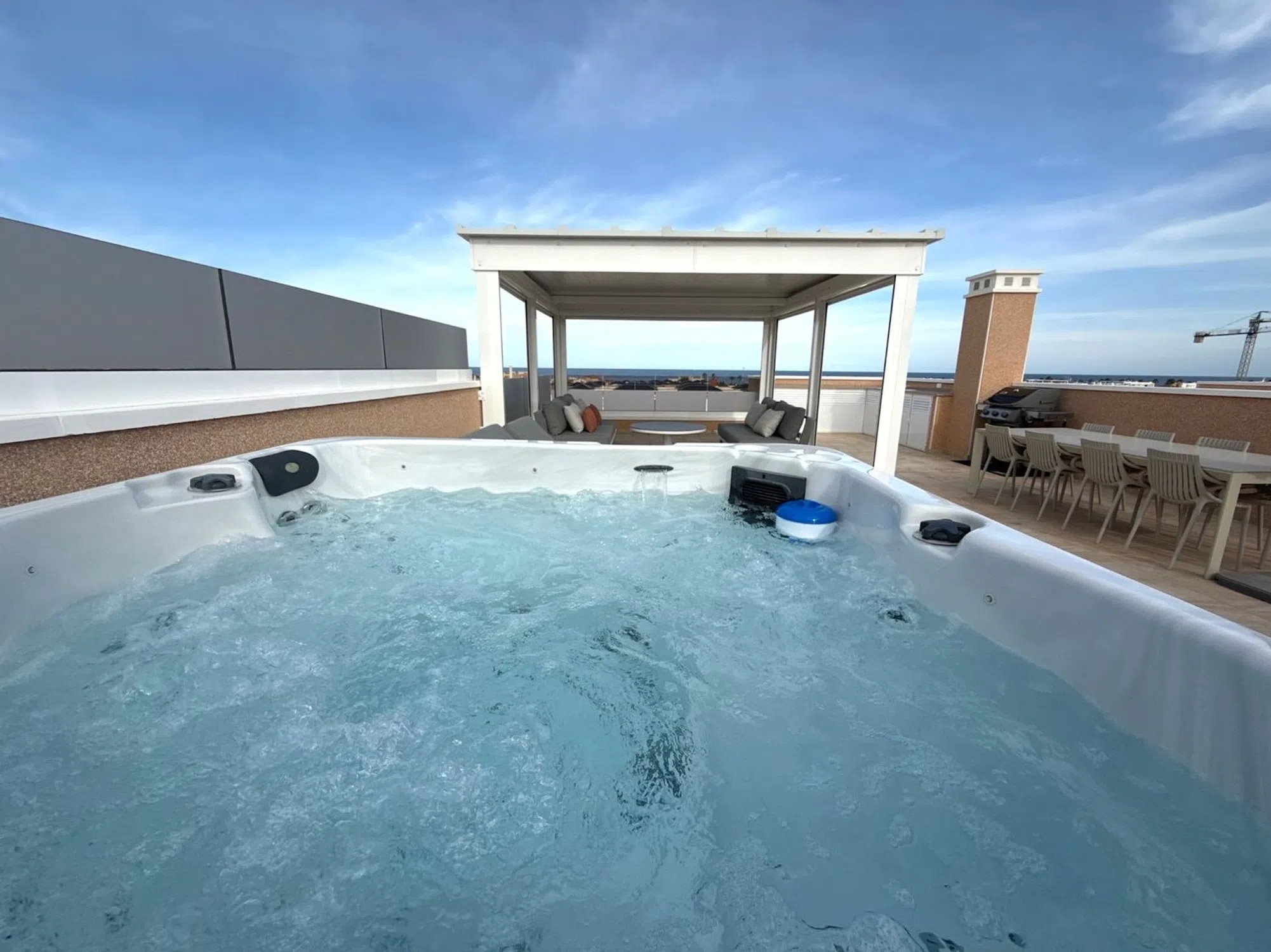 Situado en la posición más privilegiada en el corazón de la urbanización, este excepcional ático independiente ofrece impresionantes vistas que van desde el brillante mar Mediterráneo hasta los exuberantes jardines comunitarios, piscina, jacuzzi climatizado y parque infantil. Sin propiedades vecinas a ambos lados, esta casa es un hallazgo raro que ofrece verdadera privacidad, espacio y serenidad. Salga a la amplia terraza envolvente o suba a su solárium privado de 81 m² en la azotea, donde su estilo de vida realmente se despliega. Ya sea tomando su café matutino mientras el sol se levanta sobre el mar, o relajándose en su jacuzzi privado al atardecer con una copa de burbujas en la mano, este espacio le invita a vivir al aire libre con total comodidad. Con vistas abiertas en todas direcciones, el solárium se convierte en su salón personal, perfecto para recibir invitados, tomar el sol o simplemente disfrutar de la brisa costera. En el interior, el apartamento ha sido amueblado con buen gusto y acabados de primera calidad. La atención al detalle está presente en todas partes: desde la calefacción por suelo radiante en el salón, la cocina y los baños, hasta la iluminación ambiental regulable, las persianas eléctricas y el elegante diseño de ambientación. La cocina abierta es a la vez elegante y práctica, con encimeras de granito, electrodomésticos integrados de alta calidad y un sistema de filtrado de agua a presión de cal que proporciona agua potable limpia directamente del grifo. Un lavadero independiente añade comodidad, mientras que la iluminación exterior con sensores, los toldos eléctricos con sensores de viento y una pérgola con iluminación y laterales ajustables garantizan el confort en todas las estaciones. En el solárium encontrará una cocina exterior totalmente equipada, con fregadero, agua caliente, nevera y amplio espacio de almacenamiento, que le permitirá comer al aire libre sin esfuerzo. Las duchas exteriores de agua caliente, tanto en el piso de arriba como en el de abajo, contribuyen a la sensación de estar en un complejo turístico. La propiedad cuenta con aparcamiento subterráneo asignado, ascensor, y se encuentra en una comunidad cerrada segura con socorrista y seguridad en el lugar durante los meses de verano, que le da la paz de la mente cuando más importa. Si está buscando un refugio de vacaciones de lujo, un estilo de vida lock-up-and-leave, o una inversión de primera, este ático único ofrece la combinación perfecta de privacidad, calidad y belleza panorámica, donde cada día se siente como una escapada. [IW].