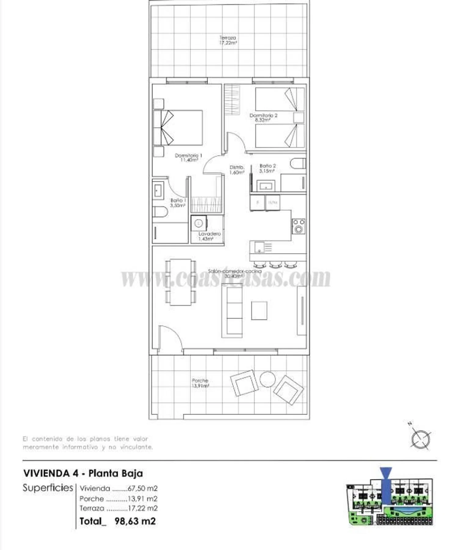 Appartement op de begane grond in Pilar De La Horadada, met 98 m² gebouwd, 67 m² bruikbaar, 2 slaapkamers, 2 badkamers, buiten, begane grond, 1 terras, 17 m² terras, uitgeruste keuken, berging, gemeubileerd, 2026, gemeenschappelijk zwembad, balkon.