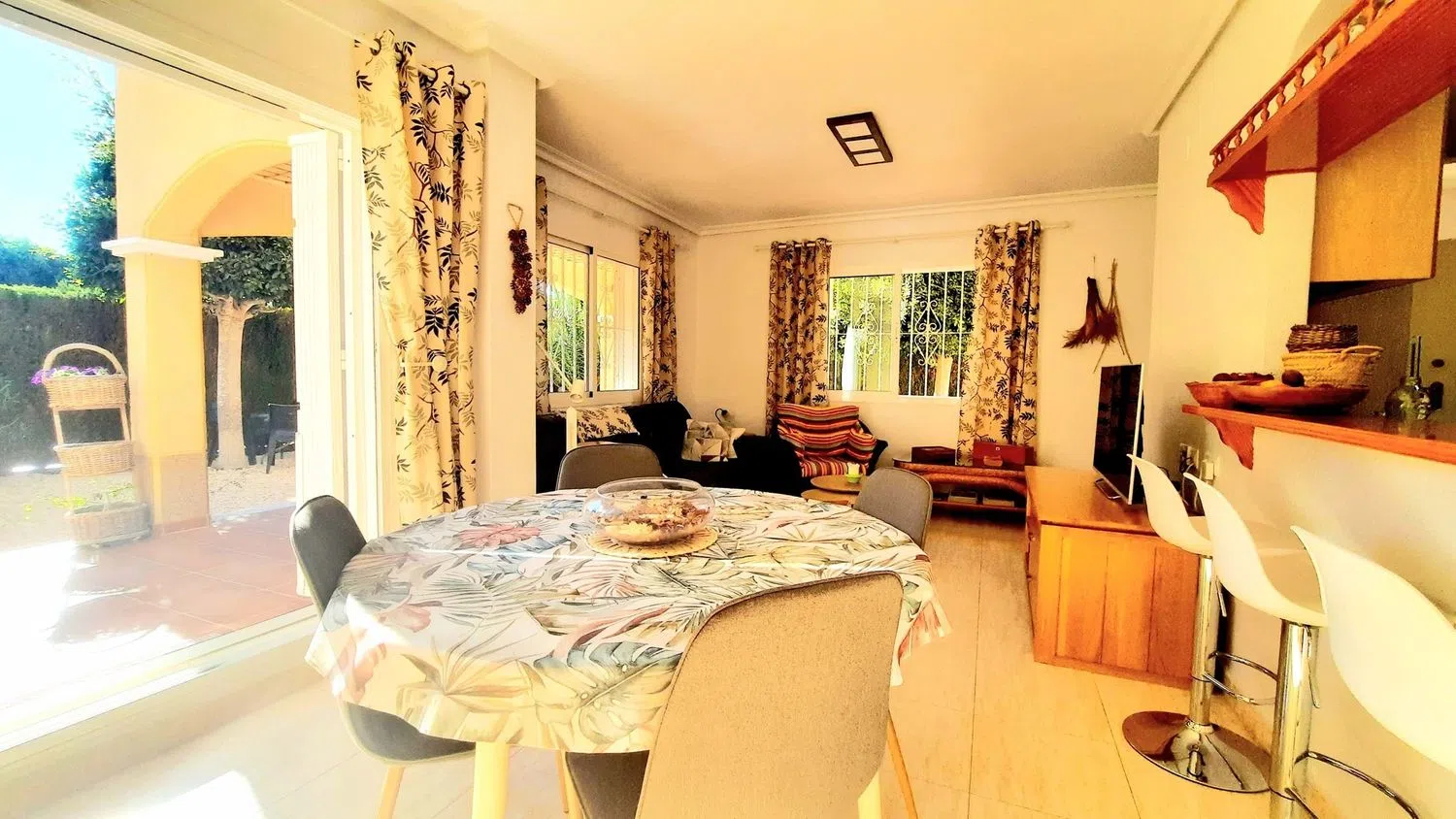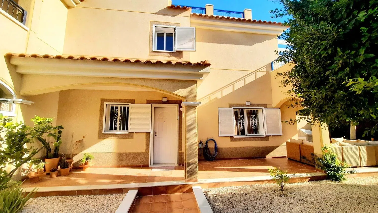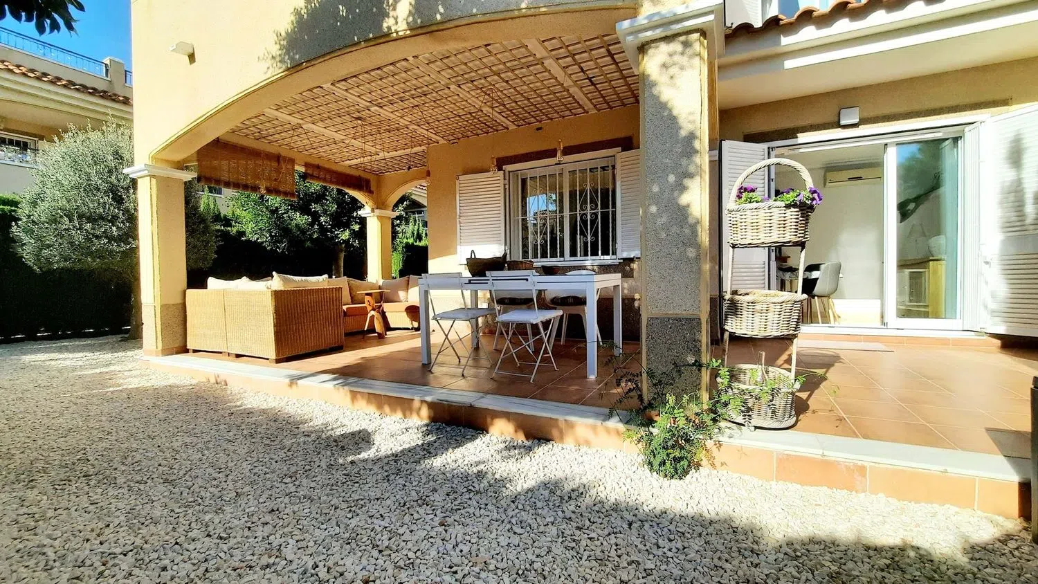 Wij zijn verheugd om deze prachtige hoekwoning op het zuiden te presenteren, met 2 slaapkamers en 2 badkamers in een populaire afgesloten urbanisatie. De locatie biedt een veilige en privé omgeving, ideaal voor ontspanning. De woning beschikt over een mooie tuin en toegang tot een gemeenschappelijk zwembad, die zich op korte afstand van de woning bevinden. Via een privé-ingang is er toegang tot een L-vormige tuin, versierd met volwassen planten, en zijn er zitgedeeltes die uitnodigen tot ontspanning, bereikbaar via terrasdeuren vanuit de woonkamer.