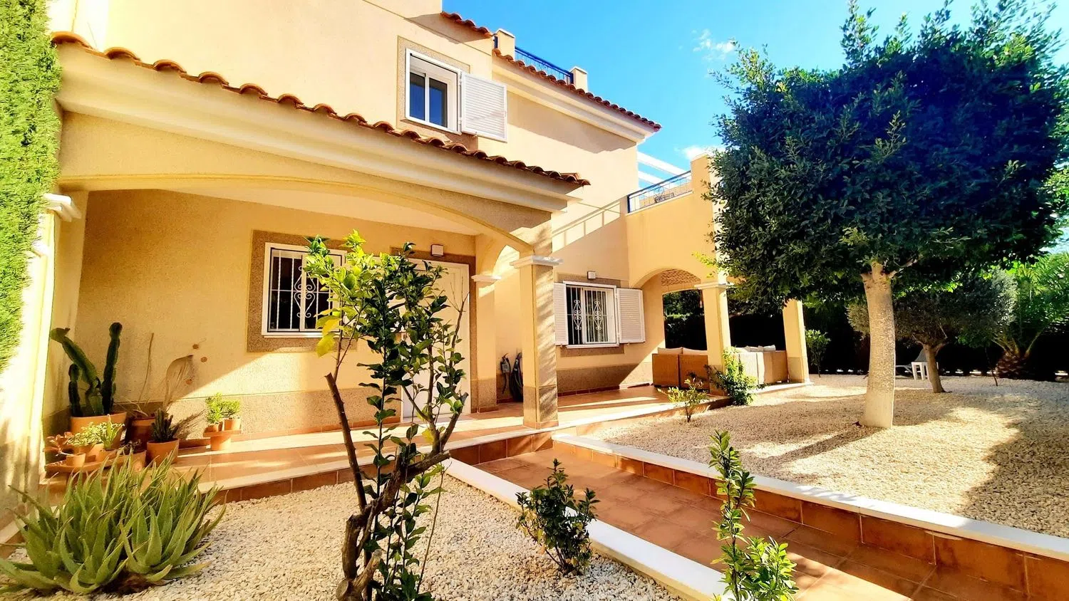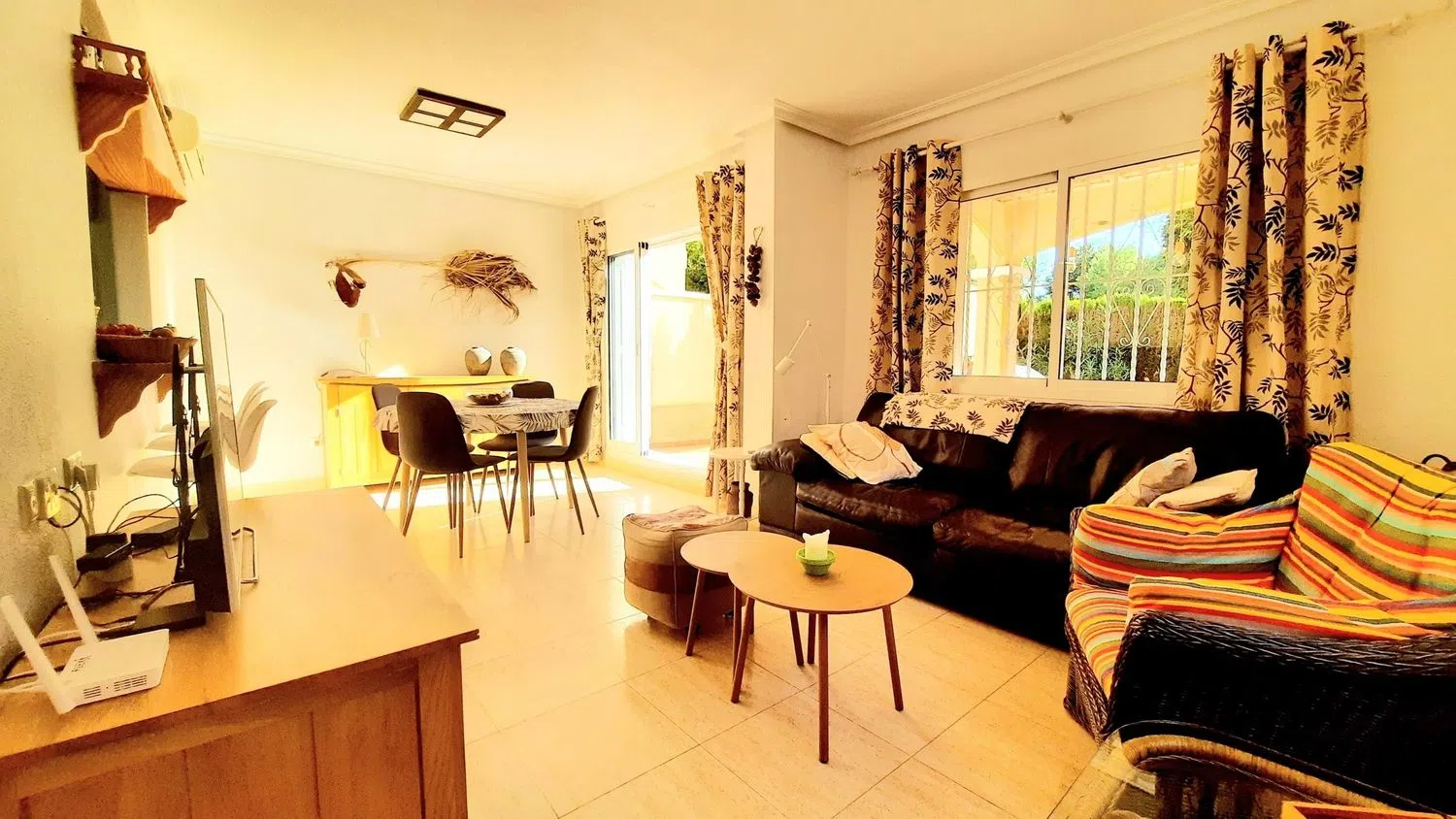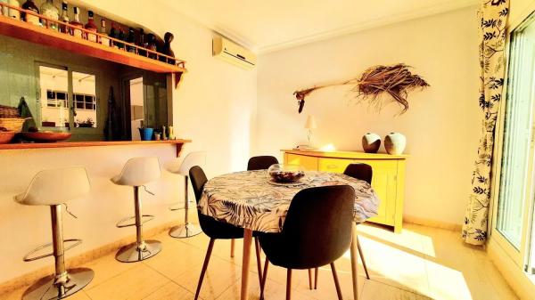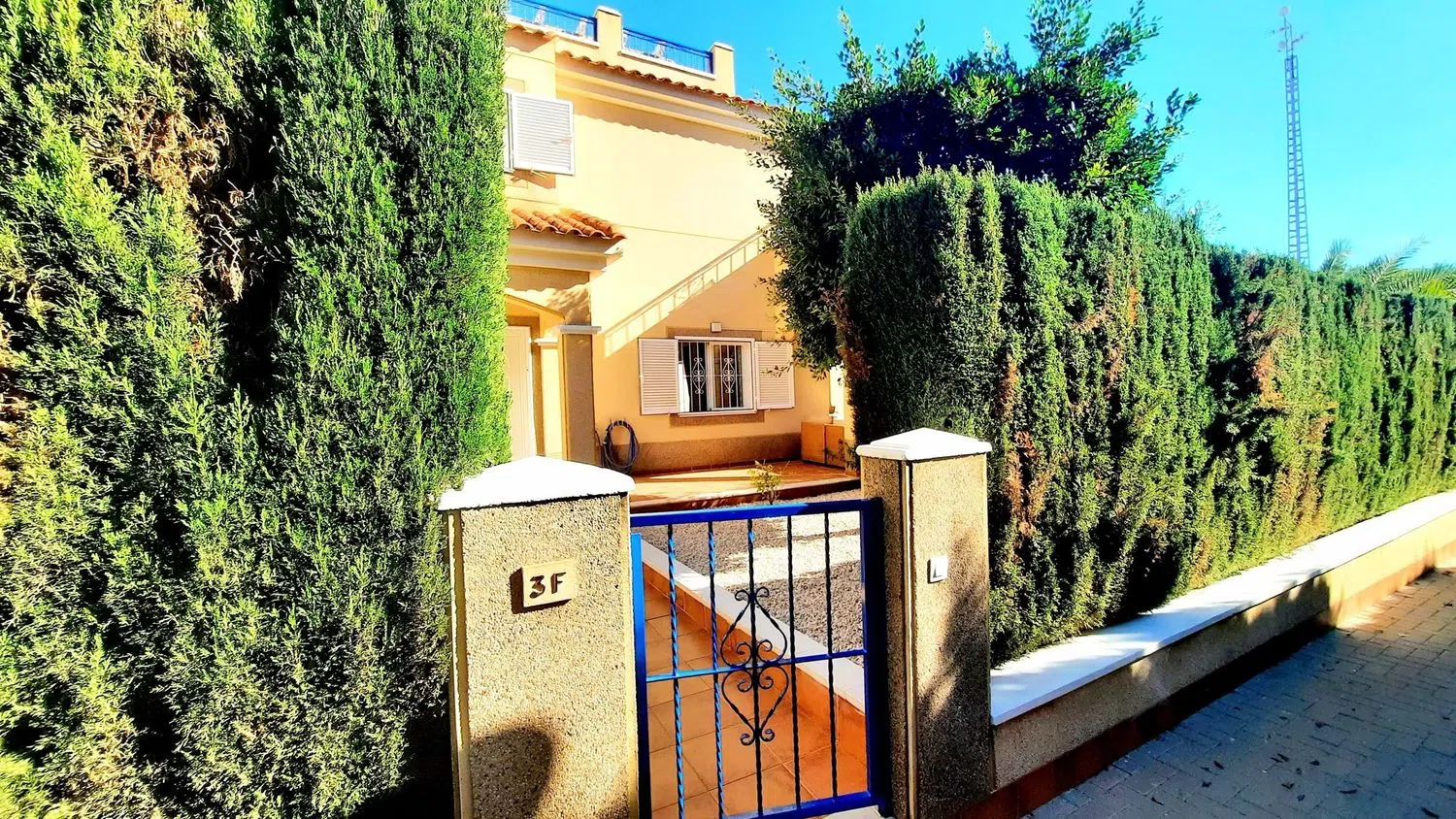 Wij zijn verheugd om deze prachtige hoekwoning op het zuiden te presenteren, met 2 slaapkamers en 2 badkamers in een populaire afgesloten urbanisatie. De locatie biedt een veilige en privé omgeving, ideaal voor ontspanning. De woning beschikt over een mooie tuin en toegang tot een gemeenschappelijk zwembad, die zich op korte afstand van de woning bevinden. Via een privé-ingang is er toegang tot een L-vormige tuin, versierd met volwassen planten, en zijn er zitgedeeltes die uitnodigen tot ontspanning, bereikbaar via terrasdeuren vanuit de woonkamer.