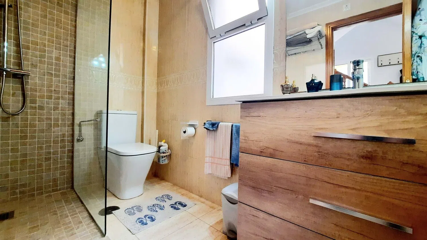 Bij binnenkomst komt u in een hal die leidt naar een ruime woonkamer rechts van de eetkamer. De keuken, halfopen naar de woonruimte, biedt gemak met een deur naar een grote bijkeuken en heeft een douche/toilet op de begane grond. Boven vinden we twee lichte en ruime slaapkamers, waarvan de hoofdslaapkamer toegang biedt tot een groot zonnig terras. Beide slaapkamers zijn uitgerust met inbouwkasten, en op deze verdieping bevindt zich ook een andere badkamer. Vanaf hier leidt een trap naar een privé solarium waar u kunt genieten van een douche en een ruimte om te eten of te ontspannen, allemaal met uitzicht op de speeltuin en de omliggende groene zones.