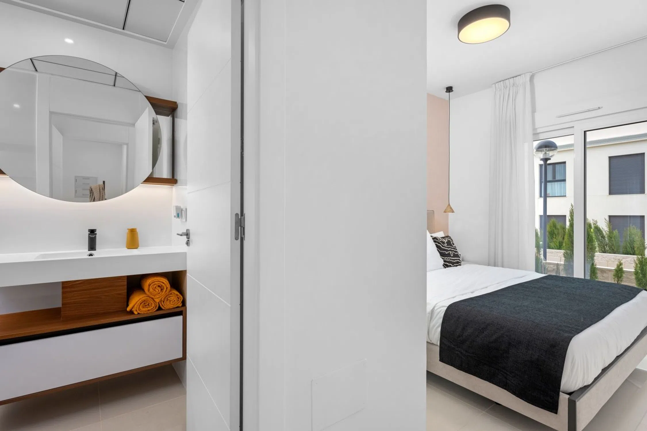 Exclusivo apartamento de obra nueva (2024) ubicado en el prestigioso residencial Adhara, en Ciudad Quesada. La vivienda ofrece un diseño moderno y funcional, con dos amplios dormitorios dobles, uno de ellos con baño en suite para mayor comodidad. El salón destaca por su ambiente acogedor y contemporáneo, integrado en un espacio abierto junto a la cocina, completamente equipada con electrodomésticos de alta calidad. Gracias a su distribución, el salón y la cocina se conectan directamente con la terraza principal, proporcionando abundante luz natural y una perfecta transición hacia el exterior. Además, cuenta con una segunda terraza en la parte trasera, creando diferentes zonas para disfrutar del aire libre. Junto a esta terraza, y separada por árboles frutales que aportan privacidad, se encuentra la plaza de aparcamiento privado dentro de la propia parcela. Entre sus prestaciones de confort, el apartamento dispone de aire acondicionado centralizado frío/calor y suelo radiante en los baños. Se entrega completamente amueblado y listo para entrar a vivir. La comunidad ofrece excelentes zonas comunes, con dos piscinas: una situada al frente de la vivienda y otra en la parte posterior, rodeadas de amplios espacios para tomar el sol y relajarse. Su ubicación es ideal: a solo 5 minutos en coche del centro de Ciudad Quesada y a menos de 10 minutos de las hermosas playas más cercanas.