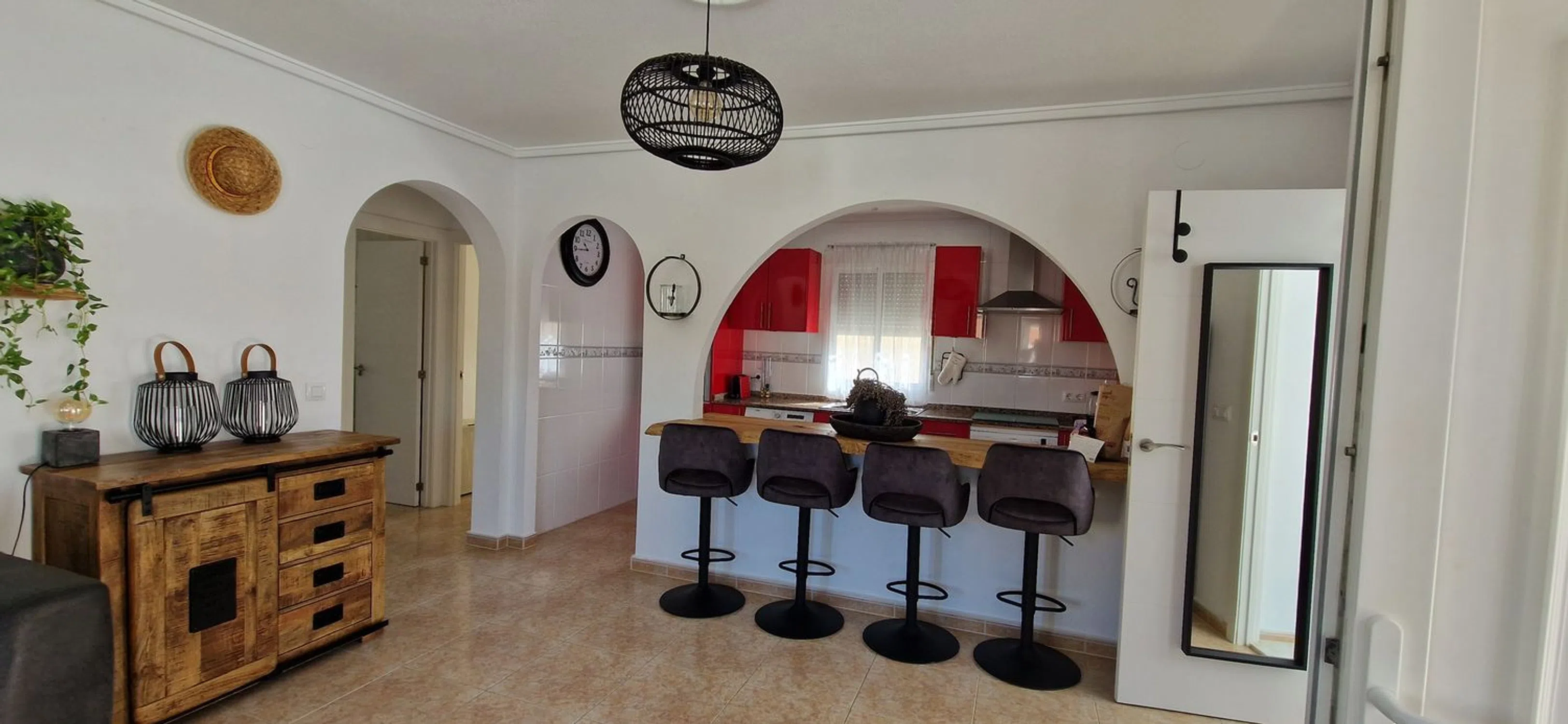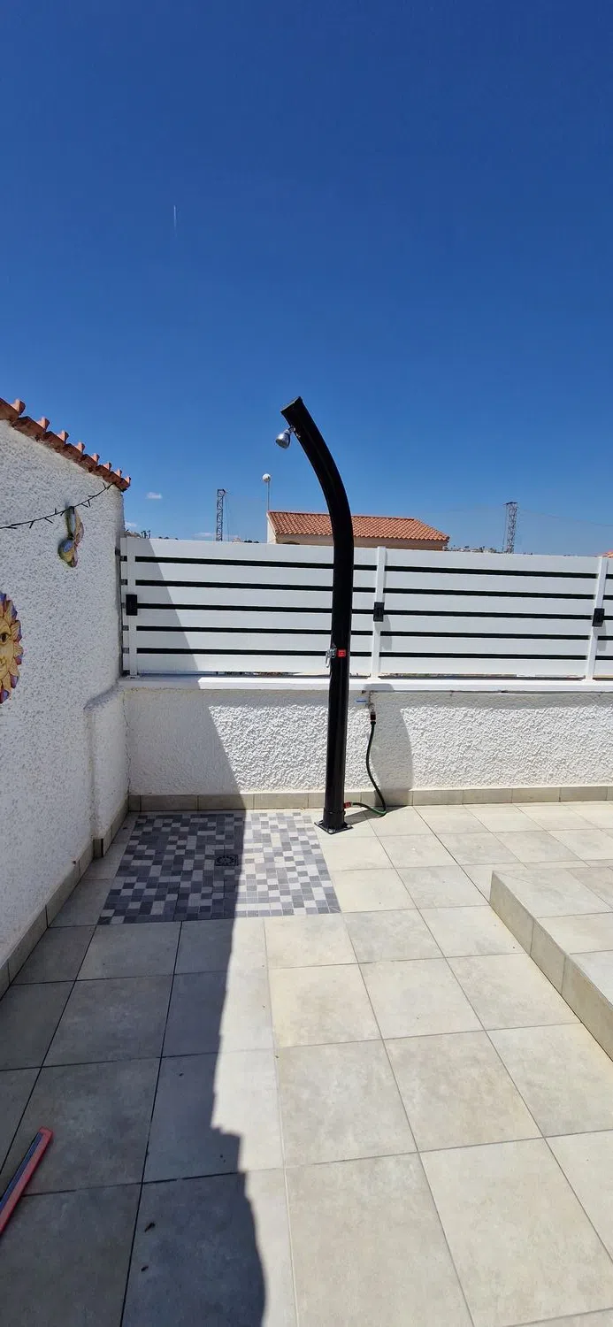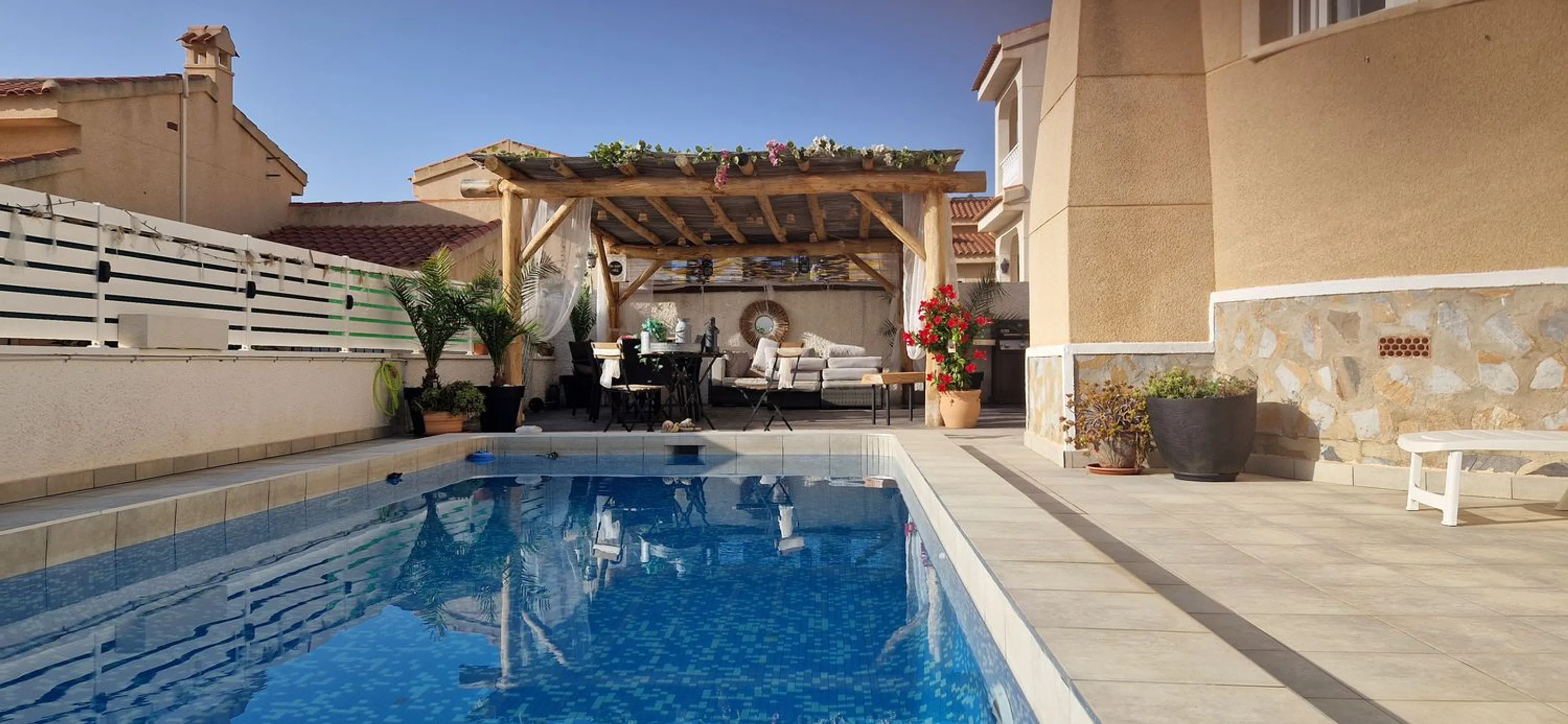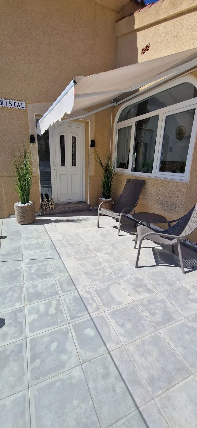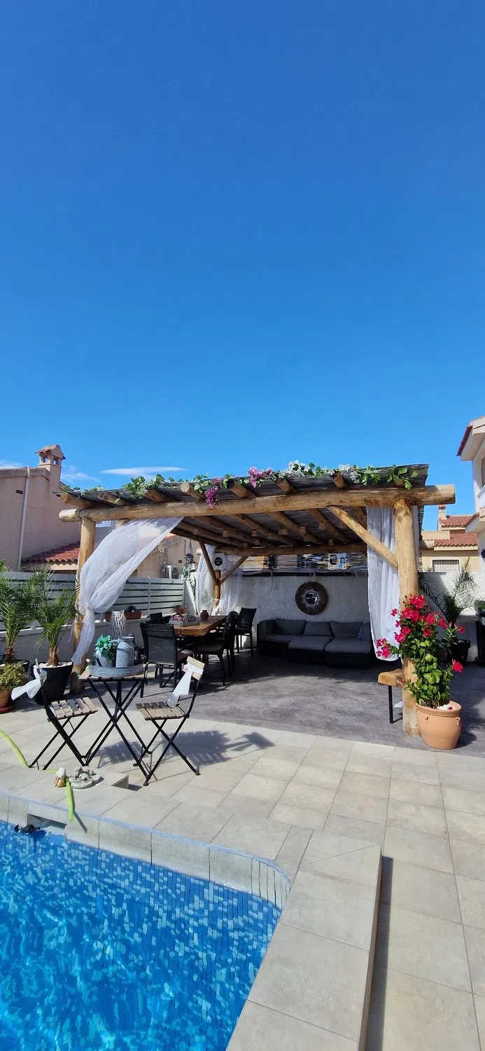 Villa independiente con piscina privada y vistas al campo de golf – La Marquesa, Rojales Esta villa independiente de estilo mediterráneo, excelentemente mantenida, se encuentra en una zona tranquila y popular cerca del campo de golf La Marquesa en Rojales. La propiedad es completamente de una sola planta y accesible para sillas de ruedas, lo que garantiza una comodidad y facilidad de uso óptimas. Distribución: Superficie construida de 113 m² Parcela de 330 m² 3 dormitorios con aire acondicionado y ventiladores de techo Doble acristalamiento con persianas 1 baño moderno con amplia ducha a ras de suelo Amplio y luminoso salón con aire acondicionado. Acogedora estufa de pellets para los fríos meses de invierno. Cocina abierta equipada con electrodomésticos empotrados Atractivo bar acabado con madera maciza de roble Exterior: Piscina privada con terraza soleada Pérgola de estilo ibicenco de madera de castaño Ducha exterior Parcela de fácil mantenimiento: parcialmente alicatada y parcialmente acabada con hormigón impreso Dos prácticos trasteros: debajo y encima de la casa Extras: Doble acristalamiento Persianas y mosquiteras en todas las ventanas Orientación sur para una óptima exposición al sol Ubicación: Ubicación tranquila con vistas despejadas al campo de golf La Marquesa Supermercado a sólo 500 metros A poca distancia de varios restaurantes y bares acogedores A sólo 9 km de las hermosas playas de arena de Guardamar del Segura Esta propiedad es ideal como residencia permanente, casa de vacaciones u objeto de inversión. ¡Póngase en contacto con nosotros hoy mismo para una visita!