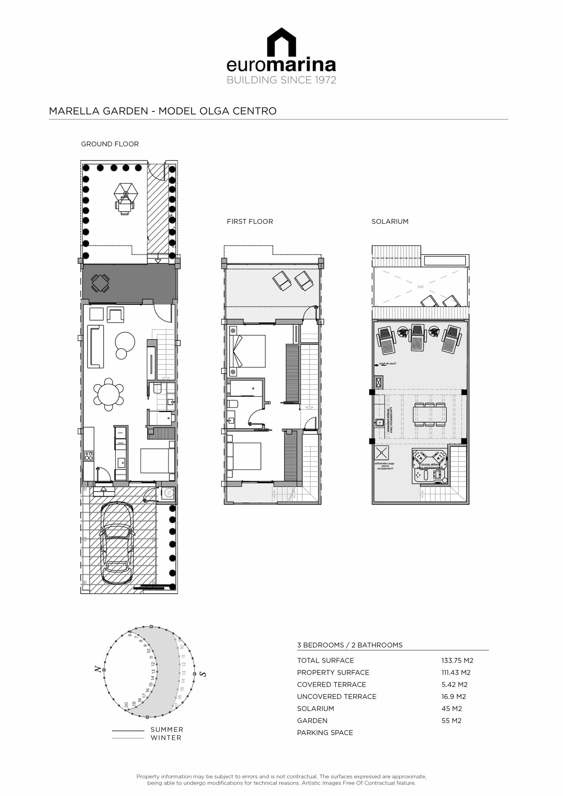De appartementen zijn beschikbaar met verschillende opties: een begane grond met eigen tuin of eerste verdieping met solarium, beide bieden een perfecte buitenruimte om in totale privacy te ontspannen. Elke eenheid omvat een ruime parkeerplaats, wat zorgt voor gemak en veiligheid voor alle bewoners.