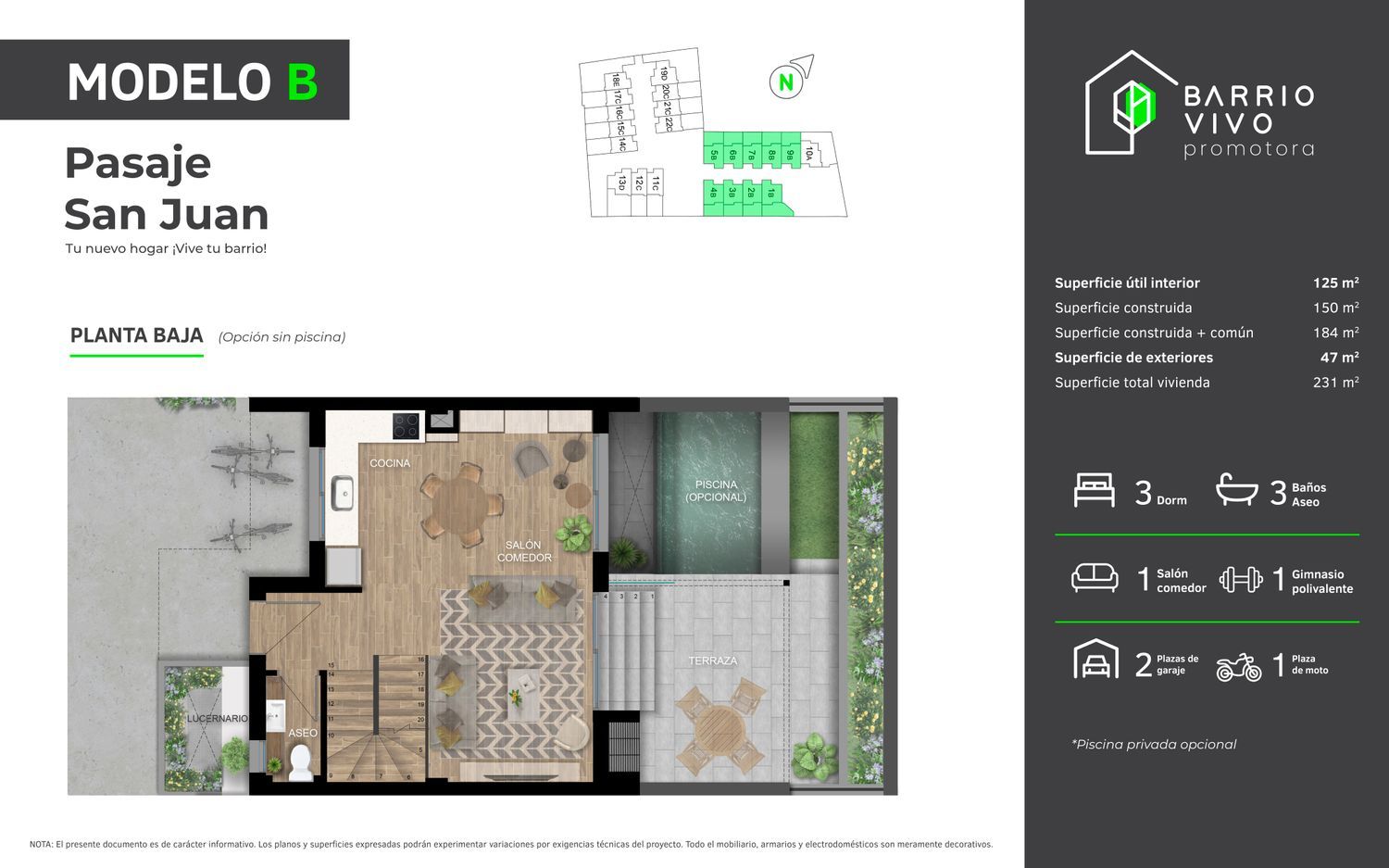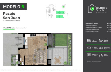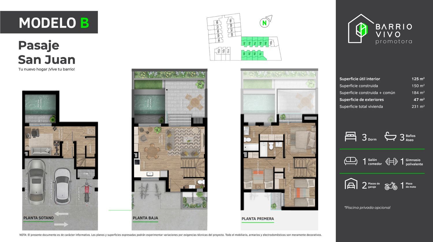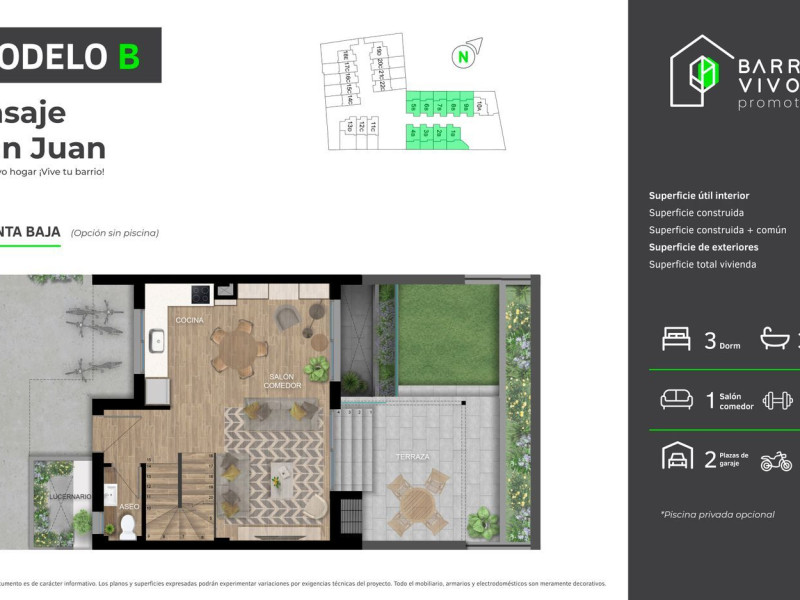 En Pasaje San Juan encontrarás tu nuevo hogar.A 5 minutos de la playa de San Juan, cerca de todos los servicios que necesitas y en una urbanización pensada para que la disfrutes todo el año: 22 Chalets adosados diseñados para las necesidades actuales: Tecnología, Seguridad, Intimidad, Conciliación, Vecindad y Sostenibilidad.Tipologías con tres o cuatro dormitorios, semisótano con patio inglés, 2 o 3 plazas de garaje subterráneas, patio privado y piscina privada opcional.Vive tu barrio: Comparte con tus vecinos la tranquilidad de la vida de barrio.Vive sostenible: Cuida el planeta viviendo en una casa eficiente energéticamente.Vive la tecnología: Disfruta la tecnología para vivir más cómodo y conectado con tu hogar.