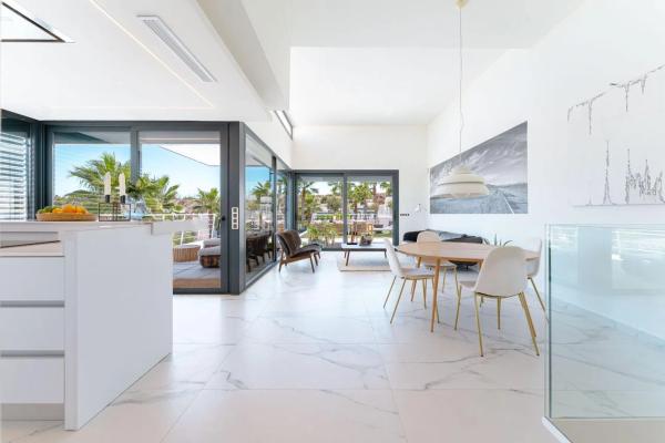 Exclusiva villa de lujo en San Miguel de Salinas, construida en 2021 y diseñada para ofrecer el máximo confort. Con 274 m², la vivienda cuenta con cinco dormitorios y cinco baños, distribuidos en espacios amplios, luminosos y de estilo contemporáneo. La entrada principal da acceso a un elegante salón con cocina abierta y grandes ventanales de suelo a techo que inundan la casa de luz natural y ofrecen vistas panorámicas a la Laguna de Torrevieja y al mar en el horizonte. En esta planta se ubica el dormitorio principal con vestidor y baño en-suite, un despacho, otro vestidor, un baño adicional y un aseo. Desde aquí se accede a una terraza de 25 m², ideal para relajarse o disfrutar con invitados. La planta baja incluye una segunda cocina moderna, tres dormitorios con salida al patio acristalado —dos de ellos con baño en-suite— y un práctico lavadero. El garaje subterráneo ofrece espacio para varios coches y acceso directo a la vivienda. El exterior destaca por su jardín de bajo mantenimiento, una piscina privada con lámina de agua de 25m2 y un espectacular solárium con pérgola, cocina exterior y las mejores vistas al mar de la zona. Situada en una urbanización cuidada y cerca de servicios, colegios internacionales y campos de golf, esta villa es una oportunidad única para quienes buscan lujo, privacidad y un entorno inmejorable. San Miguel de Salinas es un pueblo tranquilo del sur de Alicante, conocido por su ambiente mediterráneo, buen clima y vistas a las salinas y al mar. Ofrece todos los servicios esenciales, incluida una buena oferta gastronómica y colegios internacionales, además de estar cerca de prestigiosos campos de golf y de las playas de Orihuela Costa y Torrevieja. Es un lugar ideal para quienes buscan calma, naturaleza y una vida cómoda cerca del mar.