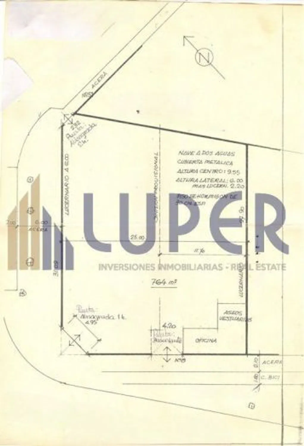 NAVE INDUSTRIAL EN SAN VICENTE ZONA APEADERO. Con una fachada a una av. Principal de 25m y 33,50m a lateral de otra calle 33,5m Superficie: 764 m2 (descontado chaflán), Construcción con estructura metálica a dos aguas, con vigas IPN y HPN, lucernarios laterales en toda su longitud. Cubierta con chapa de acero galvanizado trapecial, cumbrera y placas translucidas repartidas, respiraderos superiores Altura central de cumbrera a suelo: 9,50 m, altura lateral de muros 6,00 m, más cerramiento vertical metálico Pavimento continuo en hormigón fratasado de 30 cm. de espesor y pulido en fresco con palas giratorias, color granate Puertas: 1, tipo basculante en dos piezas horizontales, de 4,20x4,35, con puerta de paso personas 1 en chaflan/esquina, giratoria en una sola hoja de 3,60x3,80 alto, con puerta de paso personas 1, en dos hojas abisagradas de 1,68x2,05 m. alto División interior longitudinal coincidiendo con la cumbrera de unión de las dos aguas, pilares metálicos con vigas HPN y paneles tipo sándwich de 6,00 m. altura y libres los 3,50 m. restantes hasta la cumbrera, esta división no forma parte de la estructura inicial de la nave, por lo que se podría desmontar en caso de necesidad o conveniencia. Esta división interior tiene dos puertas muy grandes de comunicación Hay instalación eléctrica industrial de 13,5 kw en la mitad derecha con cuadros para maquinaria y focos de alumbrado en el techo de toda la nave. Instalación de tubería metálica de aire comprimido con varias tomas en los laterales de la parte derecha. Instalación de agua en toda la nave En la mitad de la derecha hay oficina con aseo y vestuarios para personal de taller con WC y duchas en la parte baja. Encima hay un despacho y una sala de juntas con acceso por escalera exterior dentro de la nave, y ventanas a la calle Se adjunta plano de planta. Este anuncio puede contener errores, se muestra a título informativo en base a la información recibida, sin ser responsable la inmobiliaria de dichas erratas.