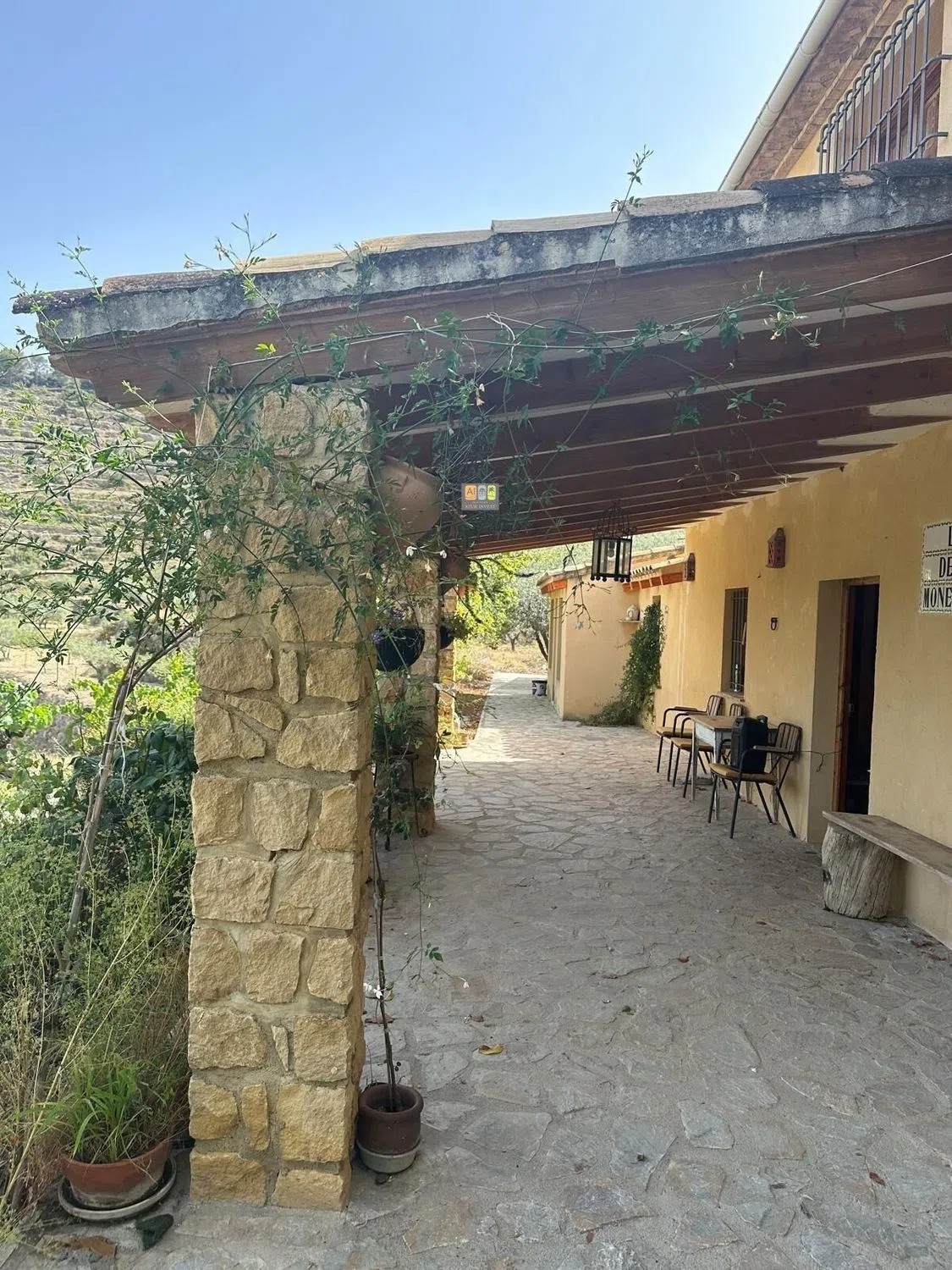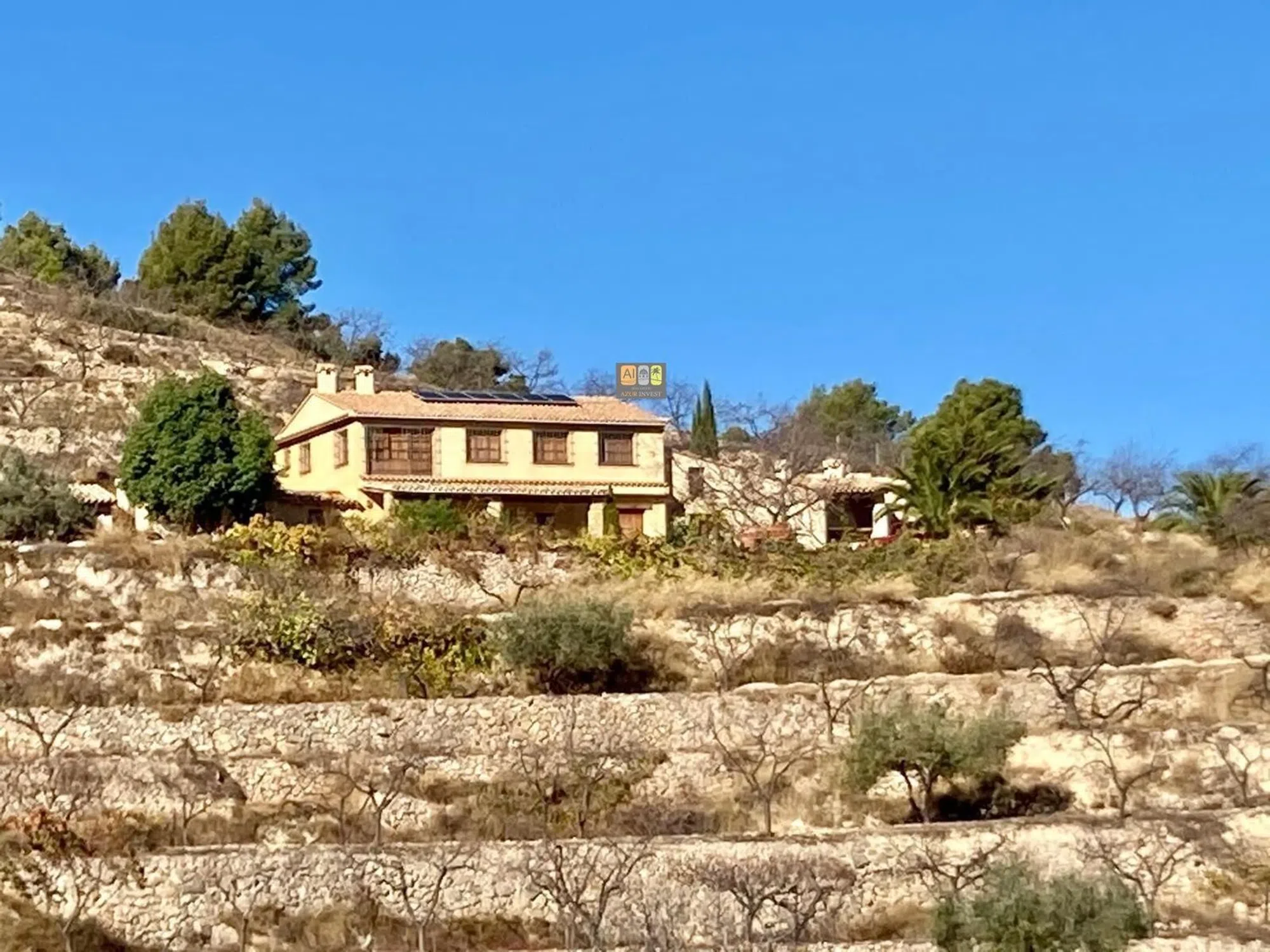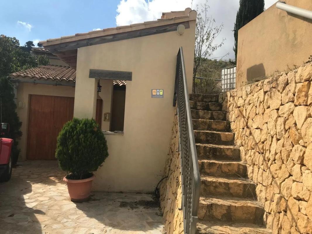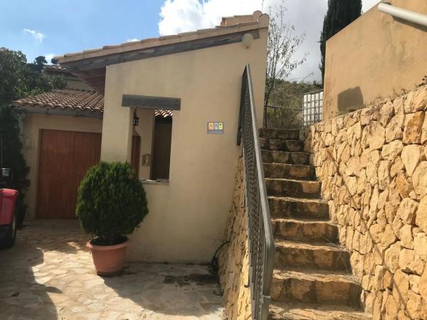 La finca se sitúa a unos 5 km. de la población de Sella y a una altitud de 760 m. sobre el nivel del mar, en el interior de la Marina en Sella, a 18 km. de Benidorm y 16 km. de Villajoyosa. Se accede por camino asfaltado hasta la puerta de cierre de la finca, luego hay unos 70 m. de camino con zohorra/gran hasta la casa. La parcela se trata de un terreno rústico de 16.000m2 cultivado y en producción plantado de olivos, almendros, frutales variados y vides. Es una finca aterrazada con bancales y todos ellos con muros de piedra en mampostería tradicionales. La ubicación de la finca hace que tenga vistas impresionantes a las montañas y valles desde Aitana, Ponoig o León Dormido, Penya de Sella, Barranc del Arc de Xarquer o el Puig Campana, etc. En la finca se producen aproximadamente cada año: 700kg. de almendra, 1.000kg. de aceituna que son aproximado unos 220 litros de aceite de oliva, 250 kg. de vino (hace unos años se producían mas de 2.500 litros de vino que se pueden volver a producir) y frutas varias como manzanas, nueces, peras, cerezas, uva, higos, etc. La casa es grande de estilo rústico con una superficie construida de 230 m2 y útiles de 205 m2 distribuidos en dos plantas. (los anexos hay que añadirlos a esta superficie) y se distribuye en: planta baja de unos 110 m2 en un salón-comedor muy grande con chimenea y una cocina abierta, un dormitorio, un baño, bodega y una escalera a primera planta. Primera planta de unos 120 m2 con dos dormitorios con techos altos abuhardillados de madera, resto de la planta alta diáfana y por distribuir de unos 70 m2 (la idea es finalizar con un salón de aprox. 40 m2 con chimenea, dos baños, un dormitorio y cocina abierta al salón. Está previsto si se quiere realizar una vivienda independiente en cada planta ya que la primera planta cuenta también con acceso directo. Además de la vivienda detallada cuenta con varios anexos: Zona de Barbacoa con horno de leña, paellero/asador brasa (15 m2) Garaje con altillo (40 m2), que es donde se ubica también la zona de producción del vino. Gallinero (10 m2) Zona de chillaut cubierto y abierto (25 m2) Porche frente a la casa (30 m2) Dos depósitos de agua de recogida de lluvia con capacidad total de 75.000 litros aprox. (uno de 45.000 l. y otro de 29.000 l. con agua corriente y bomba de presión para todo el servicio de la casa). Instalación eléctrica con placas solares con batería Fosa séptica Vallado en la zona del camino con muros y pilares de piedra artesanal en mampostería. Empedrado de pidra de losa en toda la zona de la calle de la casa con aprox. 350 m2 Escaleras exteriores en piedra artesanal. Rejas y barandillas de forja artesanal. Sella dispone de todos los servicio: Comercios de alimentación, carnicerías, panaderías, dispensario médico y enfermería todos los días de 9,00h a 14,00h., guardería infantil desde los 2 años y colegio hasta los 12 años con comedor, taller mecánico, varios bares y restaurantes, casas rurales y alojamientos, farmacia, empresas de servicios, bus urbano diario, zona de deporte y polideportivo municipal con piscina, gimnasio, pádel, etc.