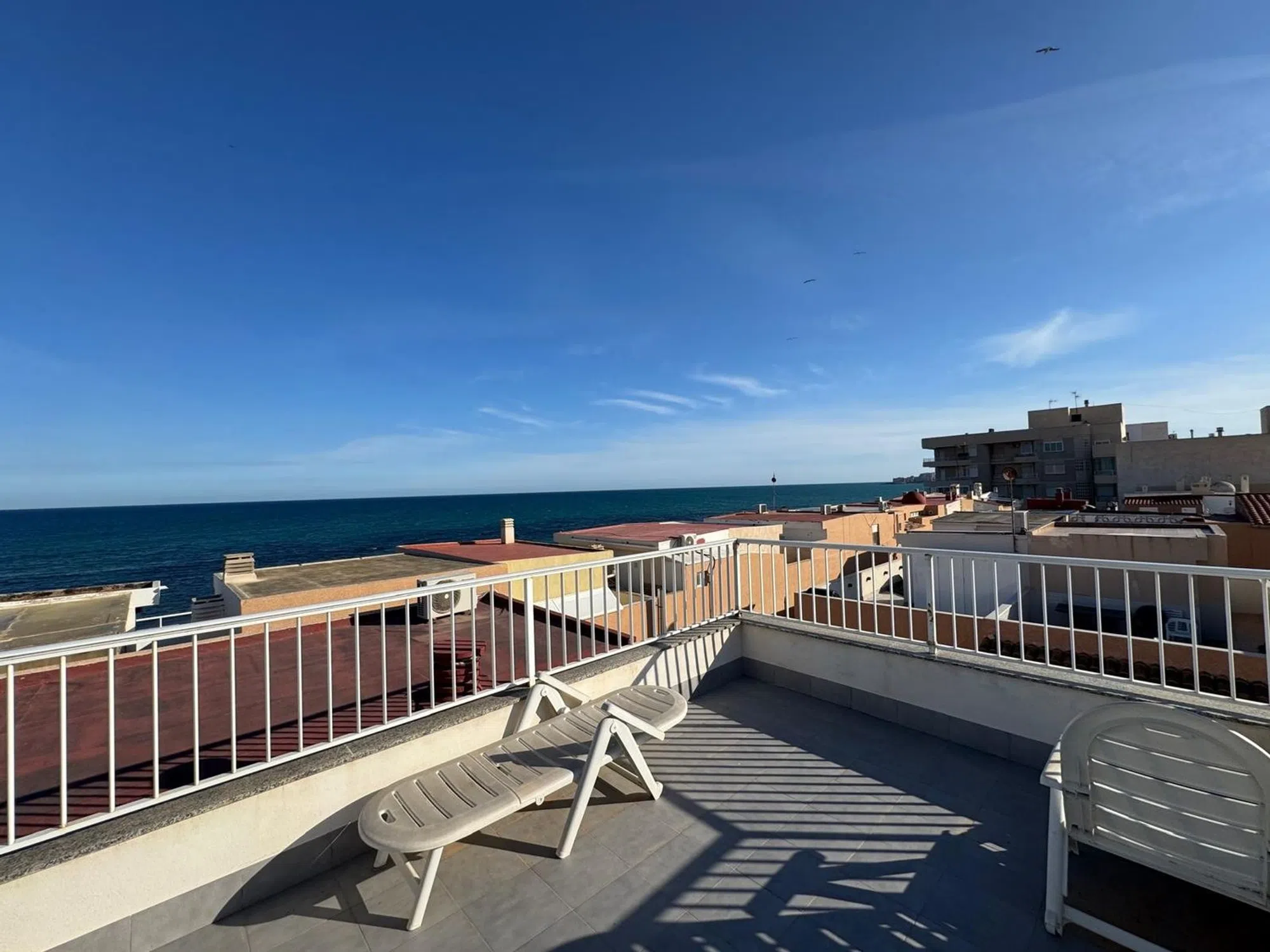 Exclusivo Dúplex en La Mata con Vistas al Mar – Ubicación Ideal a 50m de la Playa Características principales: 3 dormitorios2 baños110 m² construidosA solo 50 metros de la playa de La Mata y restaurantes y con fácil acceso a todos los servicios locales. A 3 minutos caminando de la Torre de La Mata (plaza principal). Orientación este, oeste, norte, sur. Se vende amueblado (los compradores pueden elegir si desean conservar algunos muebles o no). Dúplex en 2ª planta, accesible por escaleras. Espacio para almacenaje adicional en la terraza superior. Descripción: Al entrar en la propiedad, te recibe una veranda acristalada, luego accedes a un amplio salón-comedor-cocina abierta, ideal para disfrutar en familia. También dispone de dos dormitorios (uno de ellos de gran tamaño) y un baño completo. En la planta superior, se encuentra el dormitorio principal con un baño en suite y ducha, además de un pequeño balcón orientado al sur con espacio para almacenamiento de lavadora. Desde allí, se accede a una terraza con vistas al mar, que conecta con el solárium privado con vistas de 360°, perfecto para relajarse al sol en las dos tumbonas disponibles. Una excelente oportunidad de vivir en la costa de La Mata con amplia terraza y vistas espectaculares. ¡No dejes pasar esta propiedad única!