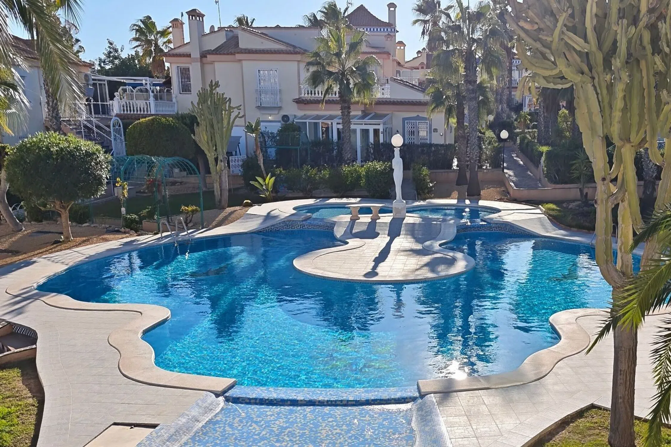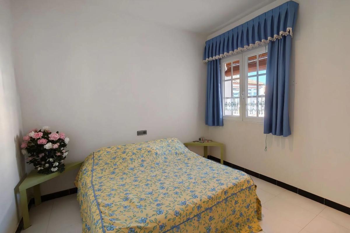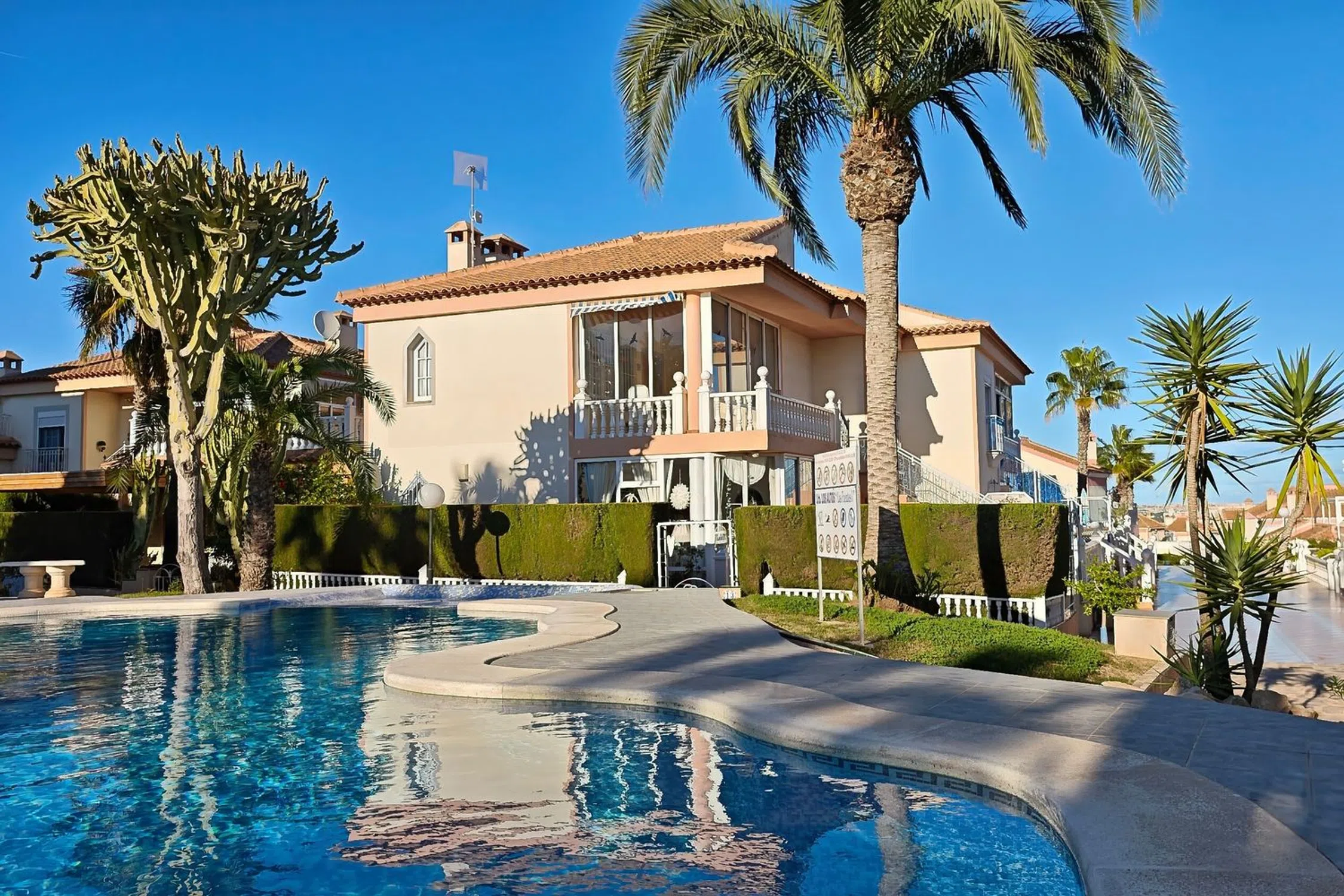 Bungalow en esquina en un jardín de palmeras – Vista al mar y piscina en Residencial Las Fuentes Este encantador bungaló de esquina, ubicado en la exclusiva urbanización Residencial Las Fuentes, combina el estilo de vida mediterráneo, la tranquilidad y el confort. Está ubicado en un jardín de palmeras muy bien cuidado y junto a la amplia piscina comunitaria, y ofrece unas vistas impresionantes de los jardines y la zona de la piscina. El luminoso bungaló, totalmente amueblado y en perfectas condiciones, cuenta con dos dormitorios, un cuarto de baño, un amplio salón con cocina abierta y una gran terraza parcialmente acristalada con una exposición solar perfecta, ideal para disfrutar del clima mediterráneo durante todo el año. El mobiliario de buen gusto y el excelente estado de la vivienda la hacen lista para entrar a vivir. La urbanización Residencial Las Fuentes impresiona por sus zonas verdes, su tranquila ubicación y su proximidad a tiendas, restaurantes y a las playas de la Costa Blanca. Hay mucho espacio para aparcar delante del complejo y una parada de autobús cercana ofrece conexiones fáciles con Torrevieja. Es perfecto como casa de vacaciones, segunda residencia o inversión rentable: aquí, la comodidad, la seguridad y el encanto mediterráneo se unen de una manera única. 199 300 €.