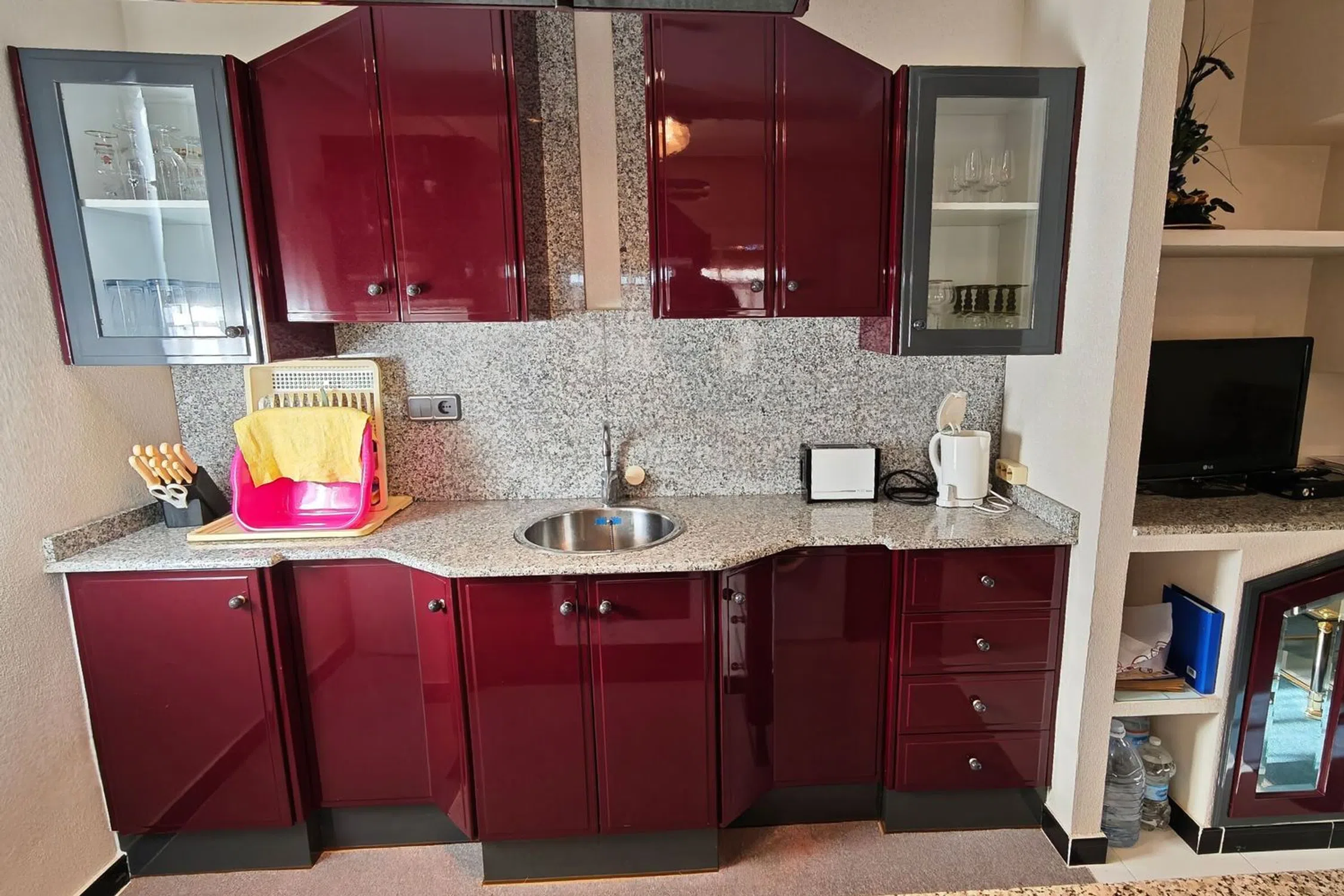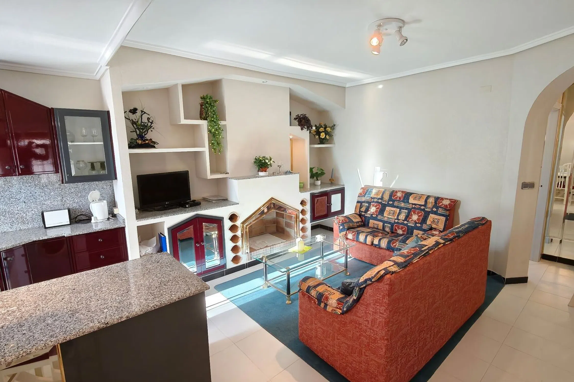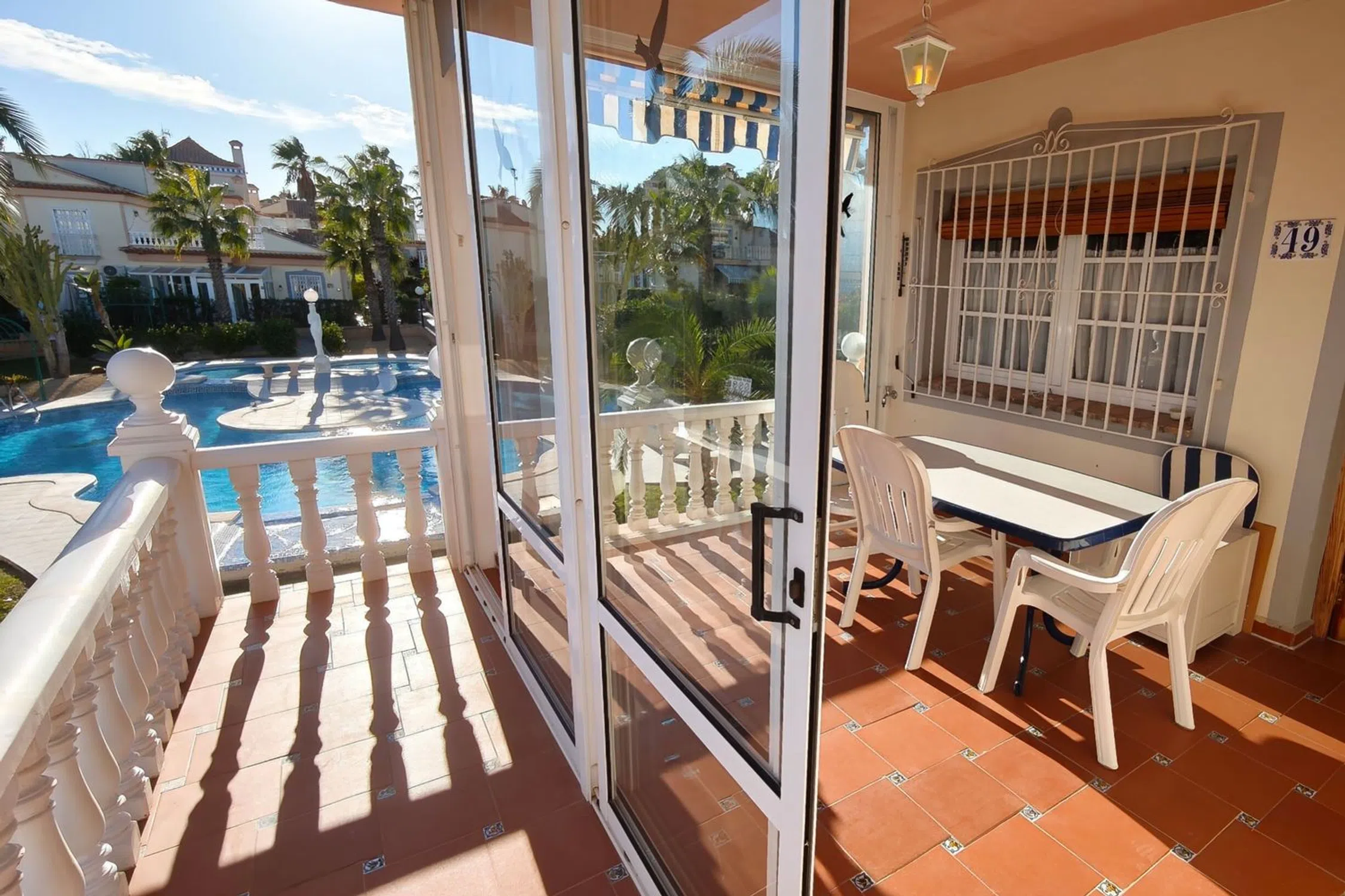 Bungalow en esquina en un jardín de palmeras – Vista al mar y piscina en Residencial Las Fuentes Este encantador bungaló de esquina, ubicado en la exclusiva urbanización Residencial Las Fuentes, combina el estilo de vida mediterráneo, la tranquilidad y el confort. Está ubicado en un jardín de palmeras muy bien cuidado y junto a la amplia piscina comunitaria, y ofrece unas vistas impresionantes de los jardines y la zona de la piscina. El luminoso bungaló, totalmente amueblado y en perfectas condiciones, cuenta con dos dormitorios, un cuarto de baño, un amplio salón con cocina abierta y una gran terraza parcialmente acristalada con una exposición solar perfecta, ideal para disfrutar del clima mediterráneo durante todo el año. El mobiliario de buen gusto y el excelente estado de la vivienda la hacen lista para entrar a vivir. La urbanización Residencial Las Fuentes impresiona por sus zonas verdes, su tranquila ubicación y su proximidad a tiendas, restaurantes y a las playas de la Costa Blanca. Hay mucho espacio para aparcar delante del complejo y una parada de autobús cercana ofrece conexiones fáciles con Torrevieja. Es perfecto como casa de vacaciones, segunda residencia o inversión rentable: aquí, la comodidad, la seguridad y el encanto mediterráneo se unen de una manera única. 199 300 €.