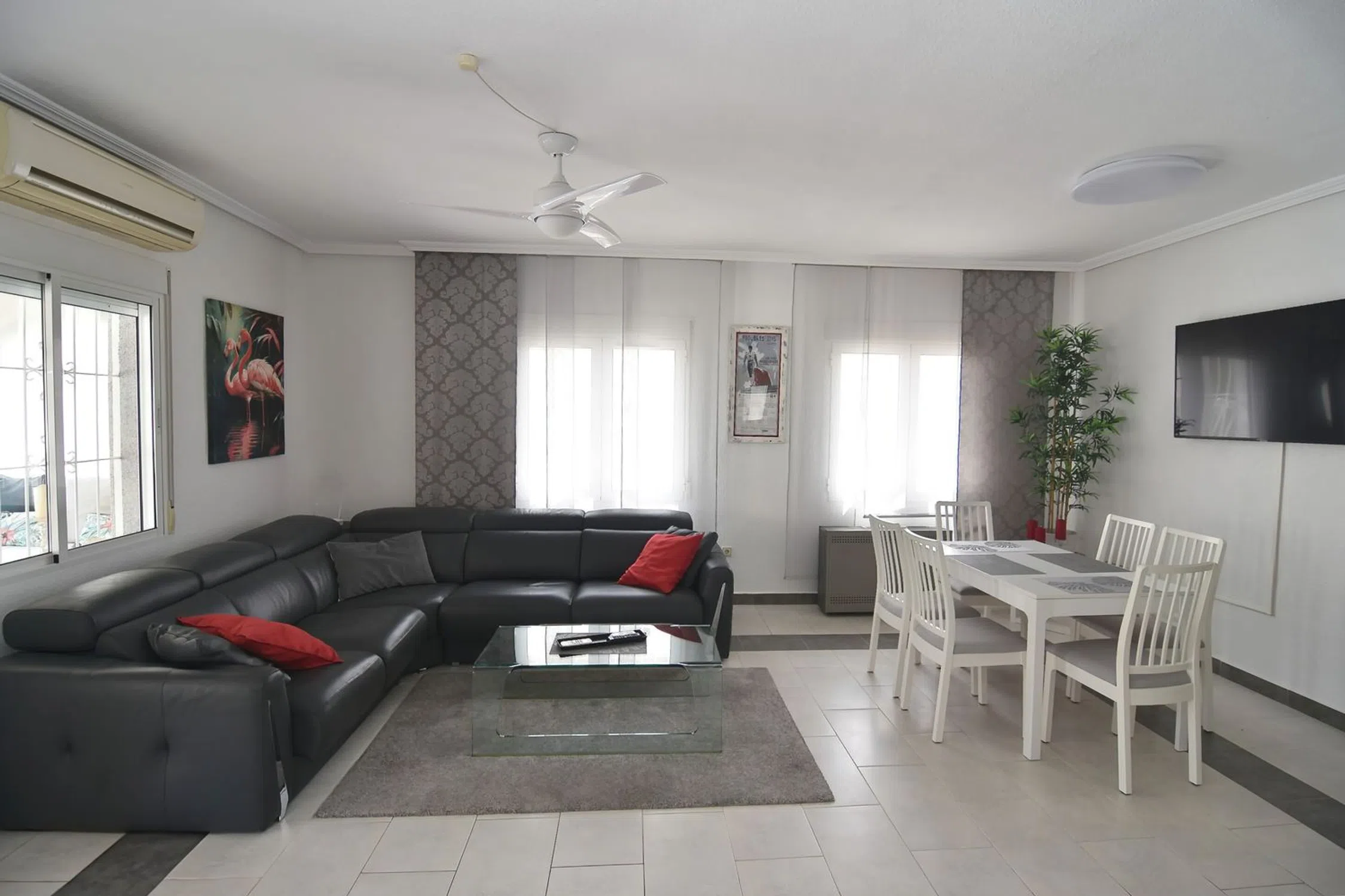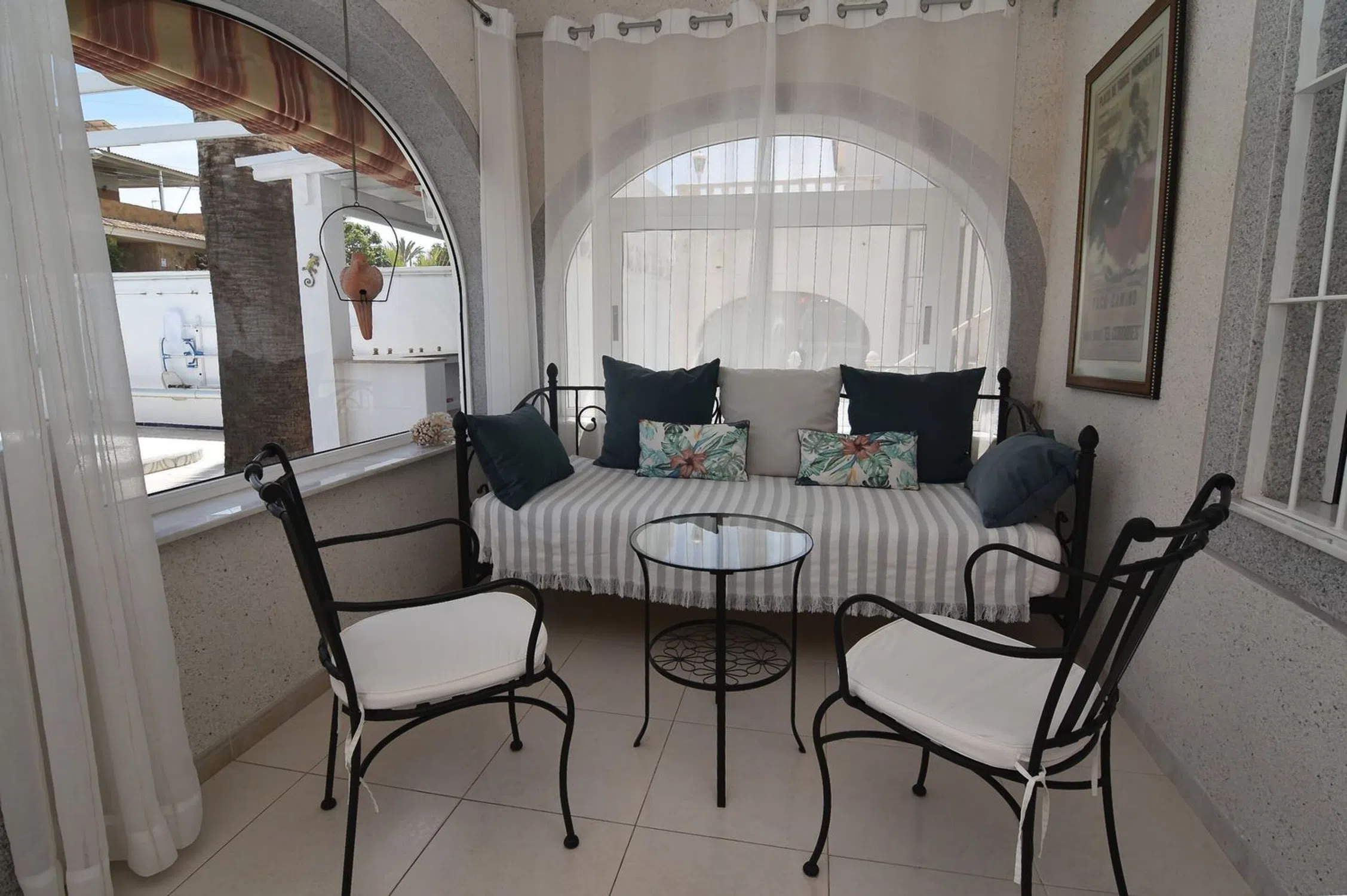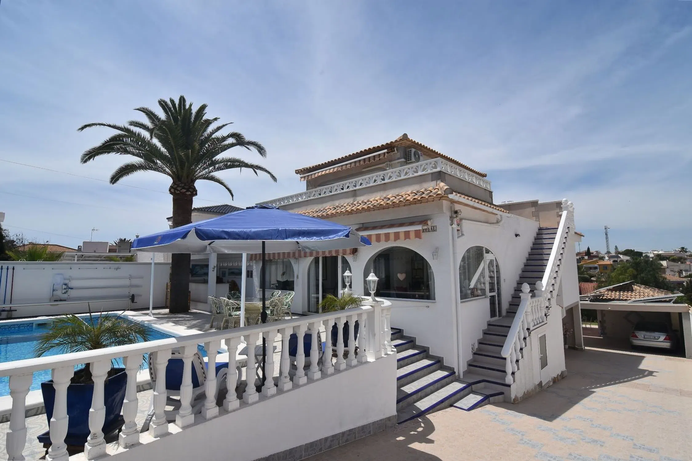 Villa de ensueño renovada en Los Balcones – Lujo, sol y alegría de vivir en una parcela privada de 900 m² | 3 viviendas independientes | Renovada en 2023 | Piscina y jacuzzi privados | Vistas al mar | Gran potencial de alquiler | Esta extraordinaria villa, situada en una exclusiva zona residencial de Los Balcones, combina el encanto mediterráneo con el confort moderno y ofrece una experiencia de vida incomparable bajo el sol de España. Completamente renovada en 2023, la propiedad destaca por su versatilidad: tres viviendas independientes, decoradas con esmero, ofrecen espacio para familia, invitados o alquiler vacacional, todo en un ambiente elegante y acogedor. La vivienda principal recibe a sus habitantes con una terraza y un acogedor jardín de invierno que conduce a un amplio salón-comedor con moderna cocina totalmente equipada. Dos dormitorios y dos elegantes baños (uno en suite) garantizan el máximo confort. Una escalera exterior conduce al apartamento tipo estudio, un encantador refugio con cama con dosel, zona de comedor, pequeña cocina y baño moderno. El gran ventanal panorámico ofrece vistas a los alrededores y acceso a una amplia terraza con mobiliario de salón, ideal para disfrutar de espectaculares puestas de sol. La tercera vivienda, situada en la parte trasera de la villa, ofrece otro hogar acogedor con cocina abierta, comedor, sala de estar, dos dormitorios, baño y acceso a una gran terraza soleada. El jardín mediterráneo, cuidadosamente diseñado, es un paraíso de palmeras, zonas de césped y rincones de descanso. La piscina privada de 8 × 4 m, rodeada de una amplia terraza, junto con el bar de piscina, el jacuzzi para cuatro personas y la zona de barbacoa, promete noches inolvidables al aire libre. Equipamiento: • 5 dormitorios • 4 baños • Superficie habitable aprox. 200 m² • Parcela aprox. 900 m² • 3 viviendas independientes • Piscina privada de 8 × 4 m • Jacuzzi para 4 personas • Terraza en la azotea con vistas al mar • Varias terrazas, algunas cubiertas • Calefacción central • Aire acondicionado en todas las estancias • Totalmente amueblada • Cocinas modernas totalmente equipadas • Jardín de invierno • Bar de piscina • Zona de barbacoa • Jardín mediterráneo con césped y palmeras • Portón automático y entrada privada • Aparcamiento para varios vehículos y autocaravana • Cochera cubierta • Garaje para motocicletas • Lavadero y trastero • Puerta de seguridad • Conexión Wi-Fi • Alta privacidad y potencial de alquiler Ubicación: Aeropuerto 45 min | Playa 3 km | Campo de golf 2 km | Tiendas 500 m | Restaurantes 500 m Conclusión: Esta villa mediterránea es mucho más que una vivienda: es un lugar de alegría, libertad y bienestar. Ya sea como residencia exclusiva, casa de vacaciones o inversión con alta rentabilidad, aquí se unen el estilo, el confort y el auténtico espíritu mediterráneo en una auténtica joya en Los Balcones.