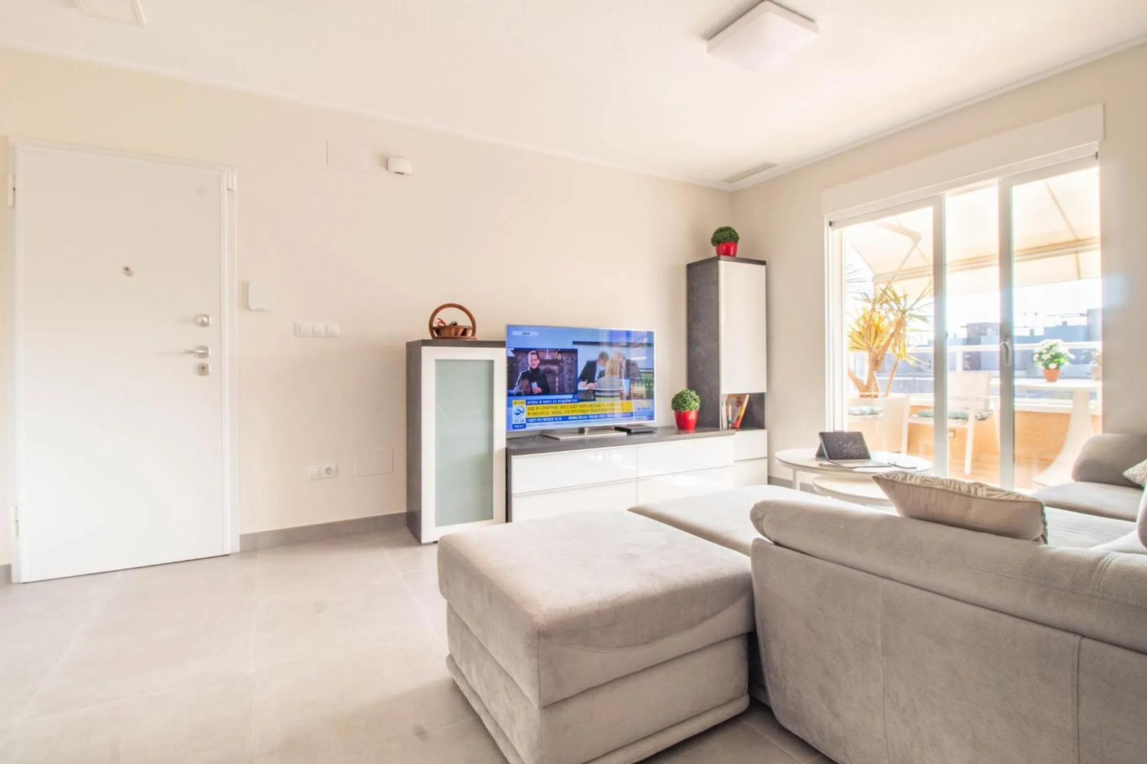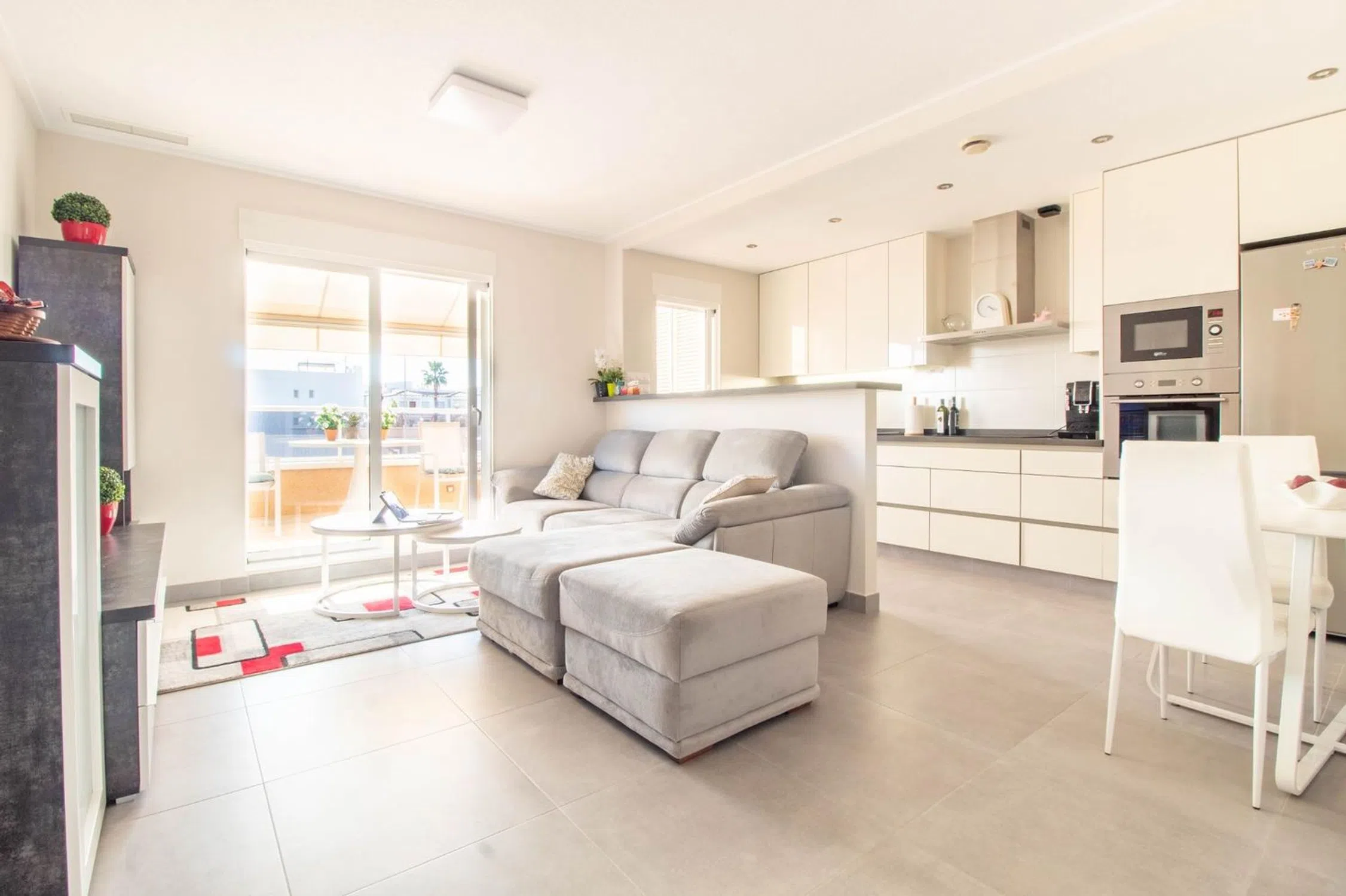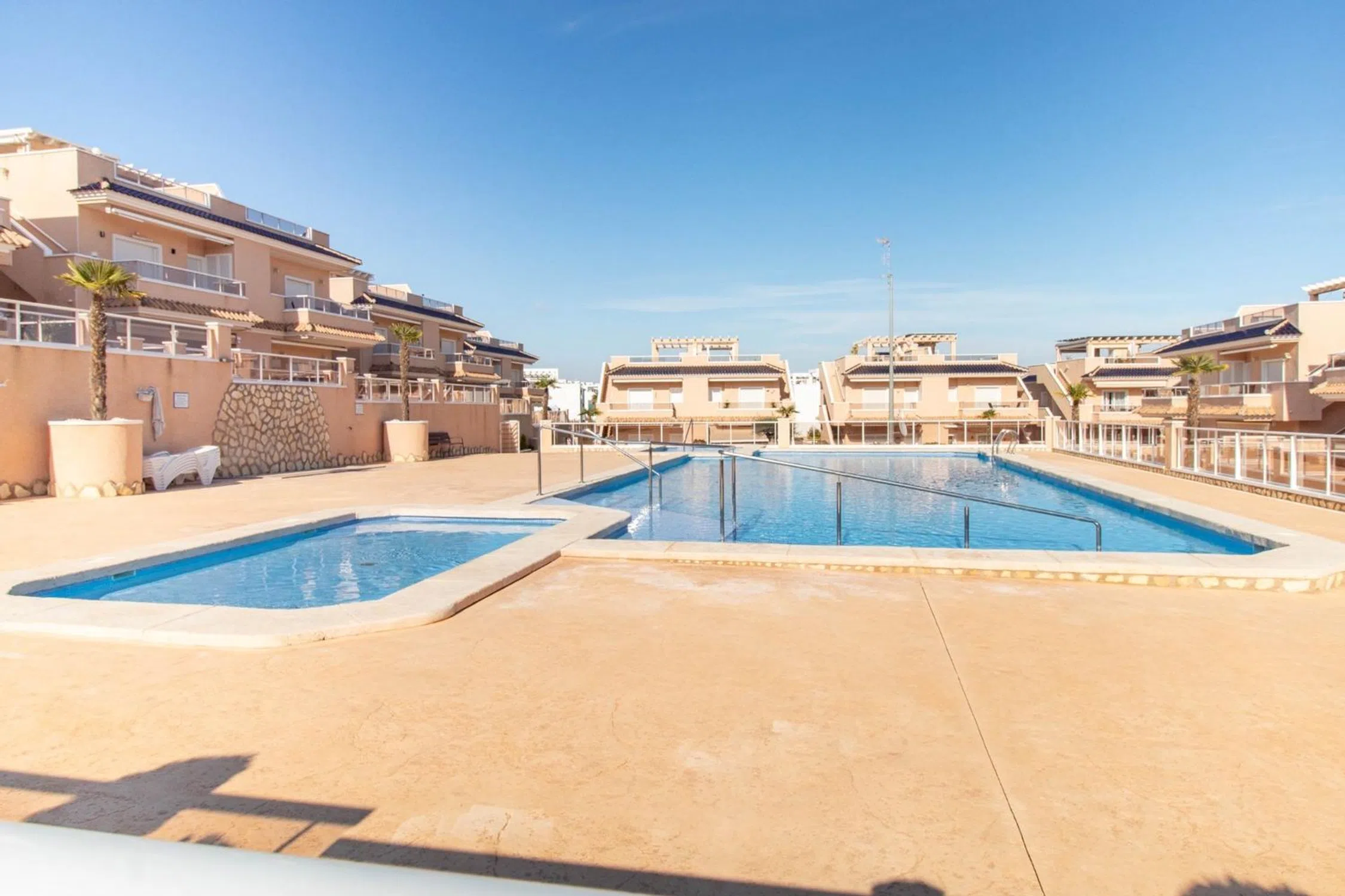 Este encantador bungalow de planta alta ofrece un cómodo y elegante estilo de vida con espacios amplios y bien distribuidos. Cuenta con dos dormitorios, uno de ellos con baño en suite. El salón, de estilo abierto, se comunica con una moderna cocina americana que da acceso directo a la terraza, creando un ambiente perfecto para disfrutar de la vida al aire libre. Además, desde el salón también se puede acceder a un balcón orientado al sur, ideal para aprovechar las horas de sol. El solárium privado de 56 metros cuadrados se convierte en un oasis de tranquilidad, equipado con un jacuzzi y rodeado de plantas tropicales, lo que permite disfrutar de vistas relajantes hacia el residencial. En la planta baja, se encuentra otra terraza privada de 21 metros cuadrados, perfecta para actividades al aire libre. La vivienda tiene placas solares y plaza de parking. Este residencial cerrado ofrece una serie de comodidades de lujo, como una piscina climatizada y sauna, así como una piscina exterior, zonas comunes ideales para relajarse, y un parque de juegos para niños, haciendo de este lugar el hogar perfecto para familias que buscan calidad de vida y tranquilidad. Punta Prima es una tranquila y atractiva zona costera en Torrevieja, Alicante, conocida por su hermosa playa de arena dorada y aguas cristalinas. Ideal para quienes buscan disfrutar del mar y el sol, cuenta con un paseo y vistas espectaculares. La zona ofrece una buena variedad de restaurantes, tiendas y servicios, además de estar cerca de campos de golf y parques naturales. Perfecta para quienes buscan un ambiente relajado y una excelente calidad de vida cerca del mar.