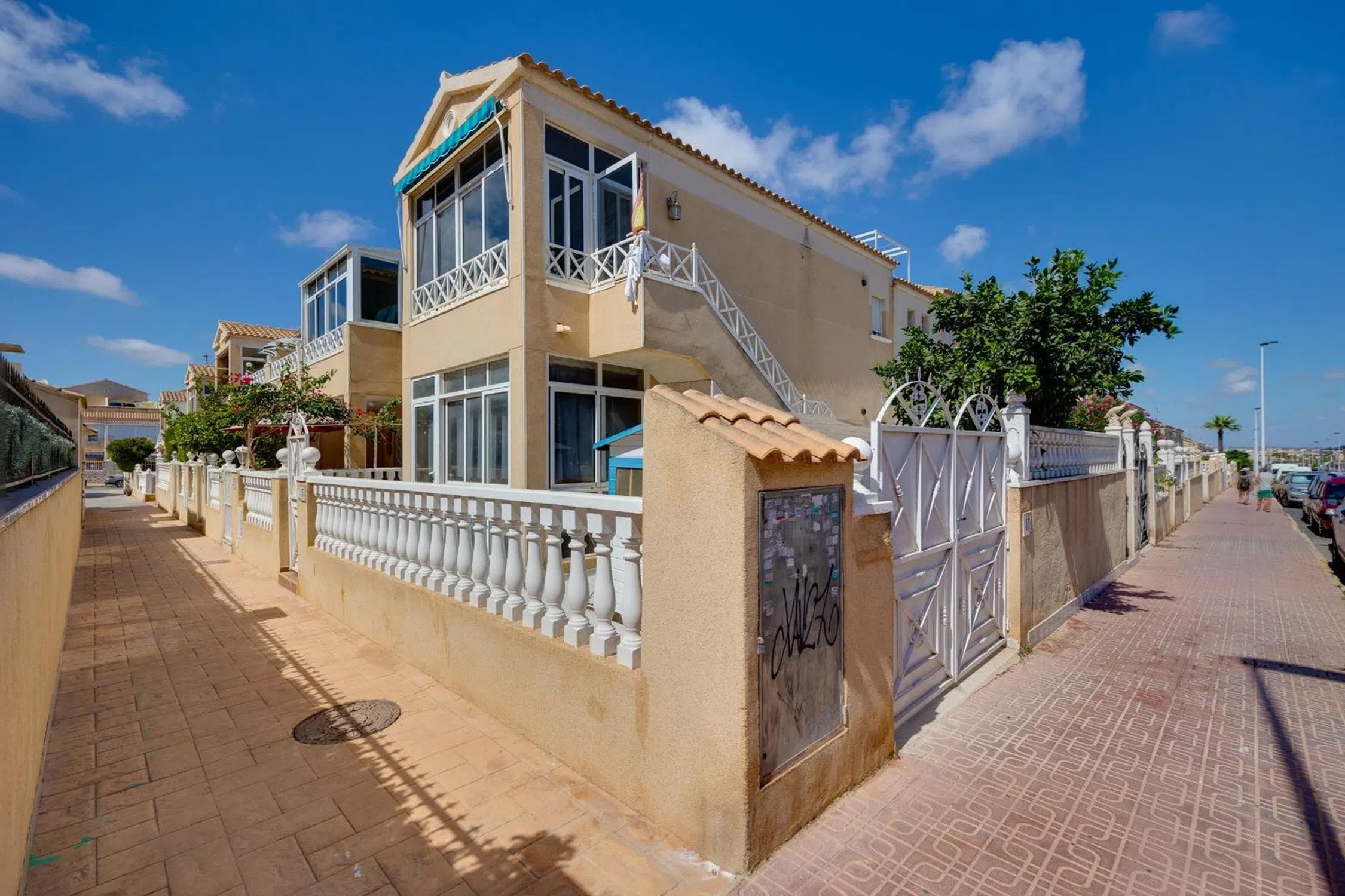 Descubre este encantador chalet tipo dúplex situado en el corazón del residencial Europa, un lugar ideal para vivir todo el año. En la planta baja, te recibe un acogedor jardín delantero de aproximadamente 15 m² que invita a disfrutar del clima mediterráneo. El amplio salón comedor es perfecto para relajarte o recibir visitas, mientras que la cocina independiente está completamente equipada y cuenta con un práctico patio trasero cerrado. Además, hay un aseo conveniente en esta planta. Subiendo a la planta alta encontrarás dos luminosos dormitorios, uno de ellos dispone de una preciosa terraza acristalada donde podrás deleitarte con las vistas al entorno natural. También se encuentra aquí un baño completo equipado con todas las comodidades necesarias. Para completar esta maravillosa propiedad, disfruta del solárium privado adicional de unos generosos 15 m². ¡el espacio ideal para tomar el sol o organizar barbacoas! La comunidad ofrece acceso a una refrescante piscina perfecta durante los meses más cálidos y todos los servicios esenciales están al alcance de tu mano. No pierdas la oportunidad única y exclusiva de hacer realidad tus sueños e invertir en calidad vida! SERVICIO POST-VENTA ÚNICO: Nos encargamos de todos los trámites burocráticos por usted. ¡Le regalamos los cambios de titularidad de agua, luz, comunidad, Catastro y basuras! para que no tenga que preocuparse por nada. HABLAMOS SU IDIOMA: Español, English, Polski, Українська, Русский. El precio incluye los honorarios de la agencia. Gastos de compraventa (Impuestos, Notaría y Registro) no incluidos.