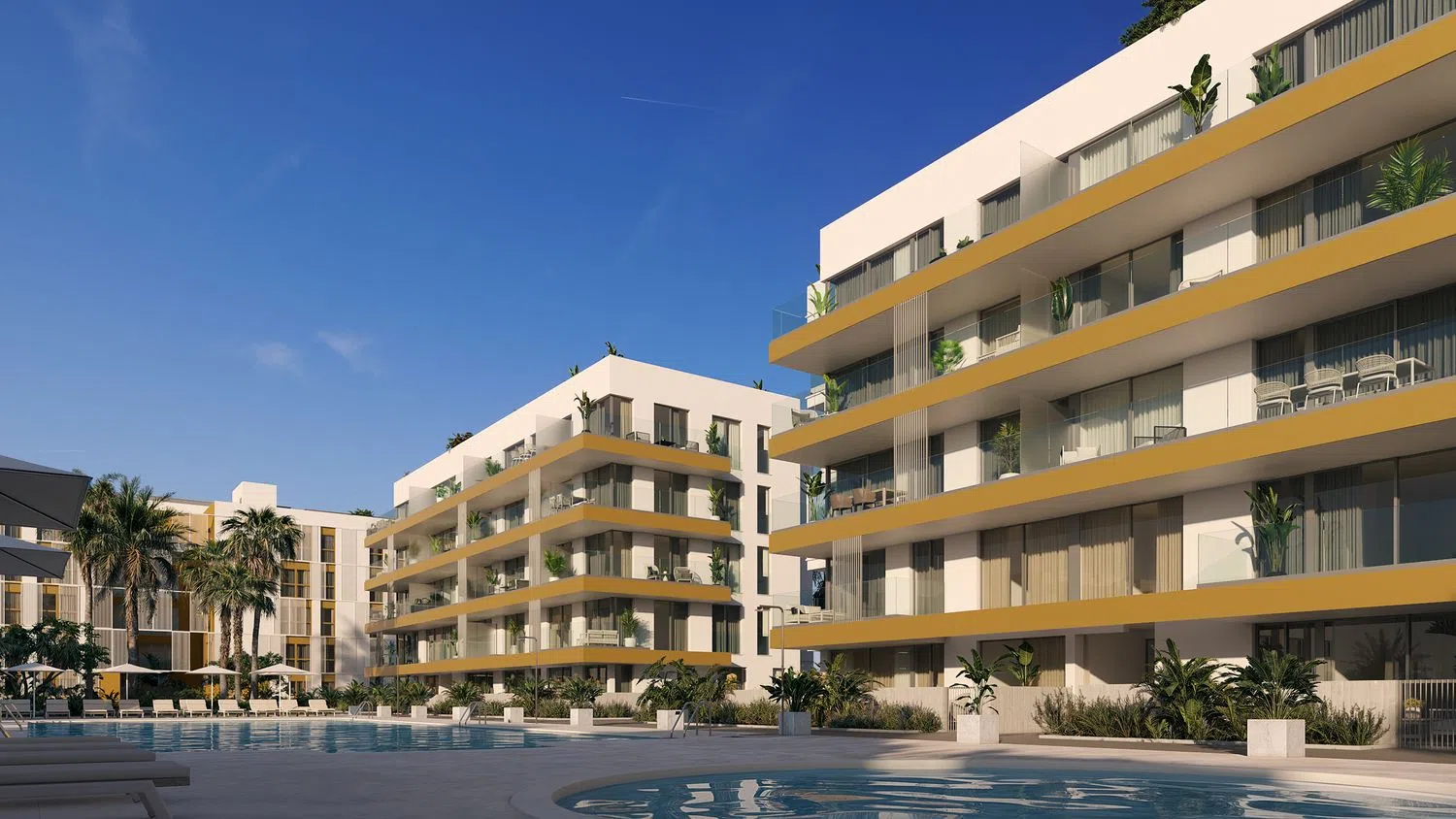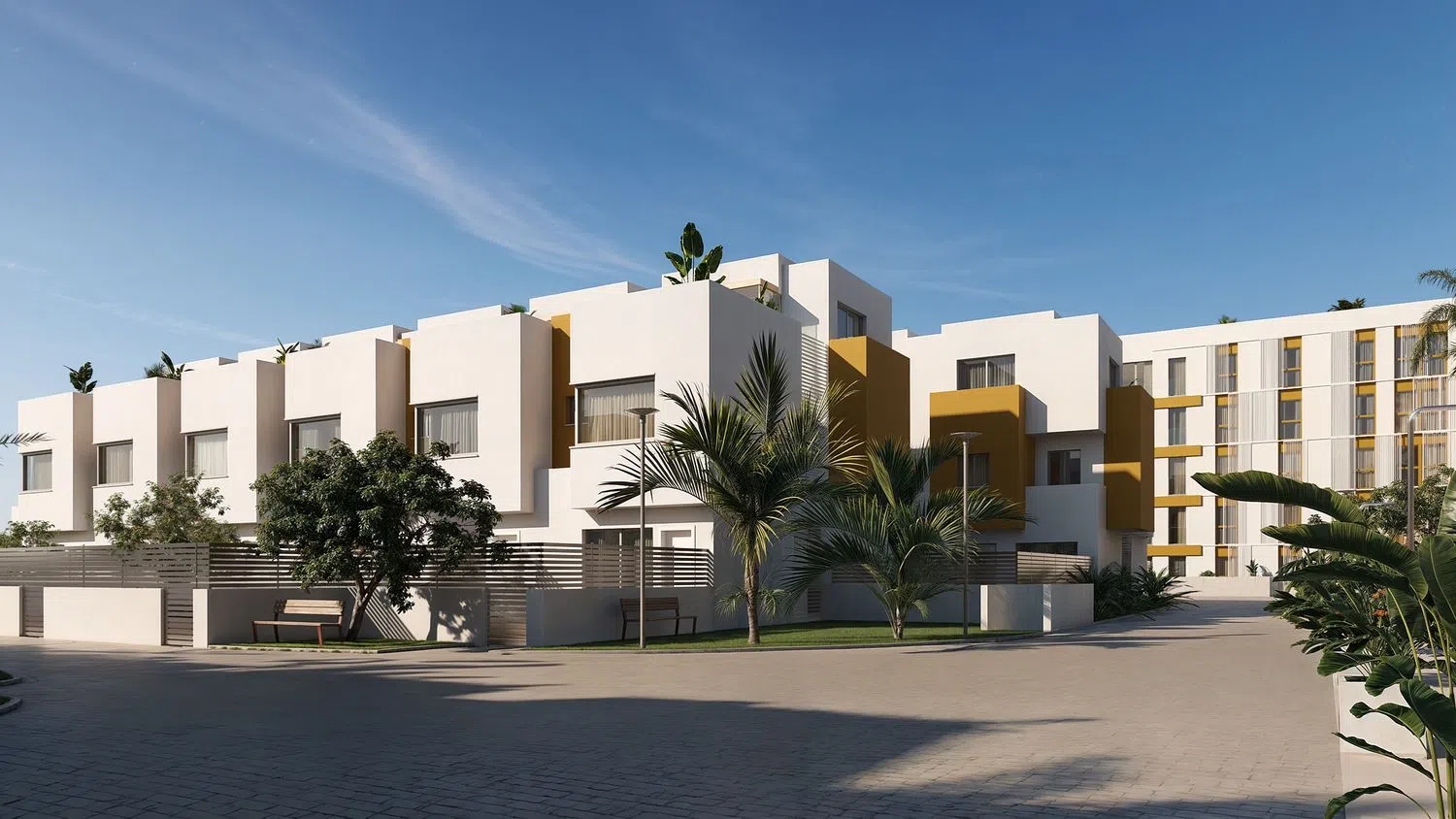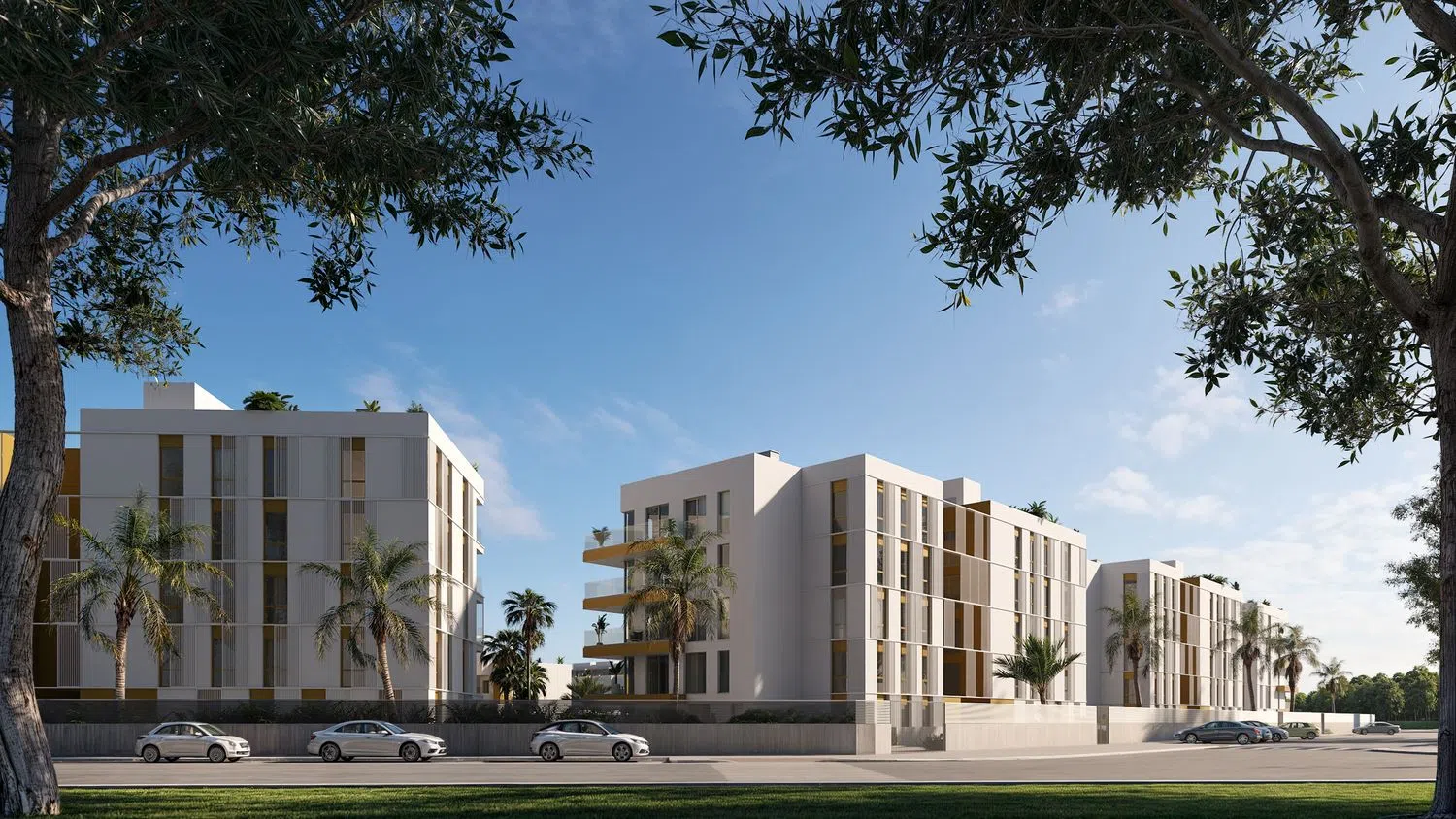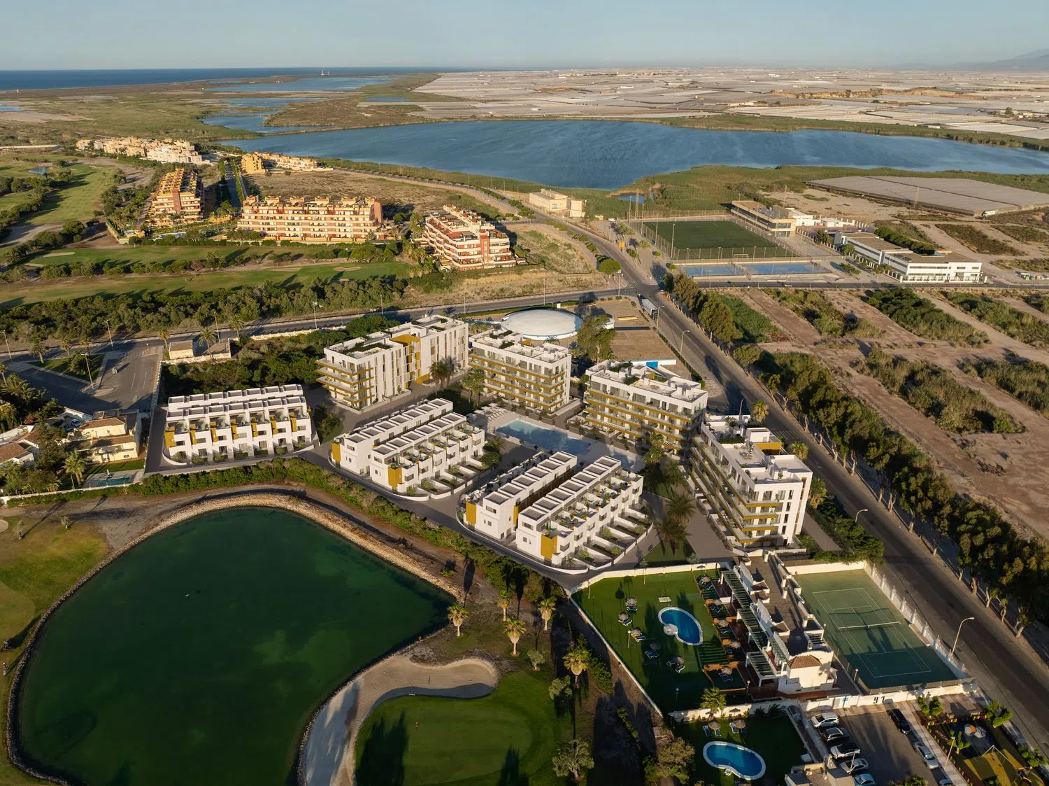 De aanbieding omvat 156 residentiële woningen, uitgerust met een gemeenschappelijk zwembad en aangelegde tuinen. De panden zijn georganiseerd in vier blokken van 4 verdiepingen, met opties van 1, 2 en 3 slaapkamers, naast parkeergelegenheid. Er zijn ook 40 geschakelde woningen van 4 slaapkamers met privé tuin. Gelegen dicht bij de zee en naast een golfbaan, biedt deze locatie een uitstekende combinatie van rust en nabijheid tot de hoofdstad dankzij de snelweg. Het is een uitstekende keuze voor wie op zoek is naar een goed gelegen woning.