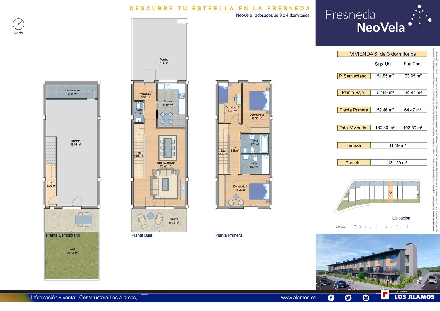 Fresneda Neovela es la nueva promoción situada en el anillo 7 de la Urbanización La Fresneda. Fresneda Neovela es una hilera compuesta de 14 viviendas que cuenta con tres y cuatro dormitorios, dos baños y un aseo, cocina y salón con salida a terraza. La planta sótano, la que estará destinada a trastero o usos varios, tendrá acceso al jardín.Fresneda Neovela contará con la máxima calificación energética A.Si estás buscando una vivienda con jardín en un entorno natural y familiar, junto a un Club de Campo (piscinas, actividades deportivas y restaurante) y con todos los servicios cerca (centro de salud, colegio, instituto, farmacia, supermercados…), ven Fresneda Neovela.*Imágenes provisionales.