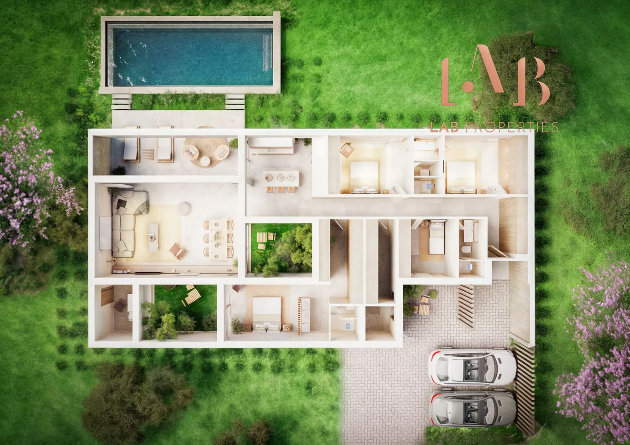 Chalet unifamiliar con piscina privada, 4 habitaciones, 3 de ellas doble y una simple, una de las dobles con baño en suite, total de 2 baños y un aseo. Parking para dos coches.