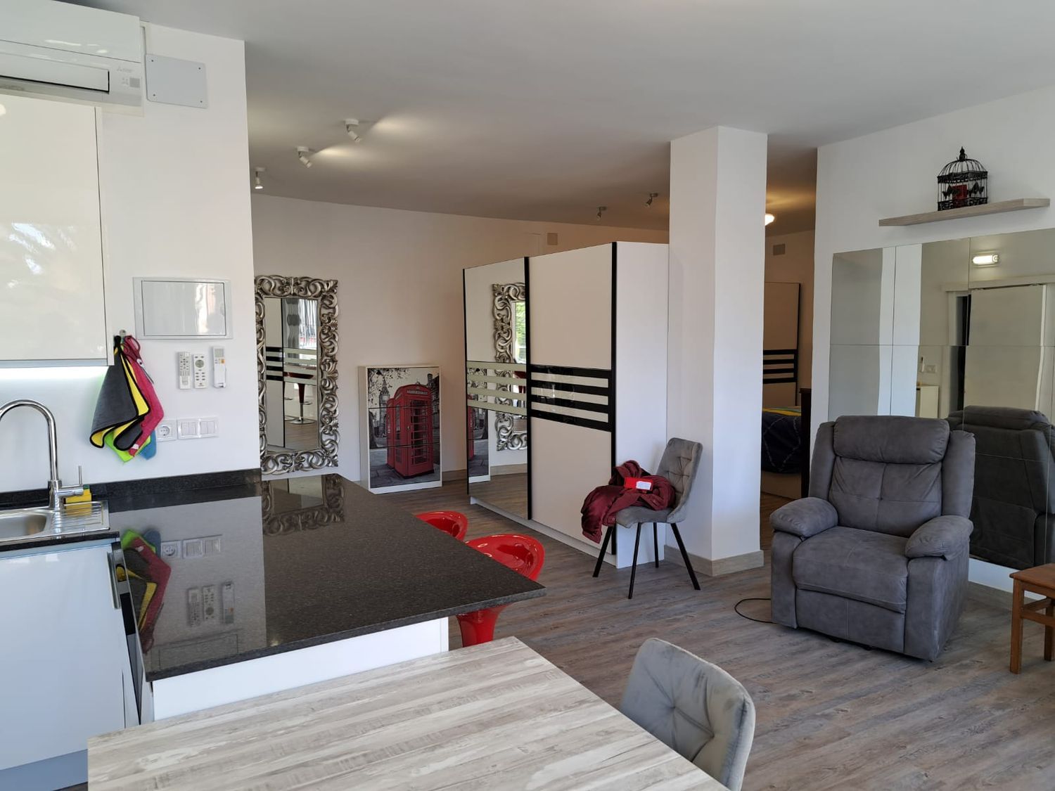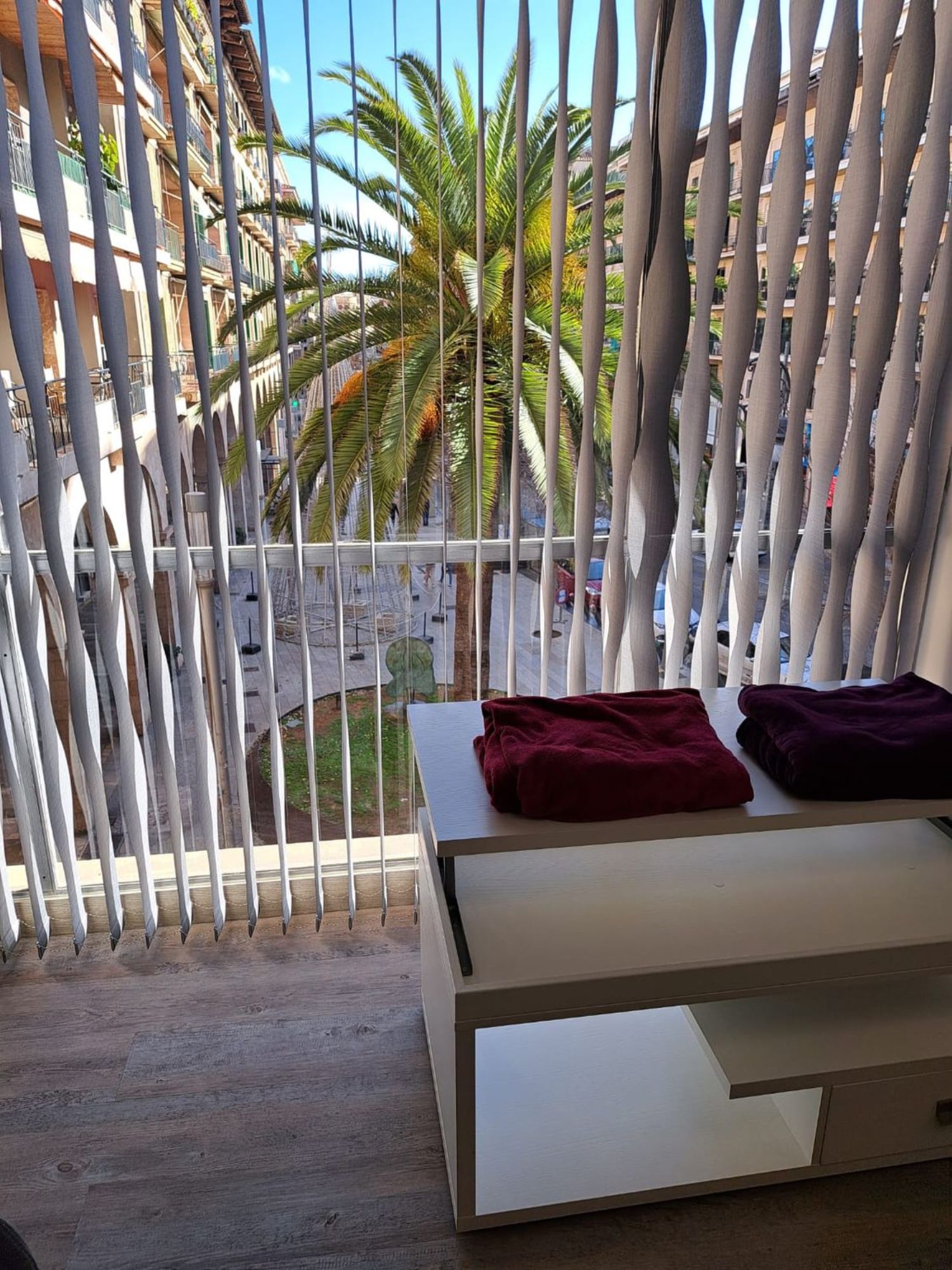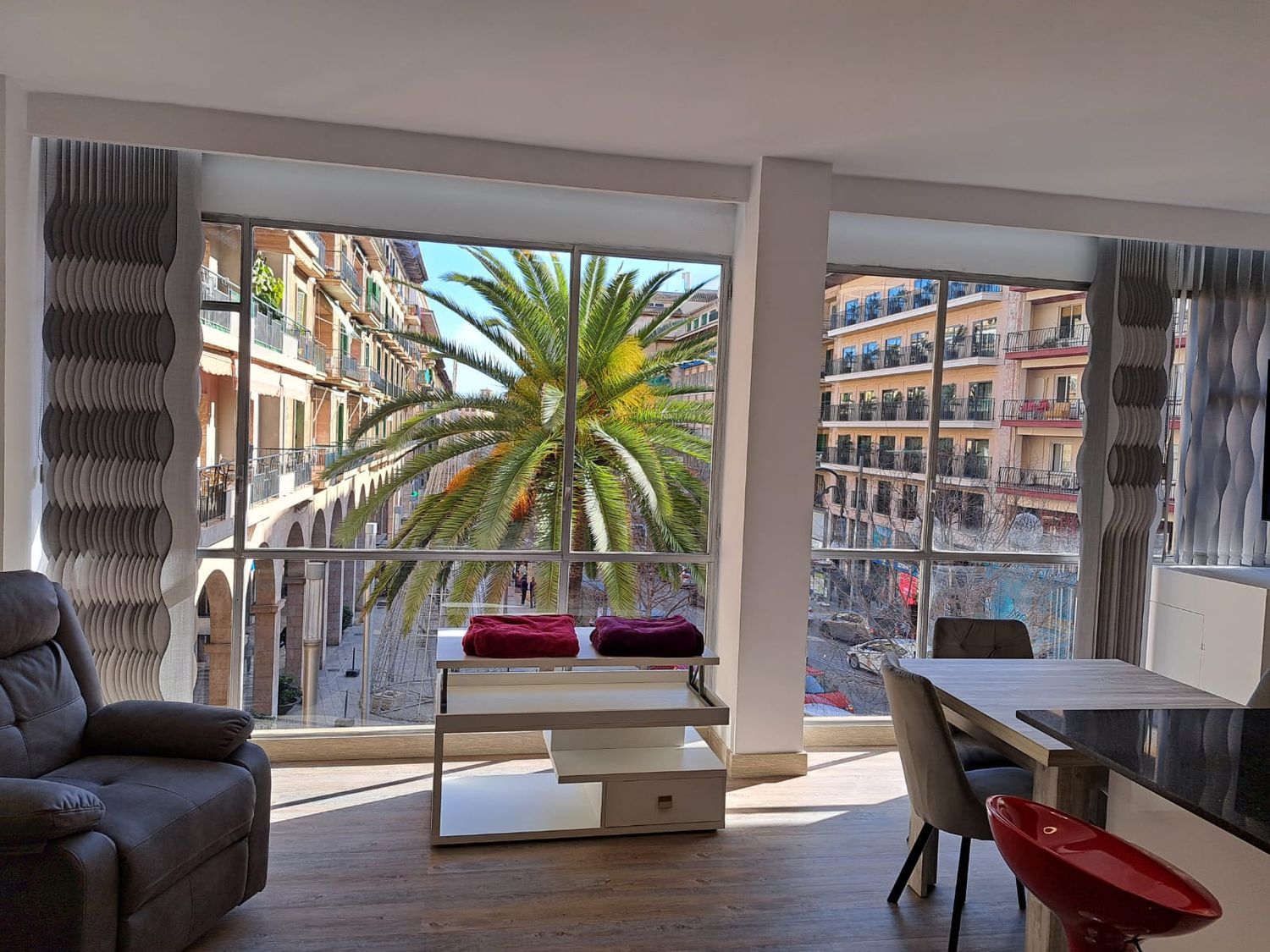 Precioso loft diáfano, una habitación con cama de 1,80 cts. , salón todo amueblado, esta impecable, con smarttv, internet, mucho almacenaje, todo nuevo a estrenar, aire acondicionado mitsubishi, muy buenas vistas al corte ingles y jaime III, a la altura del edificio nakar, con portero físico. Muchos extras.