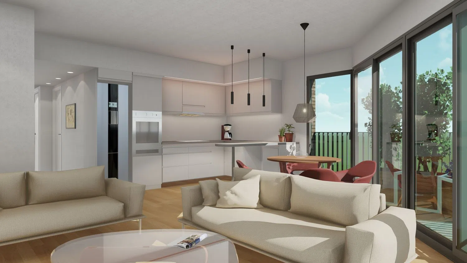 De appartementen, met een oppervlakte van ongeveer 91 m², beschikken over een optimale indeling met drie slaapkamers, waaronder een suite met balkon en twee tweepersoonskamers, evenals twee complete badkamers. Daarnaast heeft elk appartement een ruime woon-eetkamer met een open keuken die uitkomt op een groot terras. Deze panden zijn ontworpen om zonnige en lichte sferen te garanderen doordat de meeste ruimtes naar buiten gericht zijn.
