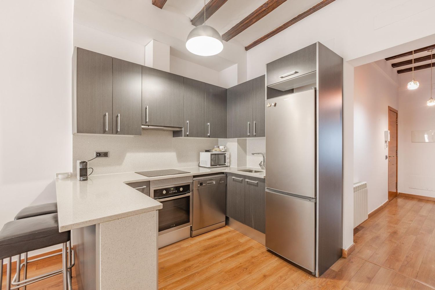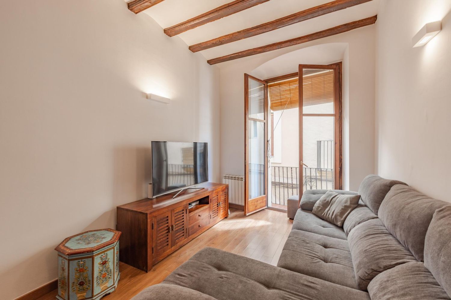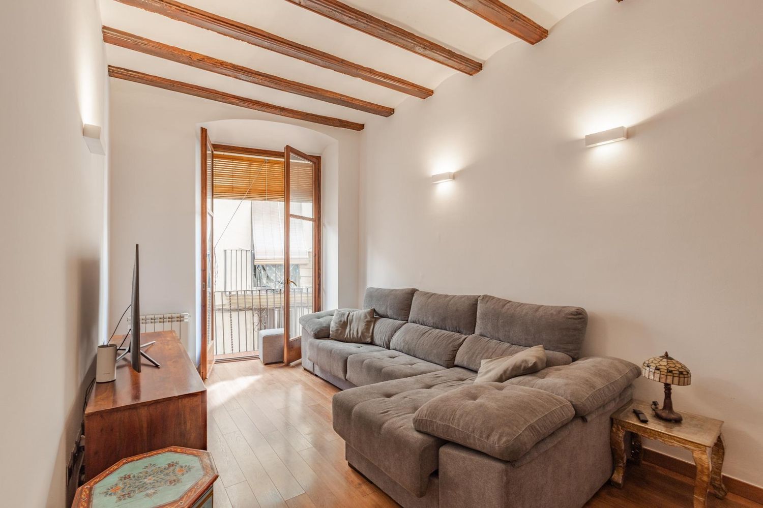 Este piso te enamora nada más verlo. Se trata de una vivienda con mucho encanto en una finca totalmente rehabilitada en el casco antiguo de Vilanova i la Geltrú. Sólo entrar al portal te das cuenta que estás en un edificio con historia, que conserva la esencia original pero con elementos actuales. Se trata de un primer piso con ascensor, de techos altos con vigas de madera y suelos de parqué. Dispone de 2 habitaciones dobles, 2 baños, un vestidor, una zona estudio y un amplio salón comedor con cocina abierta. Tiene un balcón que da a la calle peatonal y una terraza interior más íntima para disfrutarla todo el año. Los acabados son de calidad y se nota, pues nada más entrar sientes su confort y calidez. Este piso dispone de calefacción por radiadores de gas y gracias a su distribución podrás disfrutar de ventilación cruzada para refrescar la vivienda en los días cálidos. Si crees que este puede ser tu hogar, no lo dudes y agendemos una visita. ¡Te sorprenderá! ** El precio indicado no incluye mobiliario ni gastos e impuestos derivados de la compraventa. **.