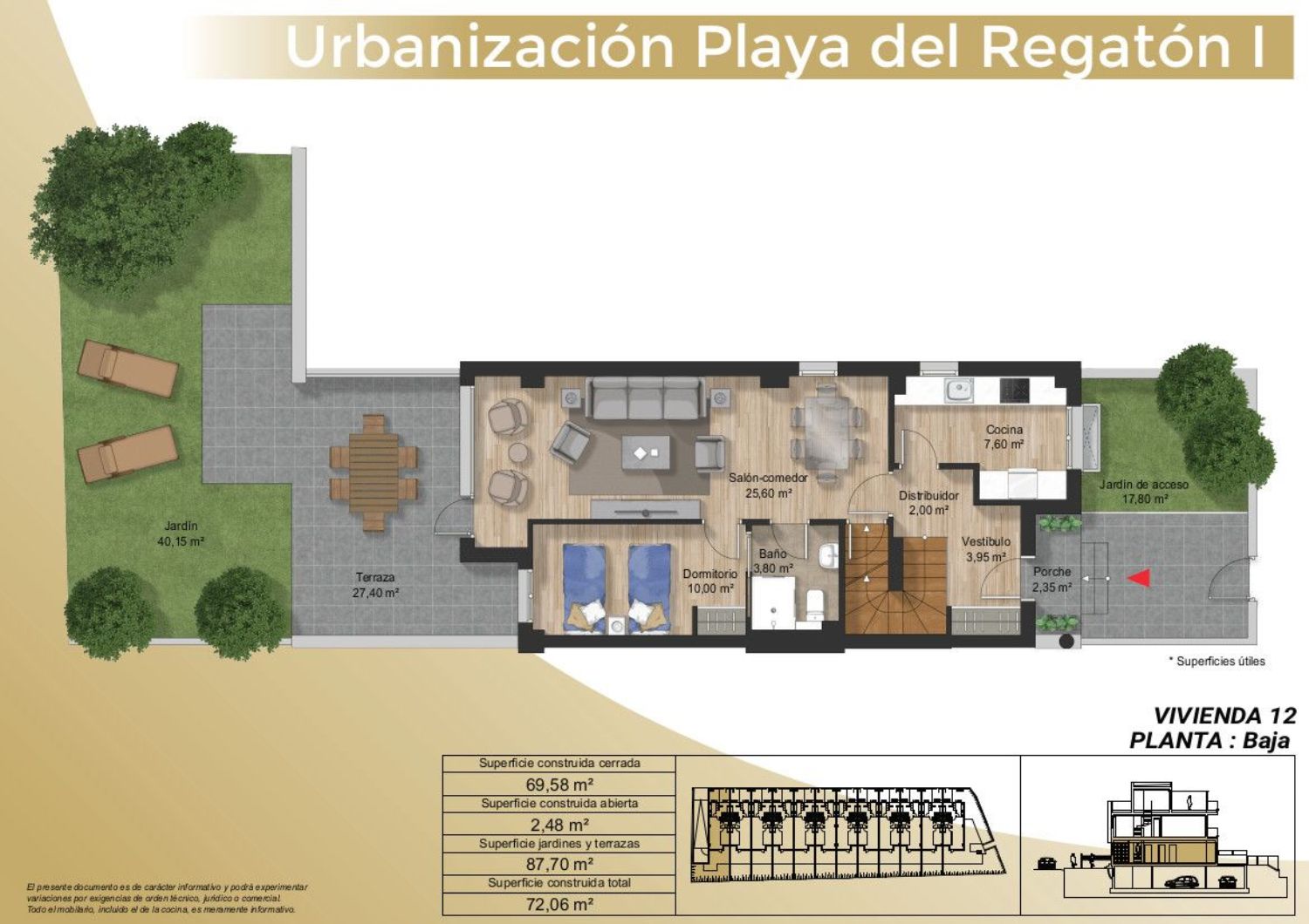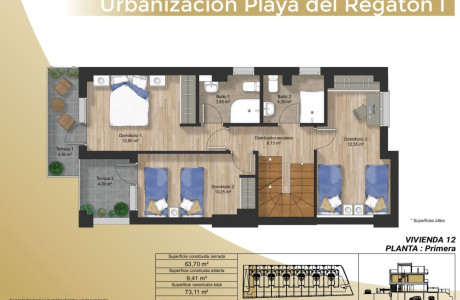 Playa del Regatón es una espectacular promoción inmobiliaria de 12 chalets pareados en la hermosa localidad de Laredo, Cantabria. Con una ubicación privilegiada, cerca de la playa y rodeada de impresionantes paisajes naturales, esta promoción es el lugar ideal para aquellos que buscan un hogar rodeado de tranquilidad, naturaleza y belleza.Cada uno de los 12 chalets pareados cuenta con una superficie de más de 200 metros cuadrados, distribuidos en tres plantas más garaje, y están construidos con materiales de primera calidad que garantizan el mayor confort térmico y acústico.La promoción tiene fachada ventilada y sistema de aerotermia para garantizar el mayor ahorro energético posible así como el cuidado del medio ambiente.Las plantas de cada chalet se distribuyen de la siguiente forma:Planta de Sótano: Garaje privado / TrasteroPlanta Baja: Habitación, baño, salón-comedor, cocina, jardín y terraza con orientación al sur.Planta Primera: Tres dormitorios, dos baños y terraza con orientación al sur.Ático: Solárium con orientación al sur y sala de estar.Además, cada chalet dispone de amplias terrazas para disfrutar del sol, así como una habitación en planta baja. También incluyen hermosos jardines privados con orientación al sur para relajarse al aire libre.En la parte superior de los chalets, encontrarás un fabuloso solárium con orientación sur donde podrás disfrutar de la brisa marina y del sol en privado.La ubicación de Playa del Regatón es perfecta para aquellos que buscan una vida tranquila y relajada cerca del mar. Los chalets están situados a la altura de la zona Ever, por lo que dispone de hostelería y servicios a poca distancia. Además, está a 400 metros del Hospital de Laredo y cercano al Colegio Pablo Picasso.La localidad de Laredo es un destino turístico popular durante todo el año y cuenta con una amplia variedad de actividades para disfrutar.Si buscas un hogar en un entorno natural impresionante, cerca del mar y en una zona tranquila pero bien comunicada, Playa del Regatón es la elección perfecta para ti. ¡No pierdas la oportunidad de disfrutar de una vida llena de comodidades en uno de los lugares más hermosos de Cantabria! Contacta con nosotros para obtener más información sobre esta magnífica promoción.