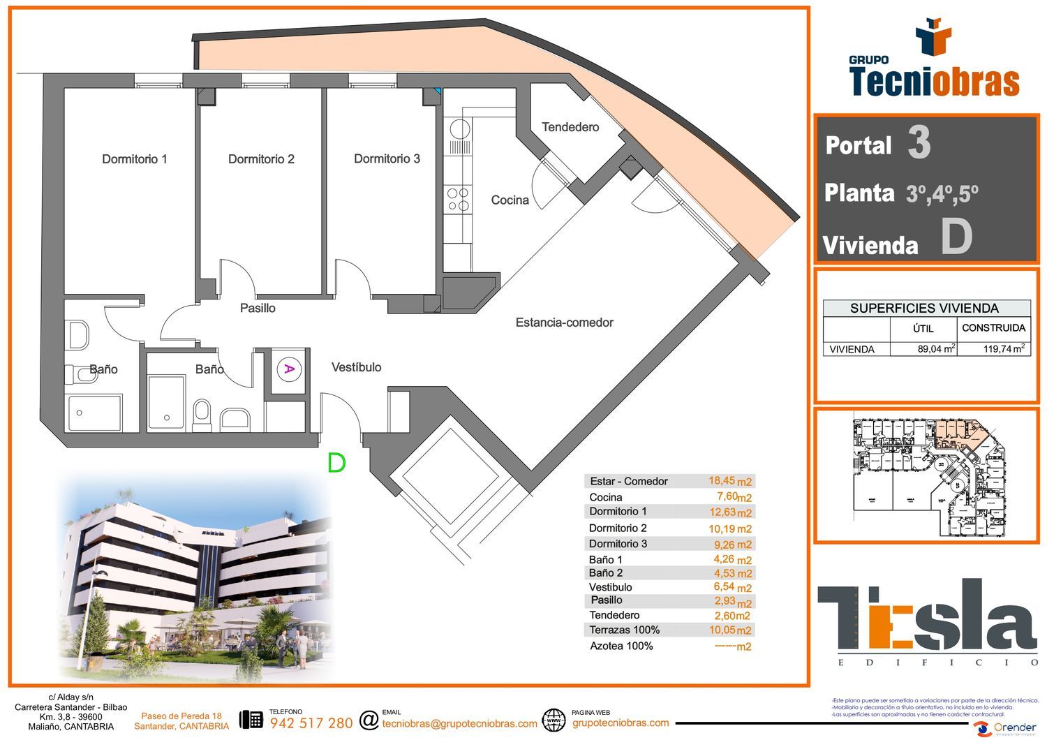 EDIFICO TESLA está ubicado en Peñacastillo, una de las nuevas zonas de desarrollo urbanístico de Santander; este espacio residencial ha sufrido en los últimos años una gran transformación para dotarlo de servicios públicos, transporte urbano, centros deportivos, parques y zonas infantiles, además de viales de acceso desde dos autovías e infinidad de nuevos comercios y locales de ocio. Las características de construcción de EDIFICIO TESLA son extraordinarias. Llaman la atención el diseño vanguardista de sus fachadas -que proporcionan un alto aislamiento térmico y acústico la disposición de terrazas y zonas exteriores, los innovadores materiales de construcción o el empleo de energías renovables. Sus 80 viviendas, de 1/2/3 dormitorios, han sido diseñadas para la optimización de los espacios interiores y el aprovechamiento de luz natural a través de las amplias terrazas.La eficiencia y el ahorro energético son también importantes factores que tienen como objetivos la reducción de los costes de mantenimiento de las viviendas y la minimización de la contaminación medioambiental; todo un desafío en la construcción residencial del siglo XXI. Plaza de garaje y trastero OPCIONAL.