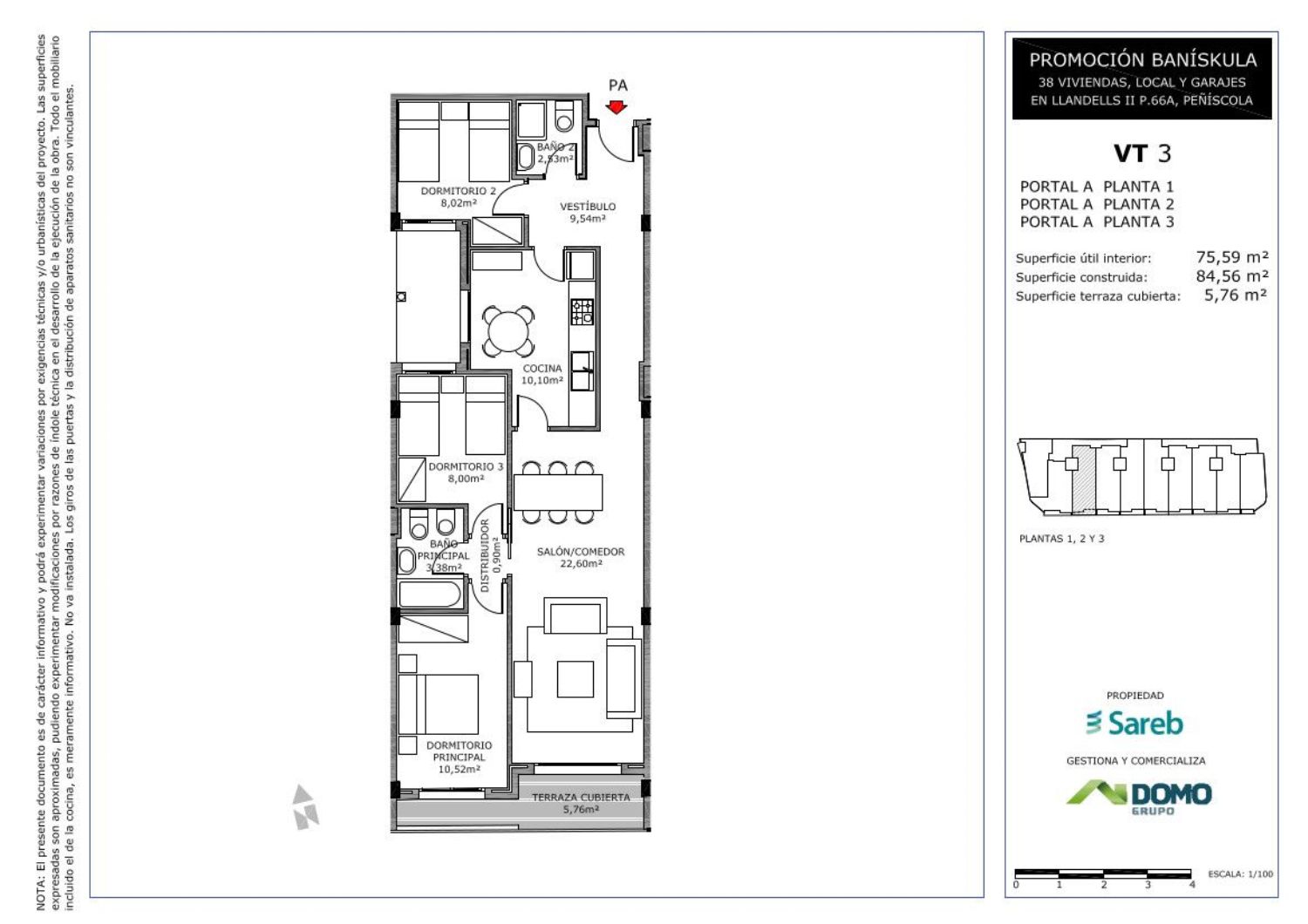 Promoción de 38 viviendas en altura de 3 y 4 dormitorios, con 33 plazas de garaje, 5 plazas de moto y un local comercial situada en la calle Landells 16, de Peñíscola. En un edificio de 4 plantas sobre rasante y una planta sótano.El total de viviendas, 32 son de 3 dormitorios y 6 de 4 dormitorios. Todas cuentan con terrazas.Promoción propiedad de Sareb.Peñíscola se ubica al Norte de la Comunidad Valenciana, en un punto privilegiado del Mediterráneo español. Es un municipio en la costa de Castellón, a 50 km al norte de esta ciudad. Es una importante zona turística, especialmente en verano.El edificio se encuentra en la calle Llandels 16, a unos 7 minutos andando de la Platja de Peñíscola y a 9 minutos de la Platja del Migjorn situada junto al puerto. Ponte en contacto con nosotros para ampliar información o reservar vivienda. También puedes pinchar en el enlace de nuestra página Web y dejarnos tus datos, para ponernos en contacto contigo.Algunas viviendas incorporan plaza de garaje con un precio adicional de 7.000 € + IVA.