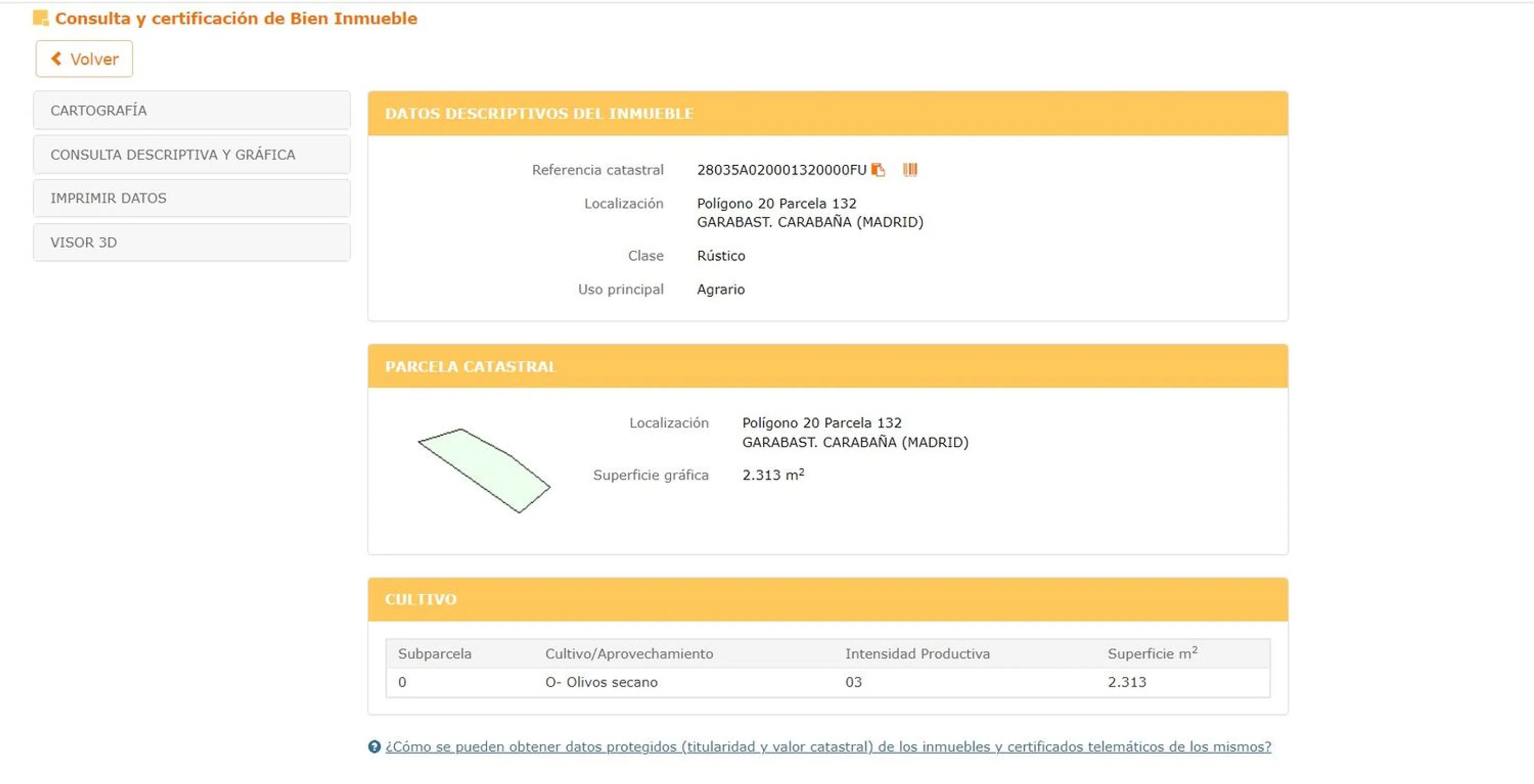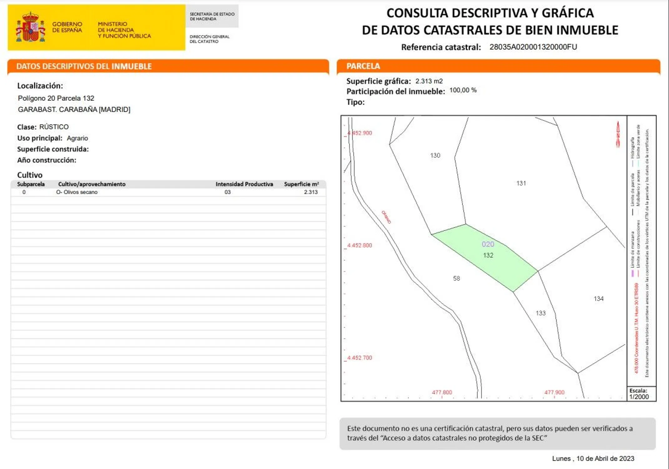 Vendo Terreno Rústico Vendo terreno de 2313 m2. Destinado al cultivo de olivos. Junto a camino. A unos 3,4 km de Carabaña.