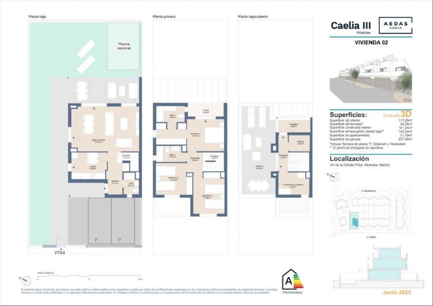 LICENCIA CONCEDIDA. OBRA INICIADADescubre tu nuevo chalet en Caelia III y disfruta de tu independencia en una vivienda donde la calidad y la sostenibilidad son una constante. 23 viviendas de 3 dormitorios en dos plantas, ubicación perfectamente consolidada y cercana a la salida de la carretera M-506, M-50 y R-5. Caelia III está rodeada de centros educativos, deportivos, centros comerciales y amplias zonas verdes. Además dispone de un jardín y parking privado y solárium en cubierta. Tu nuevo chalet también permite incorporar una piscina independiente para que disfrutes de un relajante baño con total intimidad. En cuanto a eficiencia energética, Caelia III destaca por contar con suelo radiante-refrescante y aerotermia.