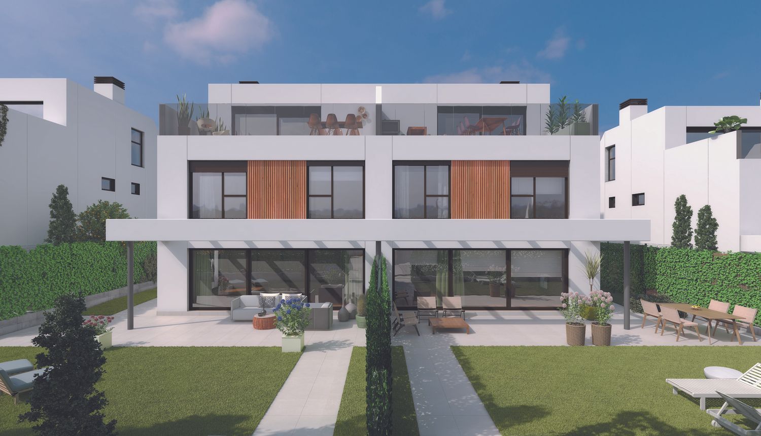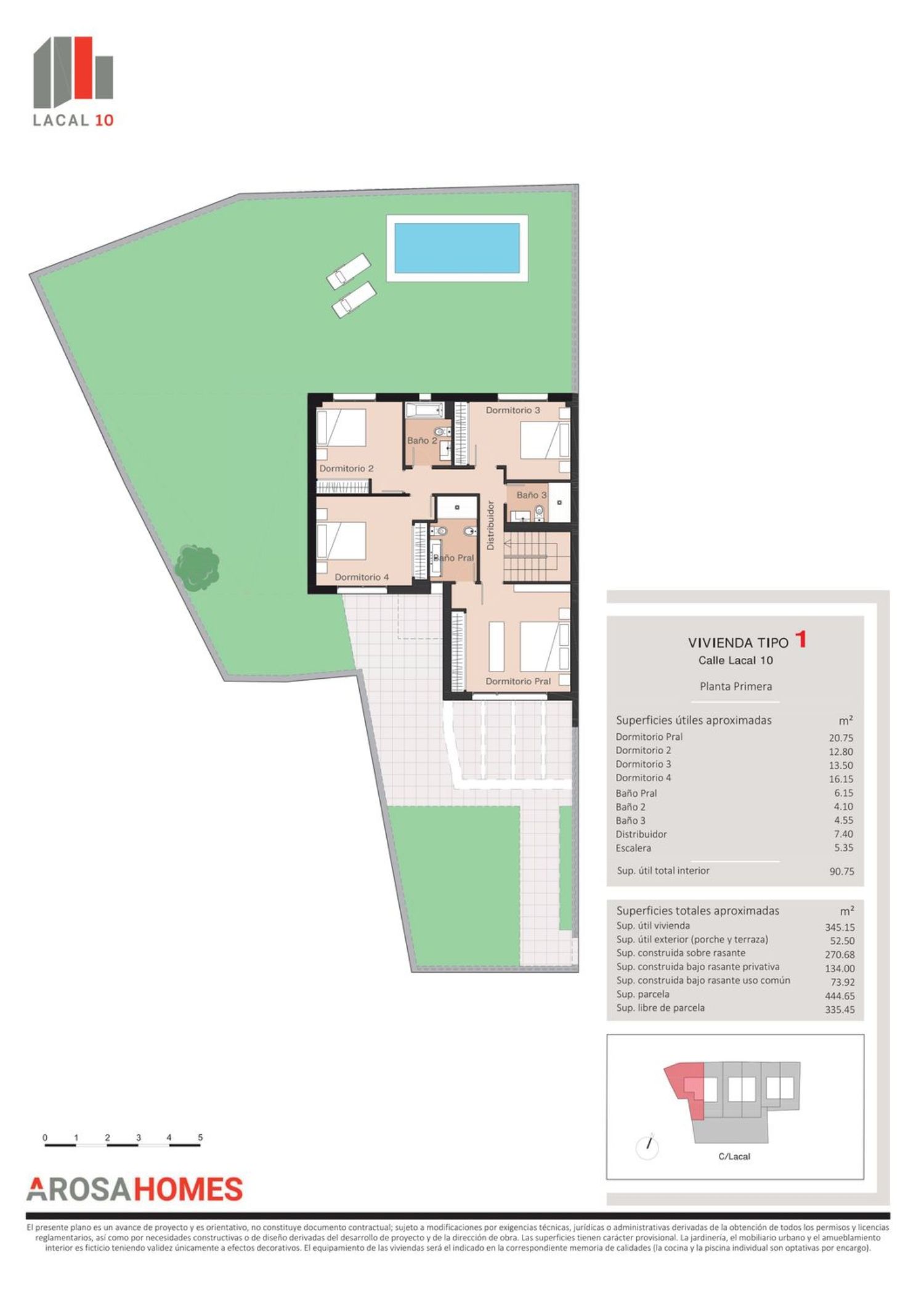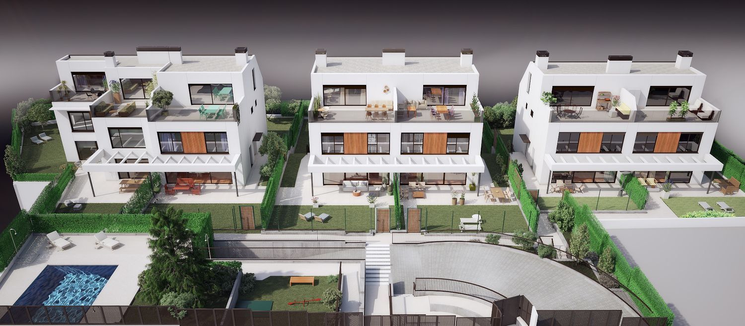 Obra nueva LACAL 10, pareados de 5 habitaciones, parcela común. Zona Pueblo, Pozuelo de Alarcón.LICENCIA CONCEDIDA, INICIO DE OBRAS JULIO 2023. LACAL 10 es una promoción de obra nueva que consta de 6 exclusivos pareados de 5 habitaciones en parcelas independientes de 260m2 a 440m2 con amplios jardines privados, y ubicada en una localización privilegiada. Cada vivienda dispone de 2 - 3 plazas de aparcamiento en planta sótano. Las viviendas cuentan con unas superficies construidas desde 312m2 hasta 404m2, repartidas en planta sótano, planta baja, planta primera y planta bajo cubierta. Además disponen de una terraza-solarium de 26m2 a 32m2 en planta bajo cubierta, y de porche exterior solado con pérgola al que se accede desde el salón, dando continuidad al jardín privado que en todas las viviendas tiene tres orientaciones (los salones con orientación sur), garantizando una óptima exposición solar. Piscina individual y cocina no incluidas, pudiendo contratarse por encargo.La promoción tiene un cuidado diseño que combina estética, calidad y funcionalidad, con un sistema constructivo sin pilares que posibilita un aprovechamiento óptimo del espacio en todas las estancias. La climatización de las viviendas será mediante sistema de aerotermia frío-calor que se distribuye por suelo radiante. Las viviendas cuentan con certificación energética “A” LACAL 10 incluye una parcela común para el uso exclusivo de las 6 viviendas, que contará con una piscina y zona ajardinada. La promoción tiene una localización privilegiada, se ubica en una calle muy tranquila en un entorno totalmente consolidado, en el corazón de la Zona Pueblo de Pozuelo. Cuenta con gran oferta de servicios a los que acceder andando, como centros educativos (San Luis de los Franceses, Liceo Sorolla, Escuelas Pías San Fernando, Kensington School, San José de Cluny), supermercados, tiendas, restaurantes, parques, instalaciones deportivas (Pozuelo pádel club), farmacias, centro de salud, etc. Las viviendas están muy bien comunicadas, con fácil acceso a la A-6, M-40, M-515 y M-503.