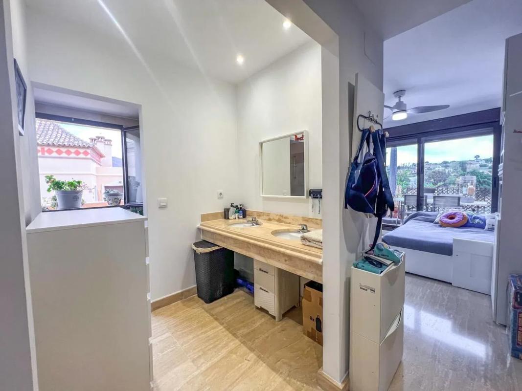 Impresionante ático dúplex con vistas al mar y golf. Con 3 dormitorios, 3 baños, terraza acristalada y solárium. Situado en un complejo cerrado en Estepona con jardines y dos piscinas (incluida piscina para niños). Ubicado en una de las mejores zonas de Estepona, entre dos campos de golf y cerca de la playa, comercios, colegios y el nuevo Hospital de Estepona. El ático se distribuye en dos niveles conectados por elegantes escaleras. Nivel principal: hay una sala de estar y un comedor de planta abierta con chimenea y acceso directo a una terraza totalmente acristalada con impresionantes vistas, perfecta para disfrutarla y comer al aire libre durante todo el año. La cocina independiente está totalmente equipada con electrodomésticos de primera calidad y cuenta con un lavadero independiente. Dos de los tres dormitorios se encuentran en este nivel, uno de ellos en suite con acceso directo a la terraza. Nivel superior: El amplio dormitorio principal tiene baño privado y acceso al espacioso solárium con impresionantes vistas panorámicas a las montañas, el mar y el golf. Las calidades incluyen A/C, armarios empotrados, suelos de mármol, electrodomésticos de primera calidad, zona de lavado independiente. Además, el apartamento cuenta con una plaza de aparcamiento subterráneo (con acceso en ascensor) y un trastero. Este impresionante ático está situado en una urbanización cerrada cerca de los mejores clubes de golf, con fácil acceso a Estepona, las playas y el puerto. También está a 5 minutos en coche de las autopistas A-7 y AP-7 que conectan Marbella y toda la Costa del Sol. Contáctenos para más información o concertar visita.