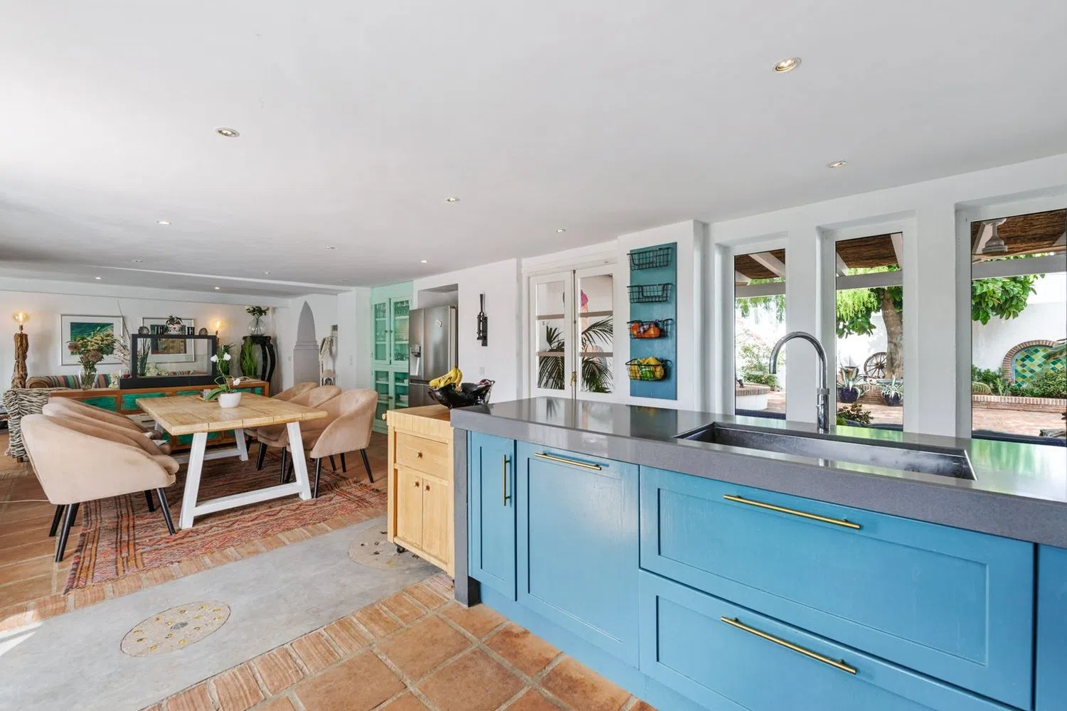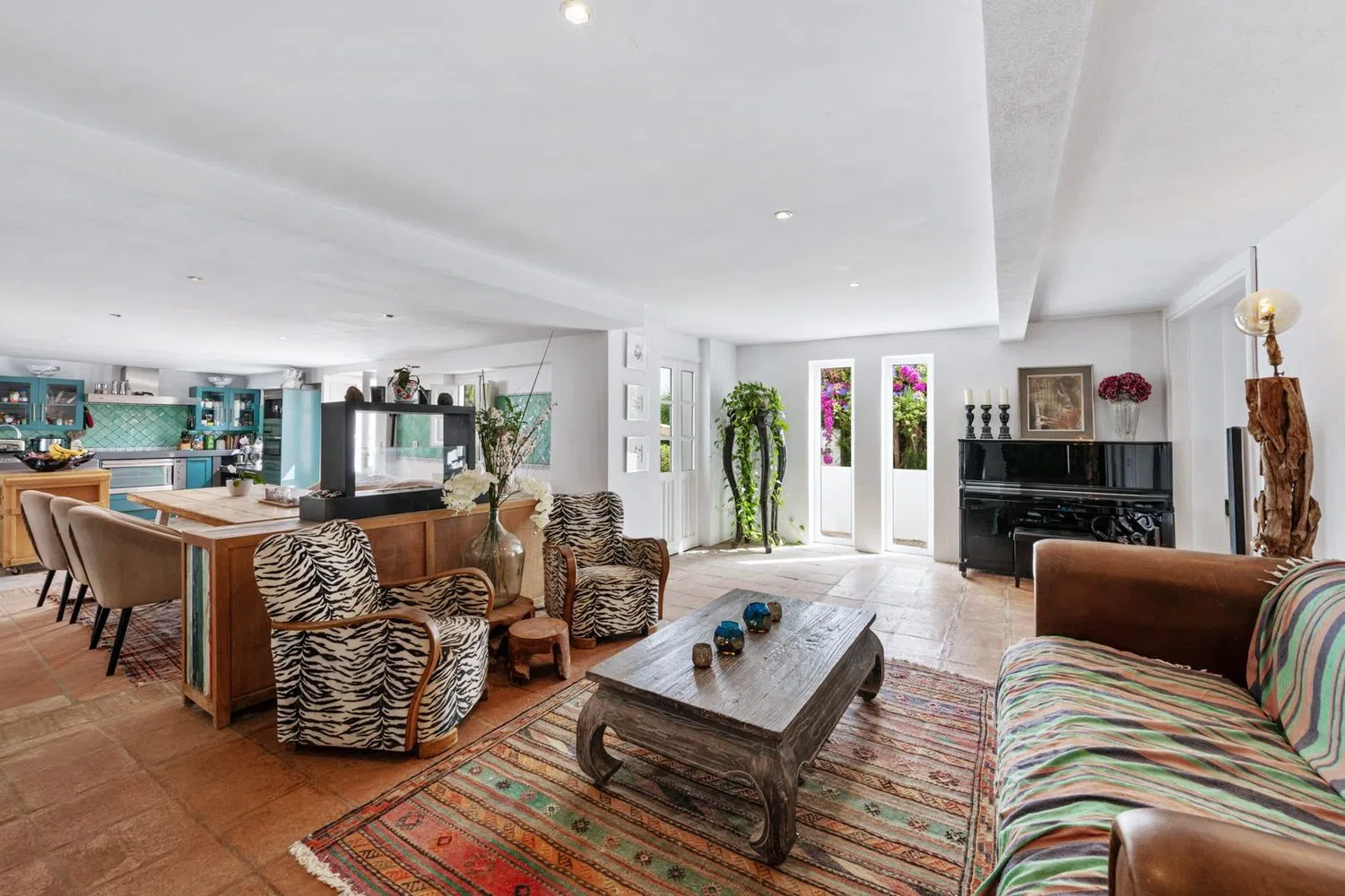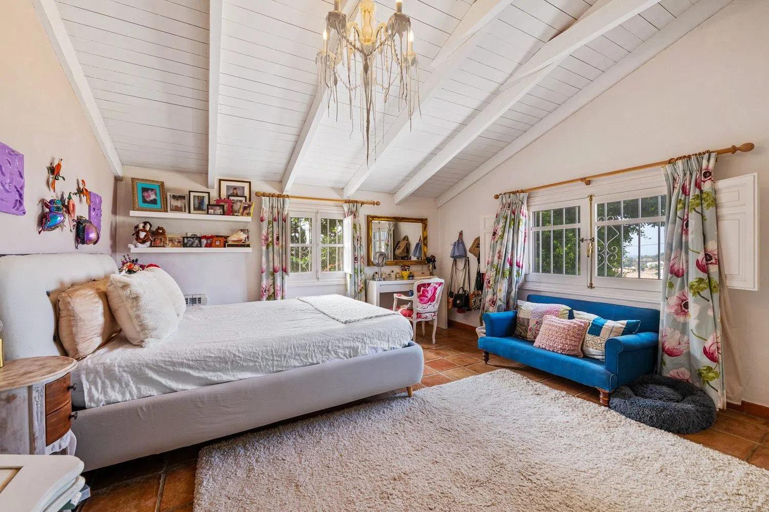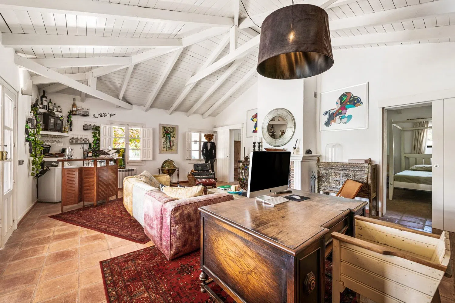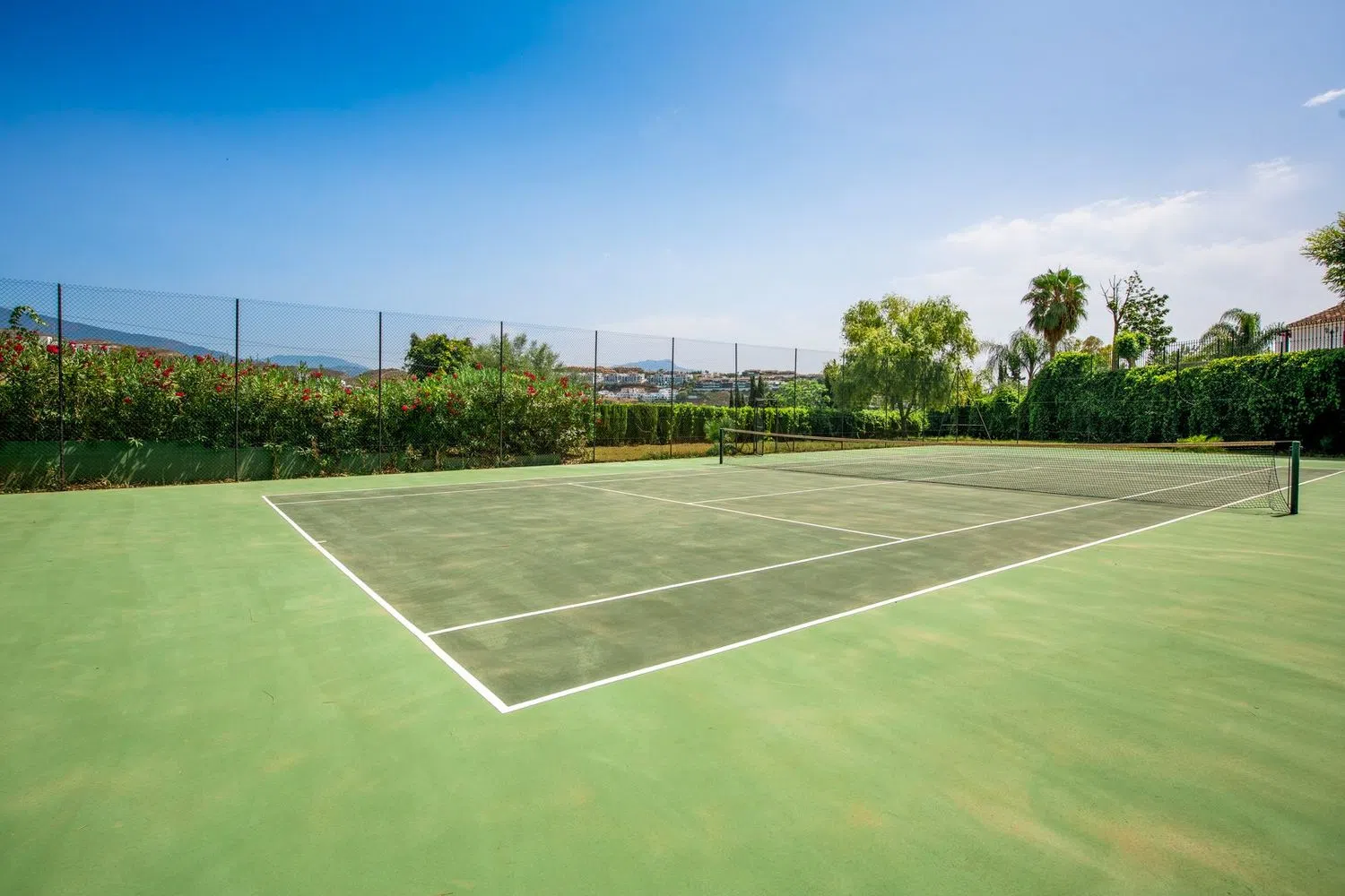 De villa beschikt over een ruime inkomhal met een gezellige open haard, die leidt naar een ruime woon- en eetkamer, samen met een volledig uitgeruste keuken voorzien van hoogwaardige apparatuur. De begane grond omvat ook een televisiekamer met open haard, twee gastenkamers met en-suite badkamers, een gastentoilet en een wasruimte. Diverse terrassen bieden directe toegang tot de uitgestrekte tuin en het zwembadgebied. De hoofdslaapkamer beschikt over een inloopkast en de andere twee gastenslaapkamers hebben ook een eigen badkamer. Naast het zwembad biedt een onafhankelijk gastenhuis een woonkamer, twee extra gastenslaapkamers met privébadkamers en een eigen overdekt terras. De woning bevindt zich op een groot perceel van meer dan 6.000 m² met verzorgde tuinen, een privé verwarmd zwembad, een jacuzzi, meerdere chill-out zones, een barbecuegedeelte en een tennisbaan. Extra voorzieningen zijn onder andere een gym, een sauna, airconditioning met verwarming, zonnepanelen voor warm water met nieuw geïnstalleerde boilers en een diepe put (100m). Er is privé parkeergelegenheid voor 2 auto's.