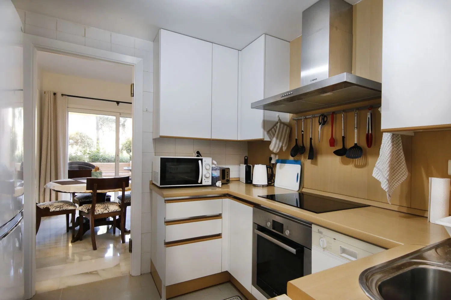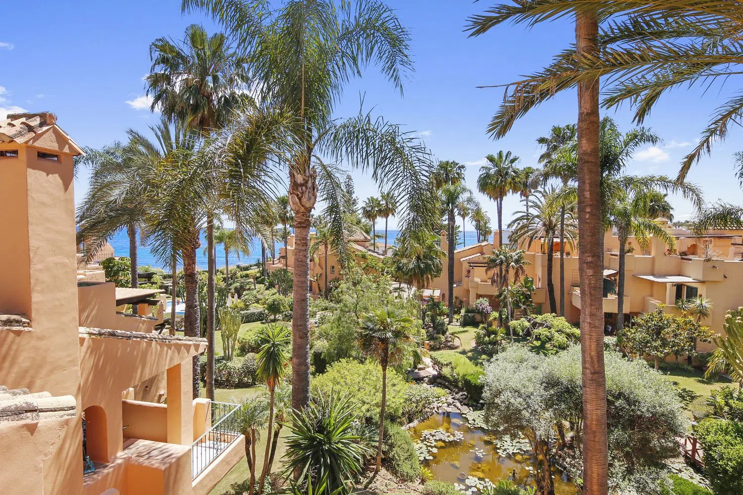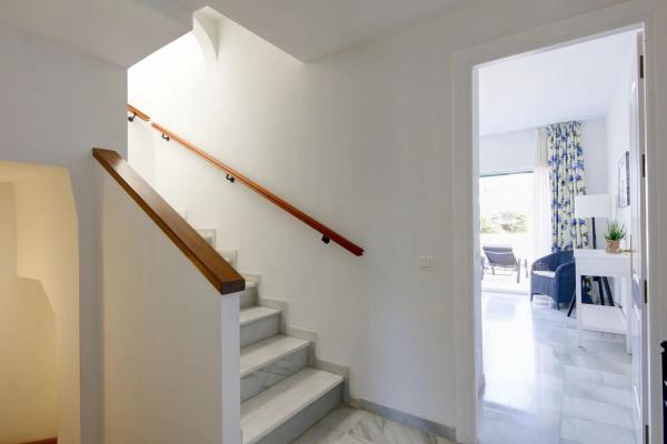 Una gran propiedad situada en uno de los complejos de playa de primera línea del centro de Estepona, Alcazaba Beach Houses es una comunidad cerrada a solo 10 minutos a pie del casco antiguo de Estepona a lo largo del paseo marítimo. La propiedad consta de una gran sala de estar y comedor de planta abierta, ambos con acceso a la cocina, un cuarto de servicio, chimenea, aseo de invitados y almacenamiento. Además, las áreas de estar de planta abierta tienen acceso directo al patio parcialmente cubierto de la planta baja y al jardín que conduce a las áreas comunes. El piso intermedio cuenta con un gran dormitorio principal con baño en suite y una terraza privada con vistas al mar; también hay otro dormitorio doble con baño en suite privado. Ambos dormitorios tienen armarios empotrados y mucho espacio de almacenamiento. En la planta superior hay una amplia terraza solárium con vistas al mar, una cocina al aire libre y mucho espacio para cenar al aire libre y tomar el sol. El complejo cuenta con 2 piscinas de estilo laguna y plantas tropicales maduras, jardines bien cuidados y acceso privado cerrado a la playa. Hay espacio de estacionamiento comunitario justo fuera de la propiedad. Alcazaba Beach está situada a poca distancia a pie de supermercados principales, transporte público y a un corto paseo de clubes de playa y bares, y un hotel de 5 estrellas. El paseo marítimo discurre a lo largo de la costa y llega al puerto deportivo de Estepona en un paseo en bicicleta de 10 minutos y al encantador casco antiguo de Estepona.