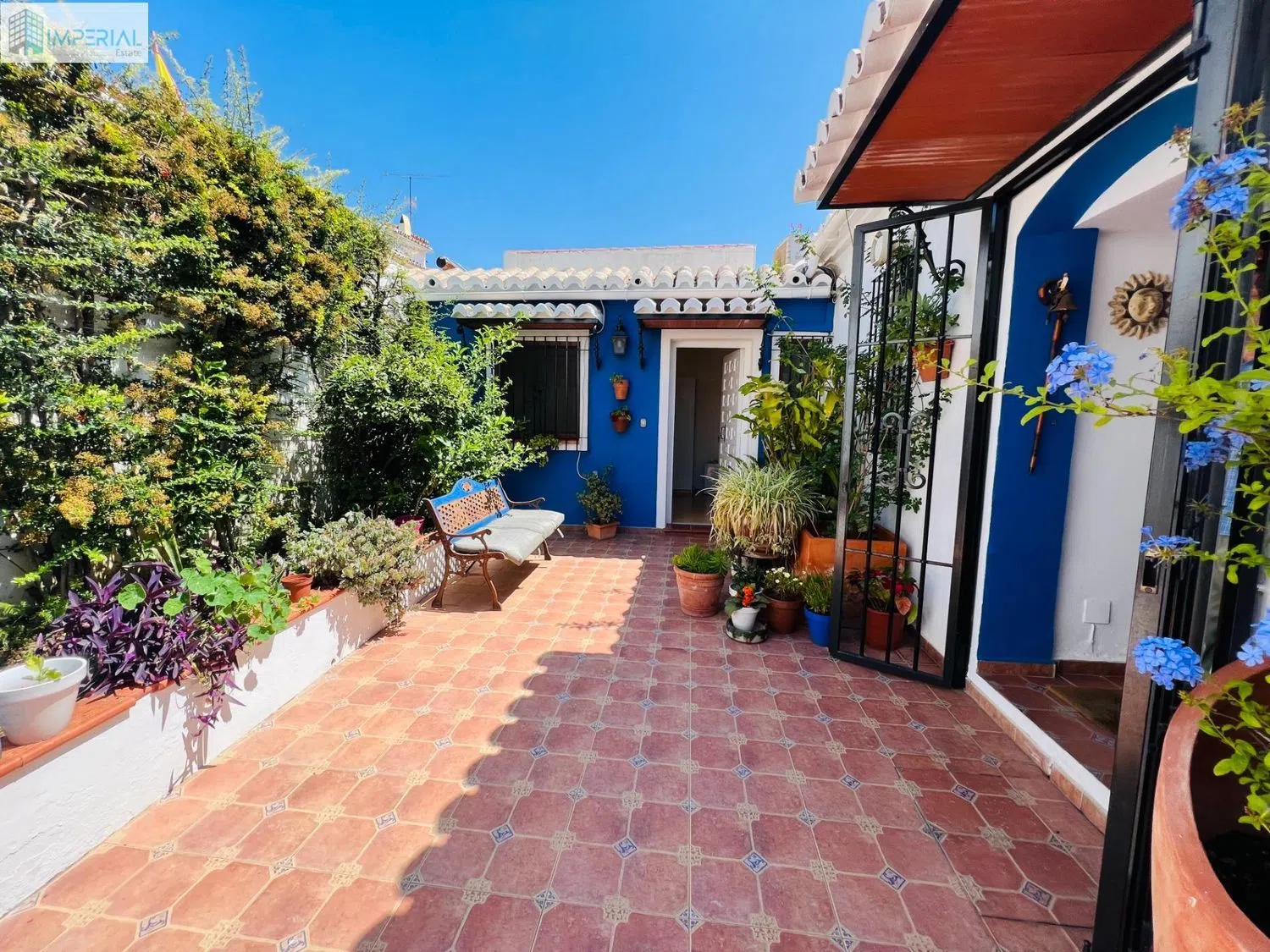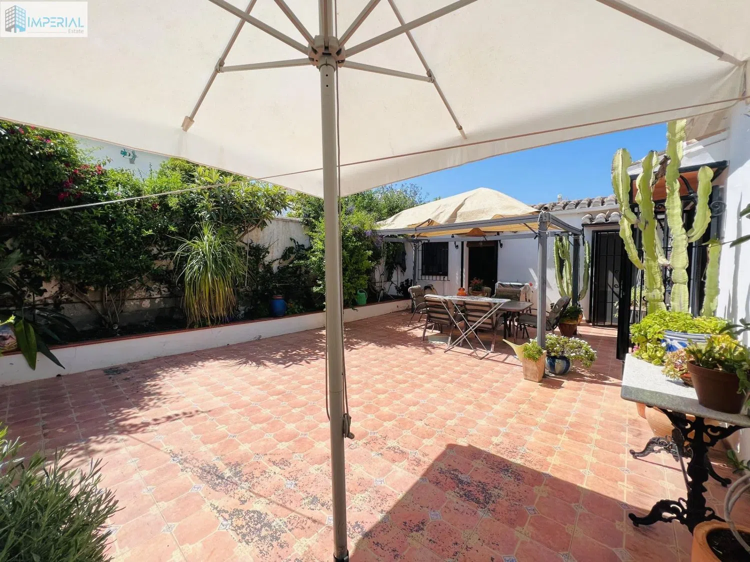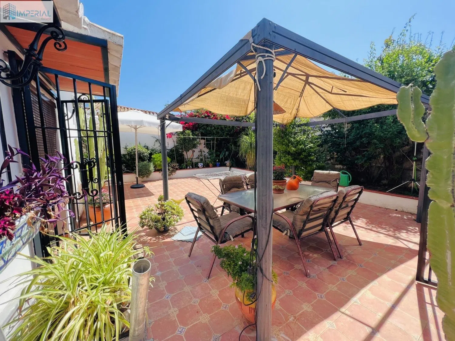 Het heeft zowel een voor- als achterpatio. Toegang via de voortuin waar zich ook een berging bevindt. Rechts de ingang naar het hoofdverblijf en recht vooruit een onafhankelijke slaapkamer met eigen badkamer die verhuurd kan worden als toeristische kamer.