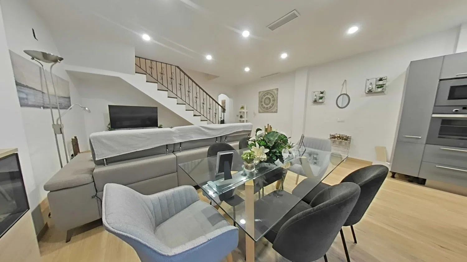 Op de begane grond vind je een royale woon- en eetkamer met een moderne Amerikaanse keuken, volledig uitgerust, en directe toegang tot een charmant privaat terras van 10 m². Hier kun je heerlijk buiten ontbijten of gewoon ontspannen.