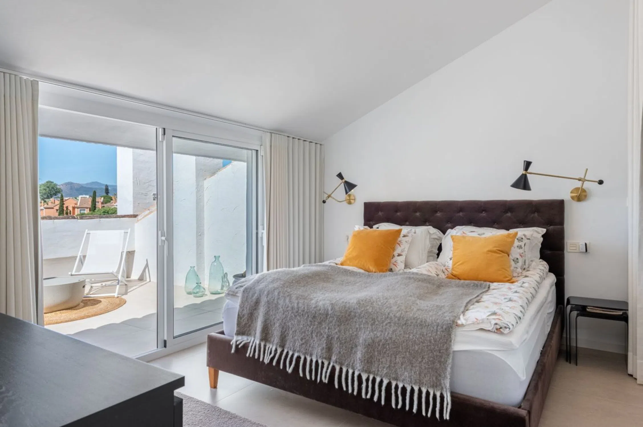 Exclusivo Ático Dúplex Reformado con Vistas Panorámicas en El Dorado – Nueva Andalucía Este ático dúplex único y completamente reformado se encuentra en el codiciado complejo El Dorado en Nueva Andalucía, a poca distancia de la playa, restaurantes y tiendas. La vivienda combina a la perfección la elegancia moderna con un diseño cuidadosamente pensado, creando una sensación de amplitud y luminosidad en cada espacio. El amplio salón con comedor recibe abundante luz natural y se abre a una gran terraza desde donde se pueden disfrutar espectaculares vistas al mar y a la montaña. La cocina, elegante y totalmente equipada, ha sido diseñada para quienes valoran el estilo y la funcionalidad en perfecta armonía. La propiedad ofrece tres dormitorios, uno en la planta de entrada y dos en la planta superior. El dormitorio principal cuenta con su propio baño privado y una impresionante terraza con vistas panorámicas sobre Nueva Andalucía y el Mediterráneo, el lugar ideal para disfrutar del sol de la tarde y despedir el día con un atardecer inolvidable. Los residentes de El Dorado disponen de una encantadora piscina comunitaria y jardines muy bien mantenidos, todo enmarcado por el auténtico carácter andaluz del complejo. También se incluye una plaza de garaje privada. El acceso al apartamento es únicamente por escaleras, ya que el edificio no dispone de ascensor. Gracias a su ubicación privilegiada, acabados de alta calidad y excelente potencial de alquiler, este ático es una opción perfecta tanto como residencia permanente, vivienda vacacional o inversión inteligente. Más que una propiedad, representa un verdadero estilo de vida en la Costa del Sol.