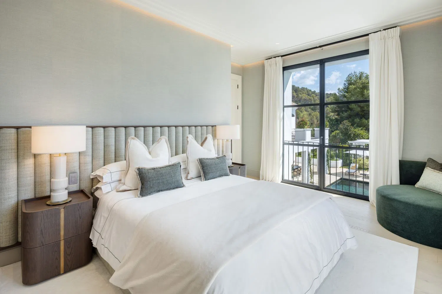 De tijdloze elegantie doordringt alle binnenruimtes, met op maat gemaakte meubels en verfijnde decoraties. Bovenliggende terrassen bieden naadloos binnen- en buitenleven, met overvloedige ramen die natuurlijk licht de binnenruimtes binnen laten stromingen.