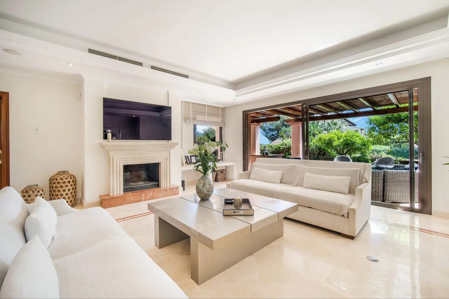 De woning beschikt over vier ruime slaapkamers en vijf goed uitgeruste badkamers, waaronder twee en-suite badkamers, allemaal ontworpen om maximaal comfort en gemak te bieden. Het interieur is perfect onderhouden en verkeert in uitstekende staat, met hoogwaardige afwerkingen. Onder de vele kenmerken bevinden zich airconditioning, vloerverwarming in de badkamers, elektrische rolluiken en dubbele beglazing, waardoor een comfortabele leefomgeving het hele jaar door is verzekerd. Een open haard voegt een vleugje warmte en elegantie toe aan de ruime woonkamer, die uitkomt op een privéterras met panoramisch uitzicht.