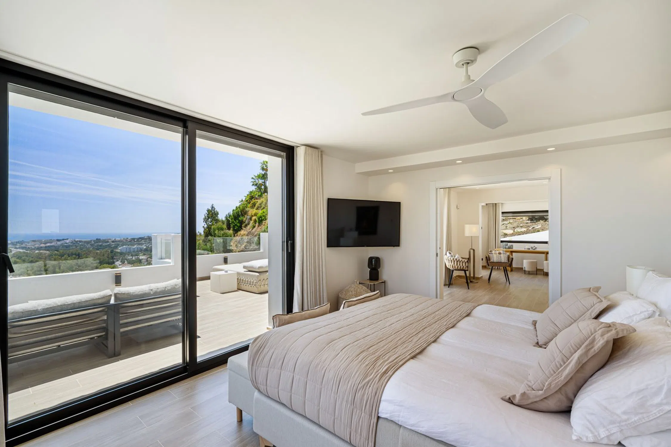 Bienvenido a Villa Luma, una residencia mediterránea bellamente reinventada, situada en el prestigioso enclave de Las Lomas de Nueva Andalucía. Orientada al sur y bañada por la luz natural, esta casa ofrece algunas de las vistas al mar más impresionantes de toda la zona de Nueva Andalucía. Distribuida en tres niveles, la vivienda cuenta con cinco dormitorios, uno de ellos actualmente utilizado como oficina, y está diseñada para combinar una elegante vida interior con un disfrute exterior amplio y cómodo. El interior de la villa se define por tonos neutros suaves, materiales de alta calidad y espacios generosos. El corazón del hogar es una zona de estar de concepto abierto, conectada perfectamente con una cocina moderna y estilizada, y un comedor formal, todo ello con acceso a amplias terrazas ideales para recibir invitados o simplemente disfrutar de las vistas. La suite principal ocupa la planta superior, ofreciendo una privacidad total junto con un vestidor espacioso y vistas serenas al mar Mediterráneo. La planta baja incluye una acogedora sala de estar ideal como zona de entretenimiento o sala de televisión. En el exterior, Villa Luma destaca por su jardinería meticulosamente cuidada, múltiples zonas de descanso y una espectacular piscina infinita que se fusiona visualmente con el horizonte. Aunque no dispone de garaje ni ascensor, la propiedad ofrece espacio para aparcar cómodamente hasta cuatro coches dentro del área cerrada, además de espacio adicional para tres vehículos más justo fuera de la entrada superior. Con su orientación inmejorable, estilo refinado y raras vistas costeras, Villa Luma representa una oportunidad única de adquirir una vivienda lista para entrar a vivir en una de las direcciones más codiciadas de Marbella.