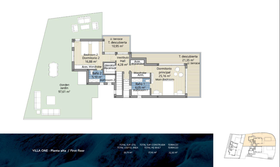 - Planta alta con privacidad para todos: Dos dormitorios adicionales, cada uno con su propio baño, ofrecen un refugio ideal para familia o invitados. Desde aquí se accede a una amplia terraza perfecta para desconectar, leer o simplemente contemplar el entorno.